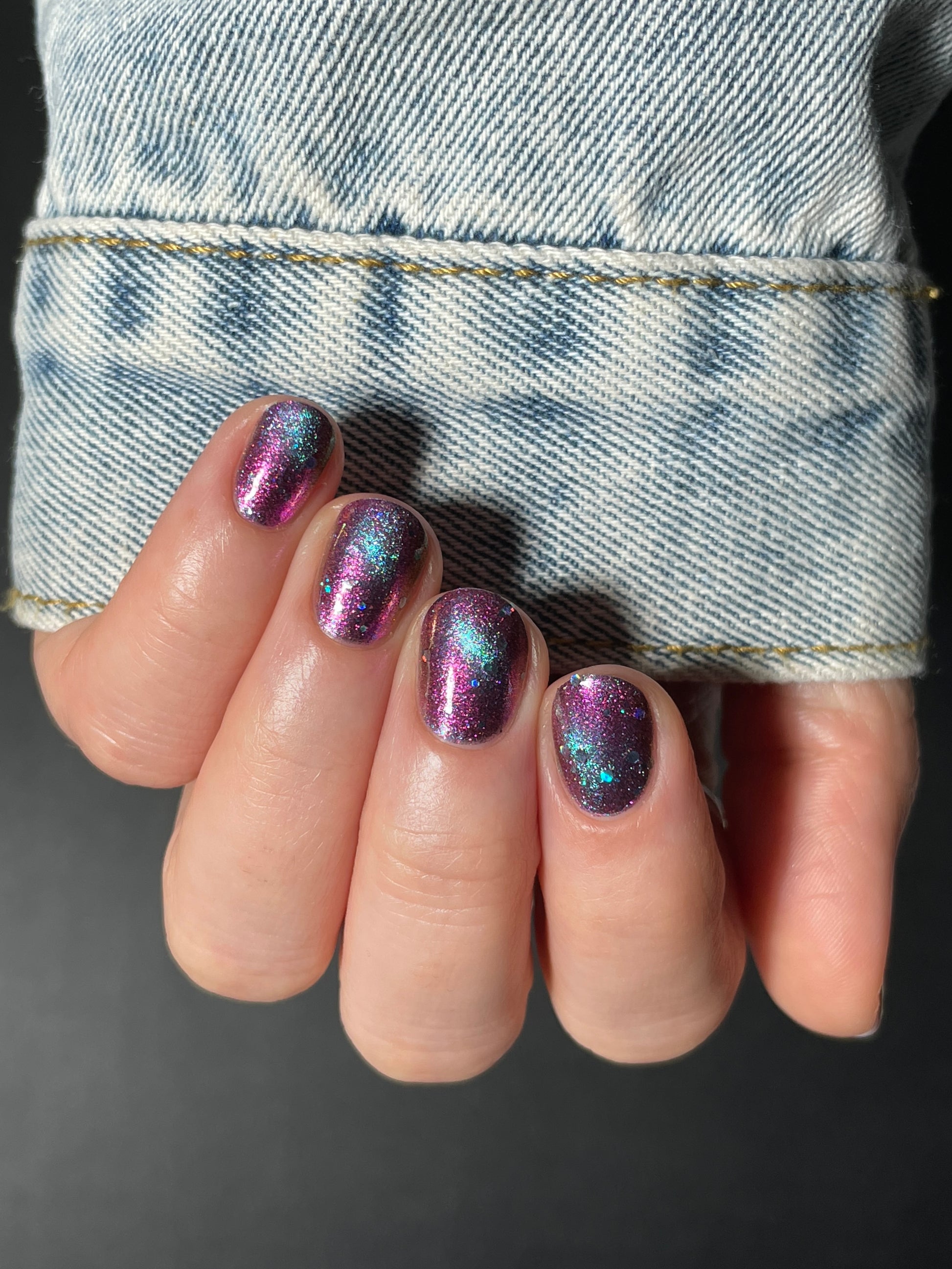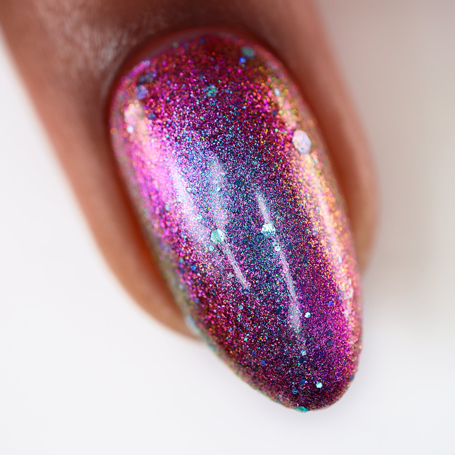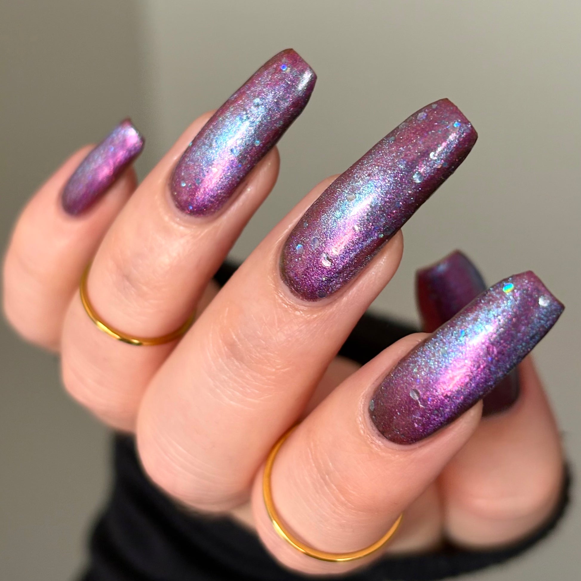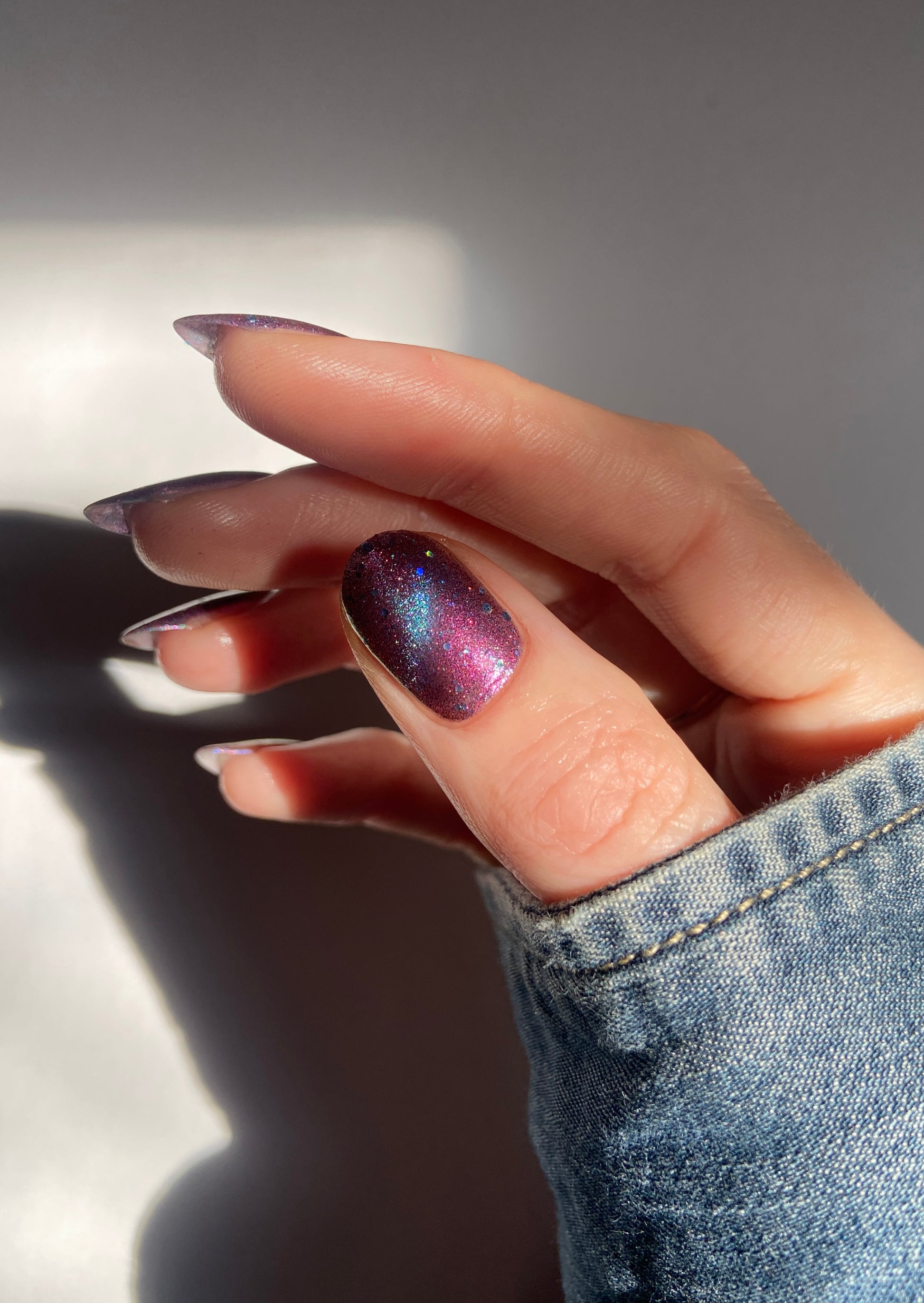Purple Party Monster is the life of the nail party. This rich purple shade is packed with blue magnetic pigments, bursts of holo and purple shimmer, and a playful scatter of blue different size hex glitters like confetti caught in a disco ball’s glow. Inspired by wild nights, too much sugar, and dancing like nobody’s watching, this polish is your ultimate throwback to carefree chaos and staying up way past your bedtime. Let your nails relive the party.