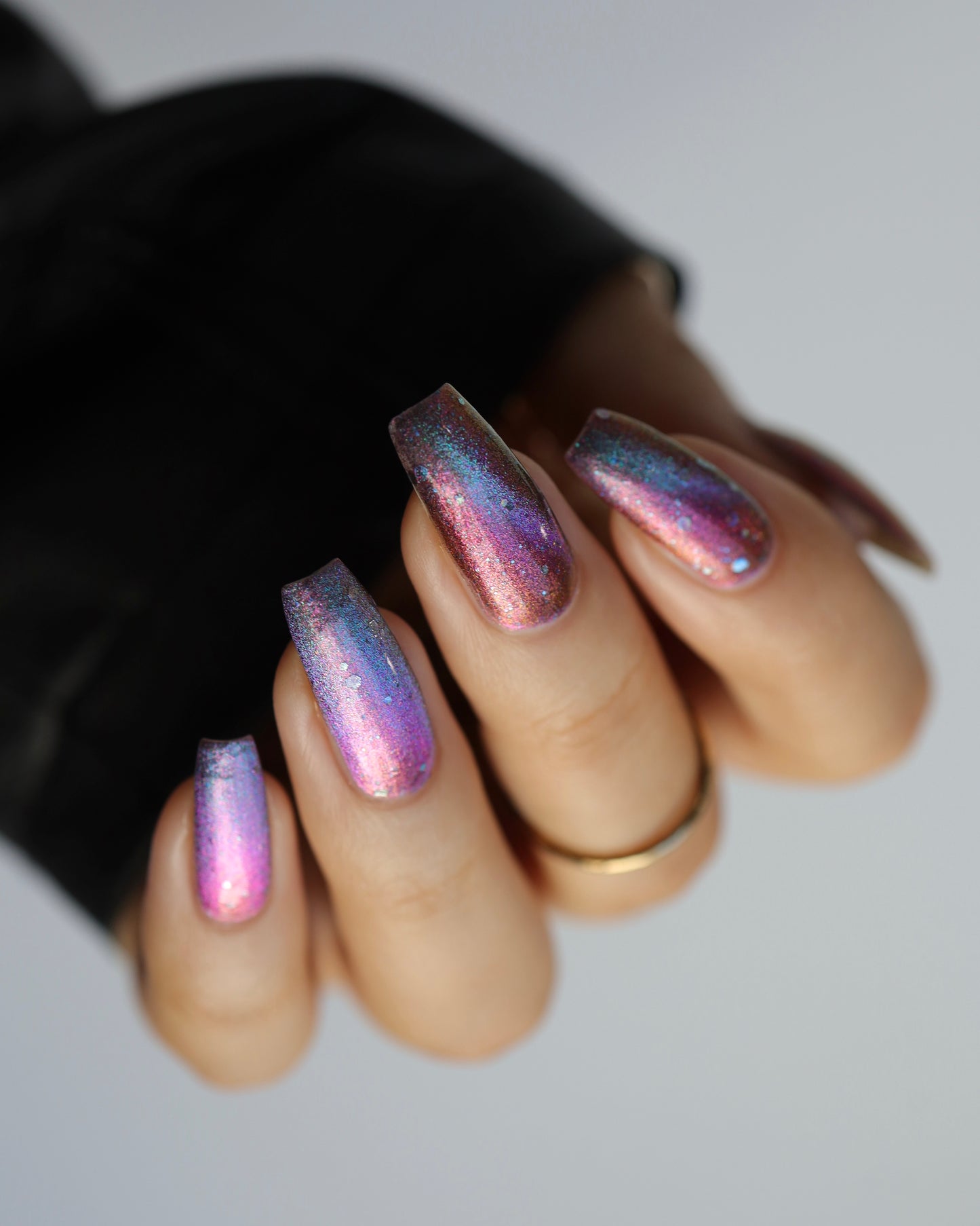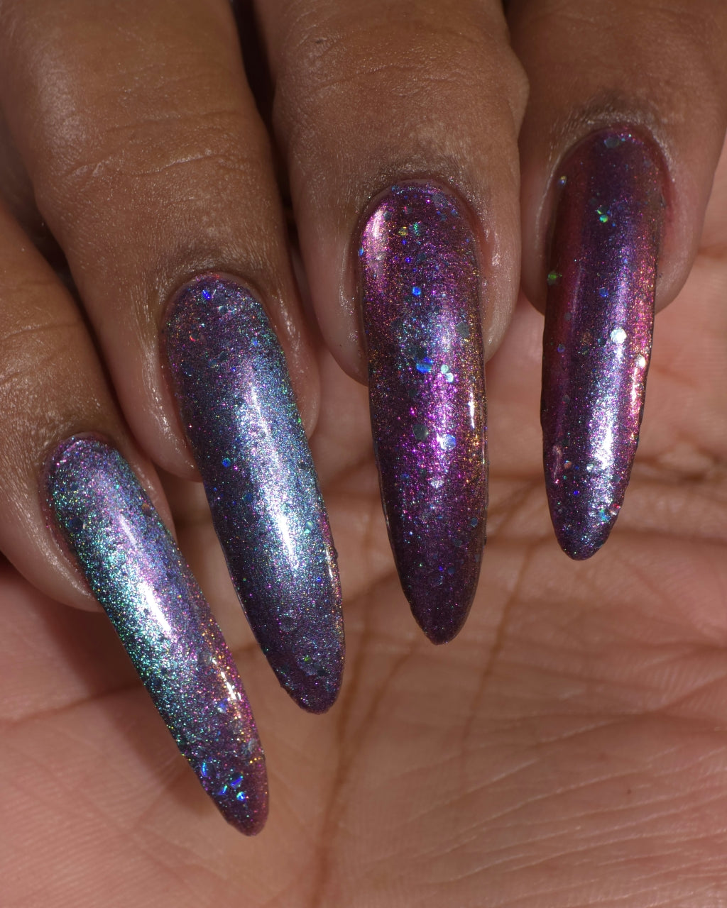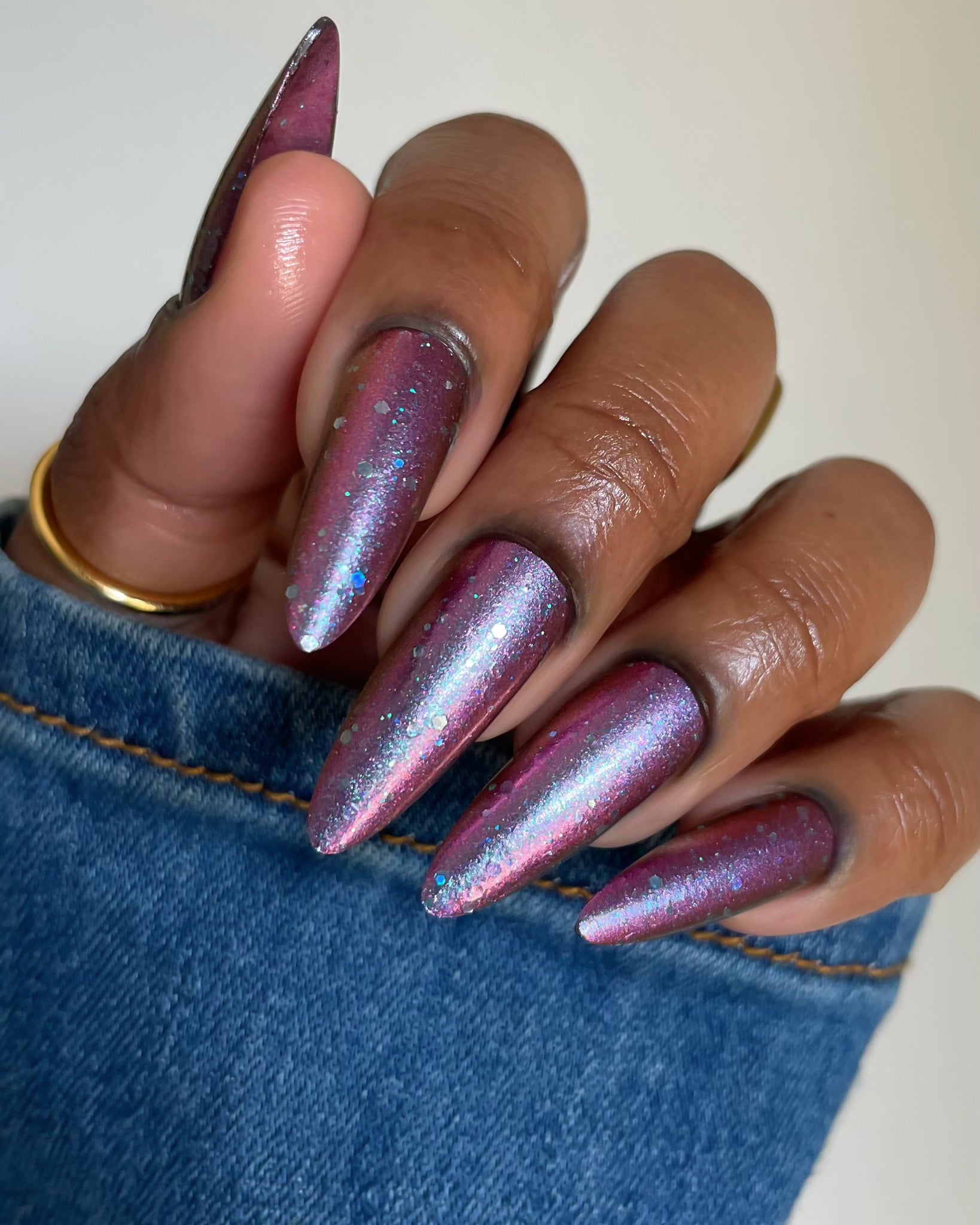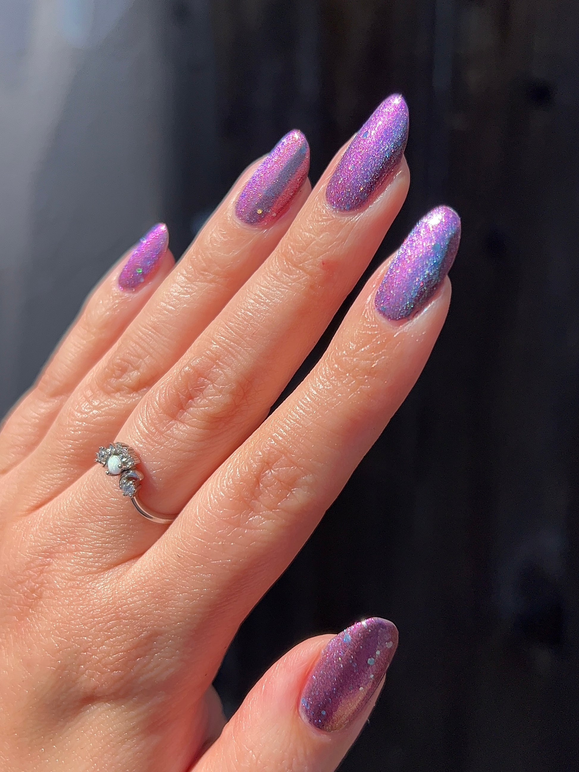 Purple Party Monster is the life of the nail party. This rich purple shade is packed with blue magnetic pigments, bursts of holo and purple shimmer, and a playful scatter of blue different size hex glitters like confetti caught in a disco ball’s glow. Inspired by wild nights, too much sugar, and dancing like nobody’s watching, this polish is your ultimate throwback to carefree chaos and staying up way past your bedtime. Let your nails relive the party.