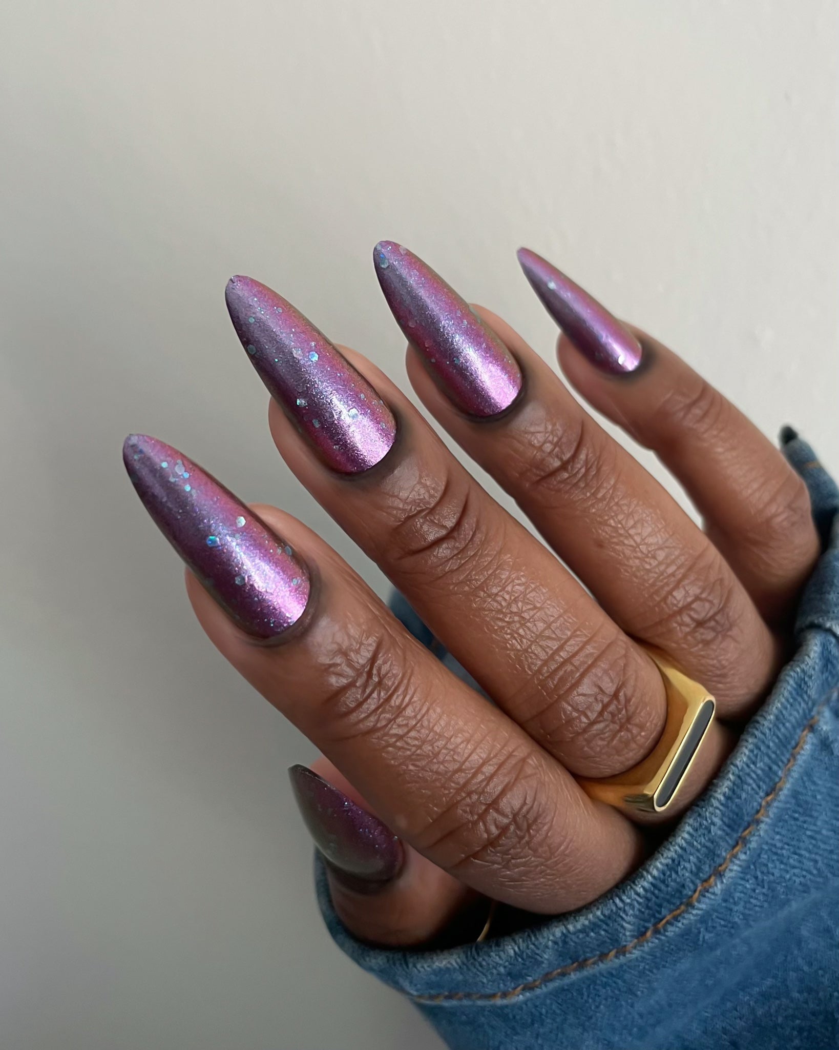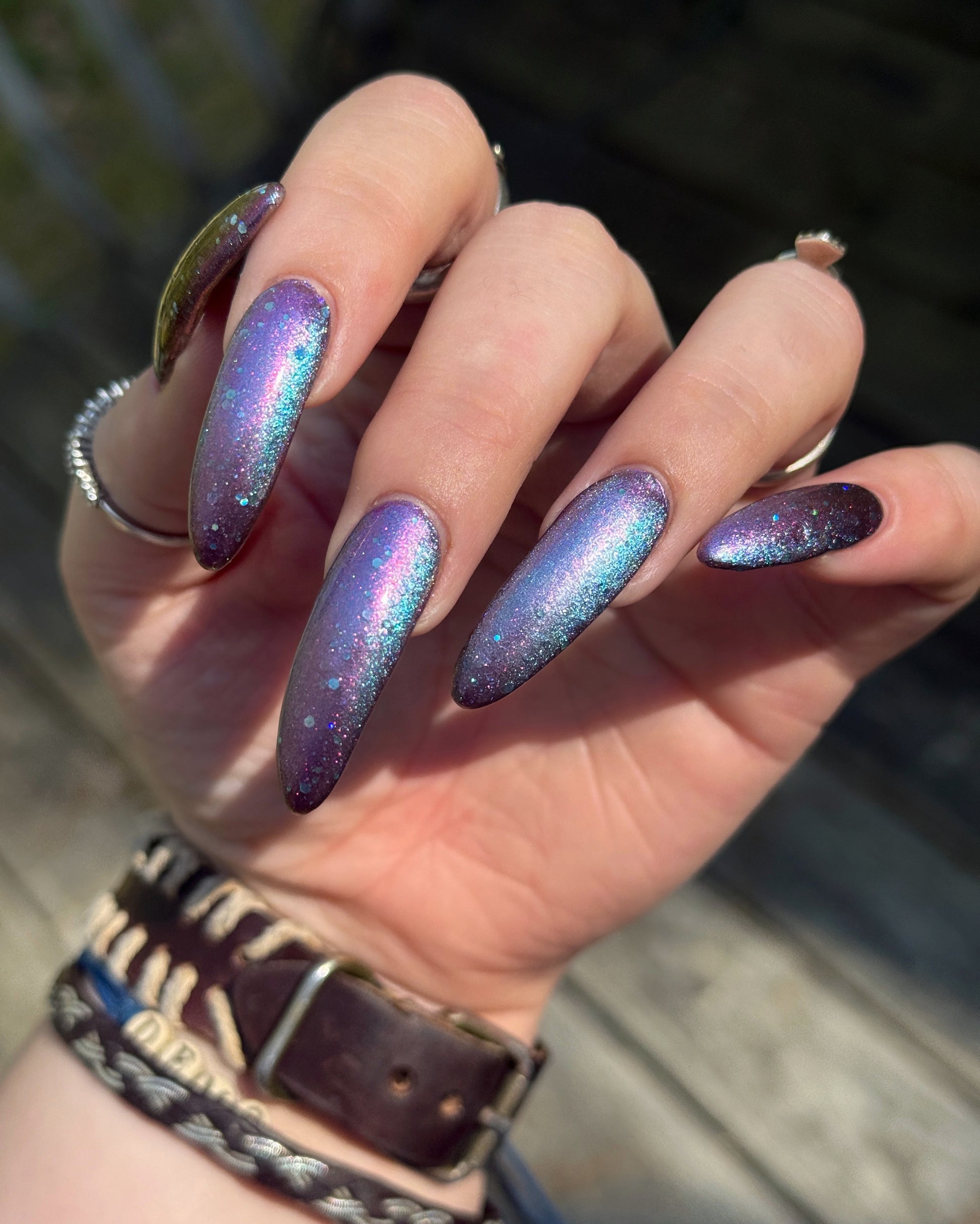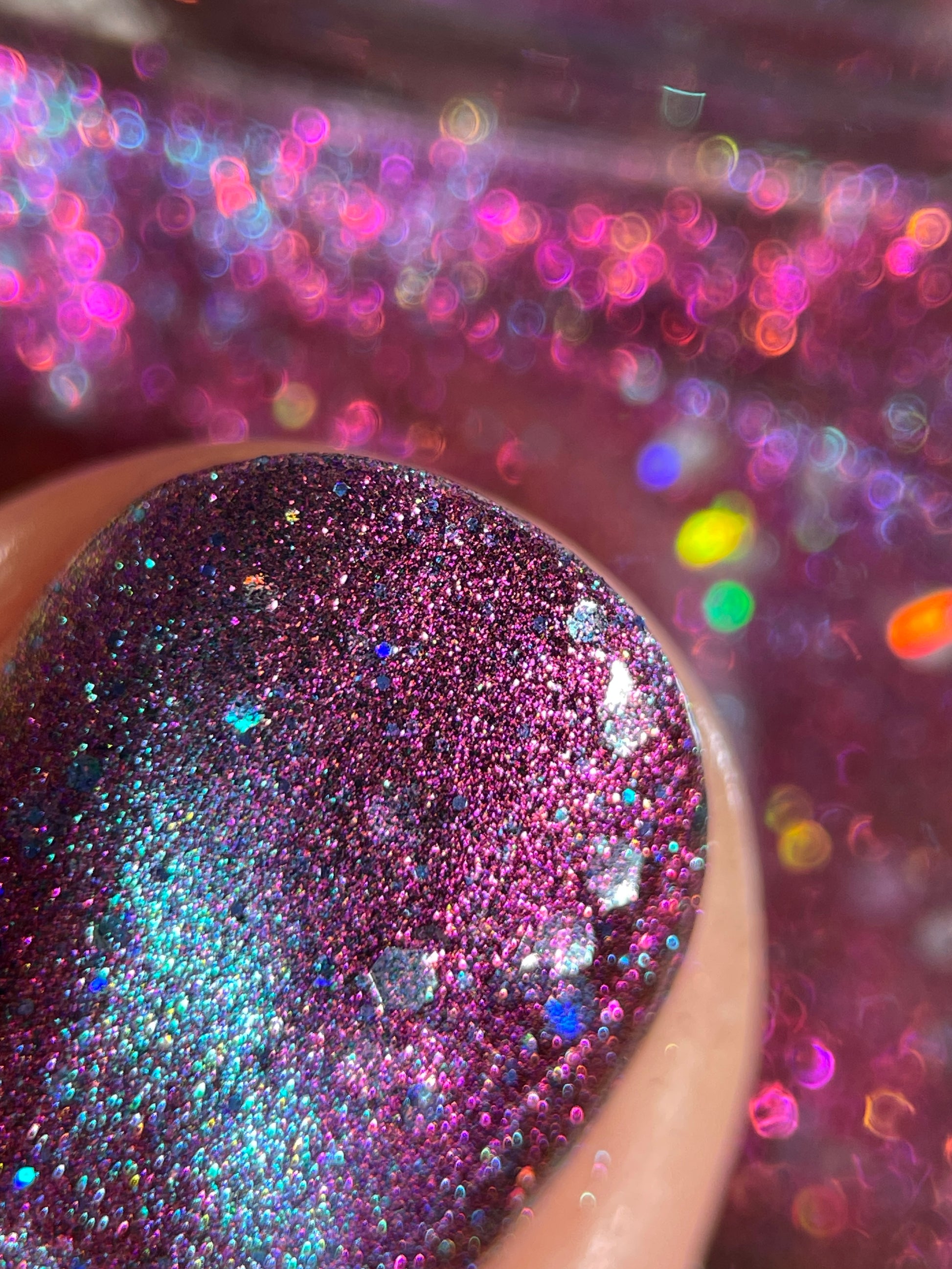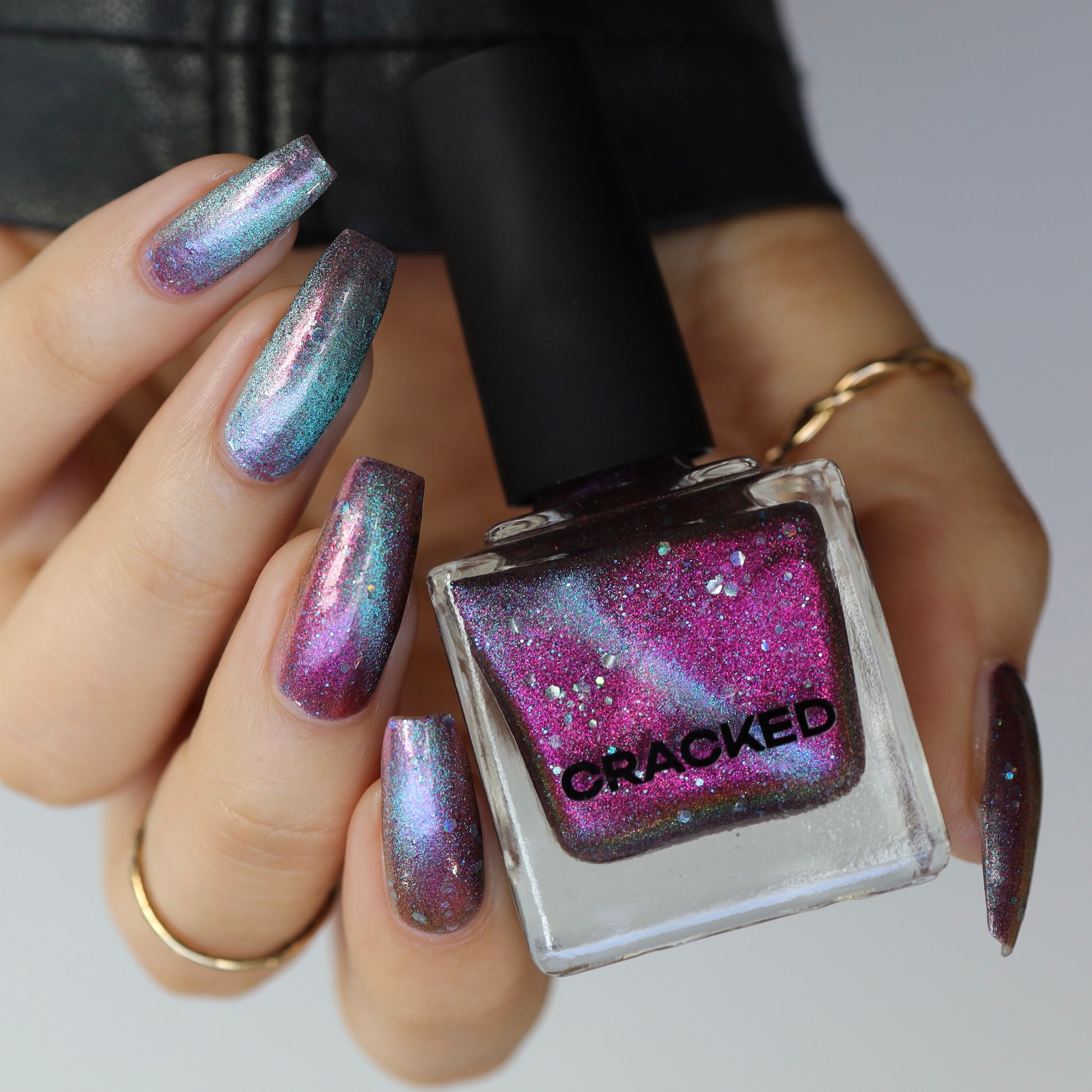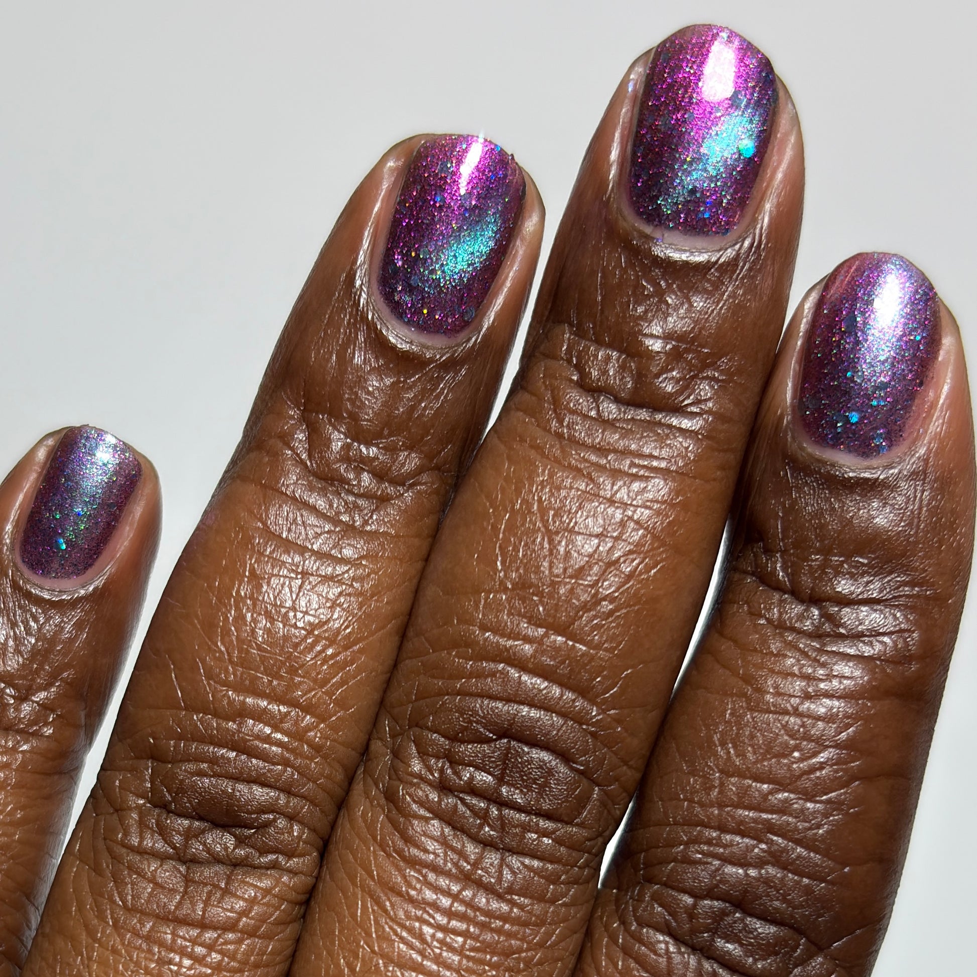 Purple Party Monster is the life of the nail party. This rich purple shade is packed with blue magnetic pigments, bursts of holo and purple shimmer, and a playful scatter of blue different size hex glitters like confetti caught in a disco ball’s glow. Inspired by wild nights, too much sugar, and dancing like nobody’s watching, this polish is your ultimate throwback to carefree chaos and staying up way past your bedtime. Let your nails relive the party.