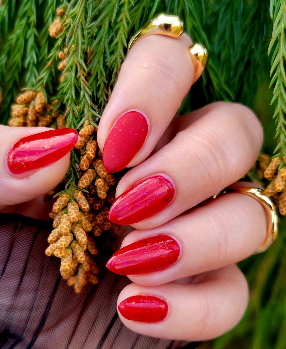 Sound the alarms Red Planet Panic has landed, and it's out of this world stunning! This warm red jelly polish is packed with multichrome flakes that shift like a UFO in the night sky, flashing hints of green, gold, and magenta. It’s chaos, it’s beauty, it’s a red lover’s dream come true.