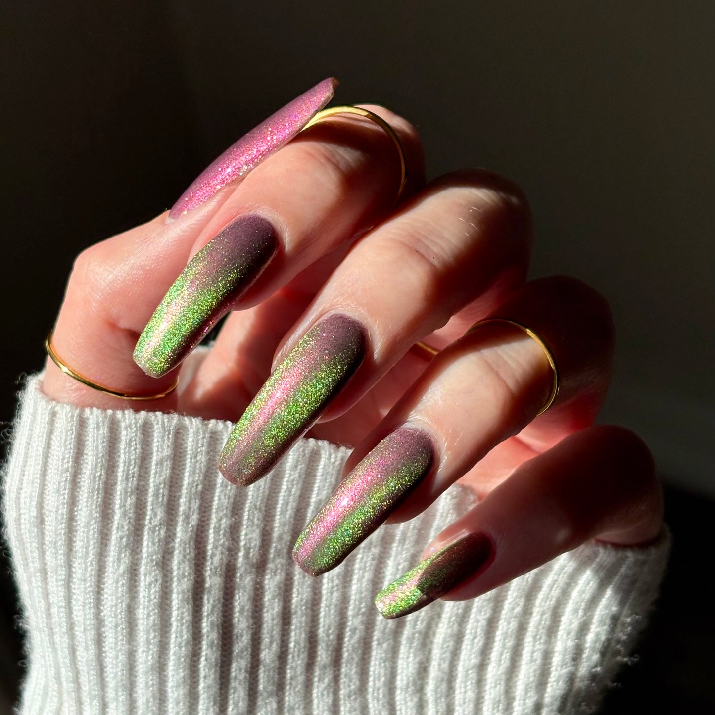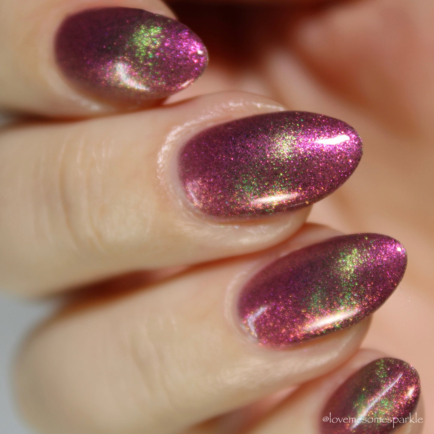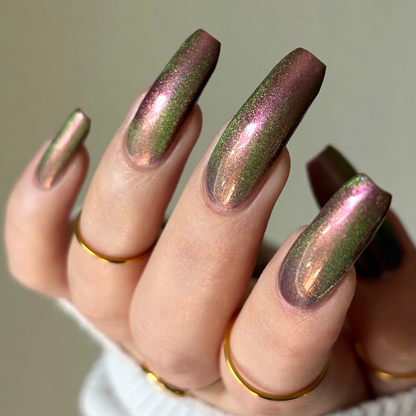 Get lost in the magic of distraction with Restless Wonder – a glowing pink polish that pulls you into a dream of vibrant wildflowers scattered along a forest path. Mesmerizing green magnetic pigments ripple through the base like leaves caught in a sunbeam, shifting and shimmering as you move. It’s the moment you pause to appreciate something beautiful, forgetting where you were going but not caring one bit.