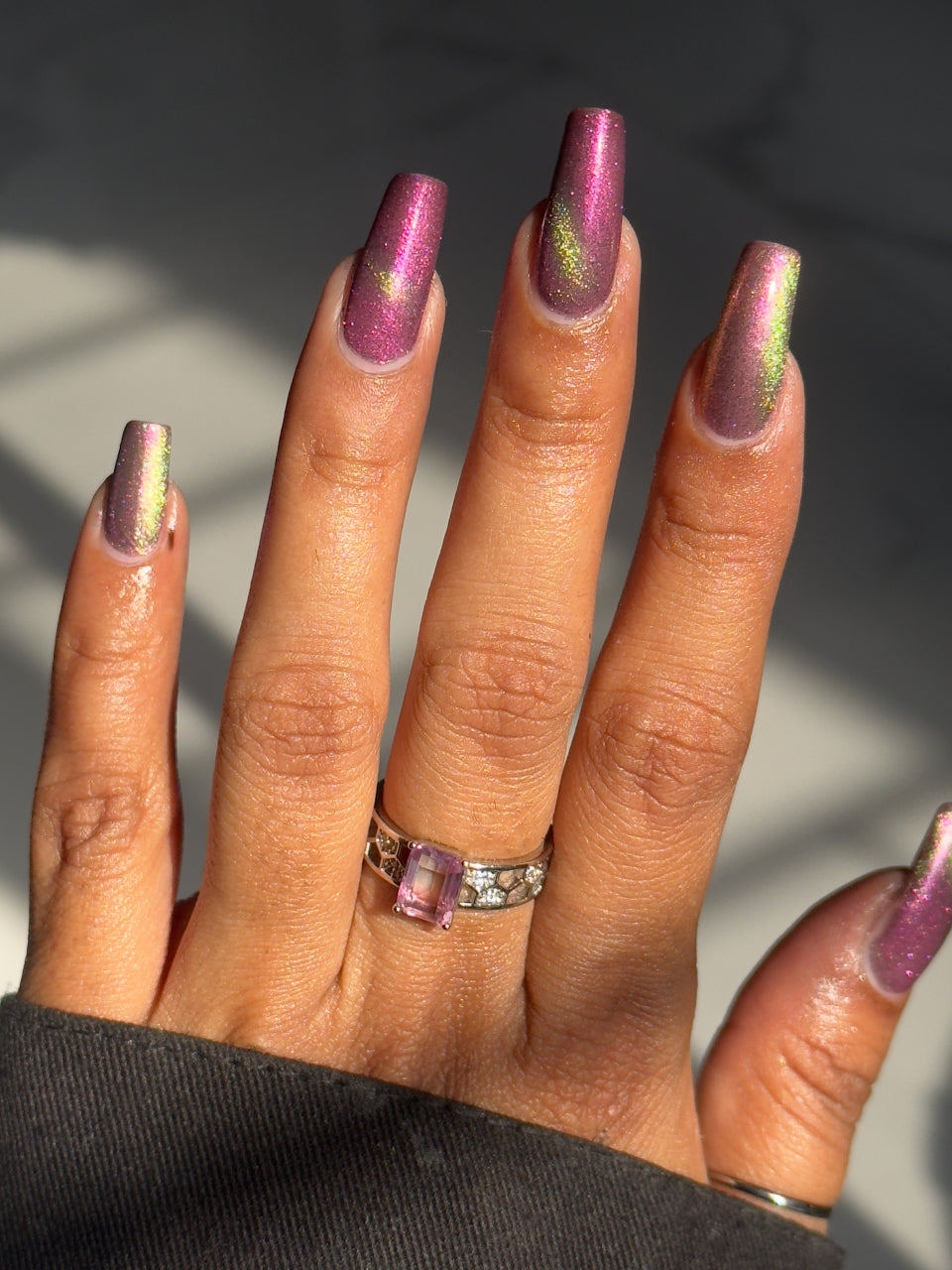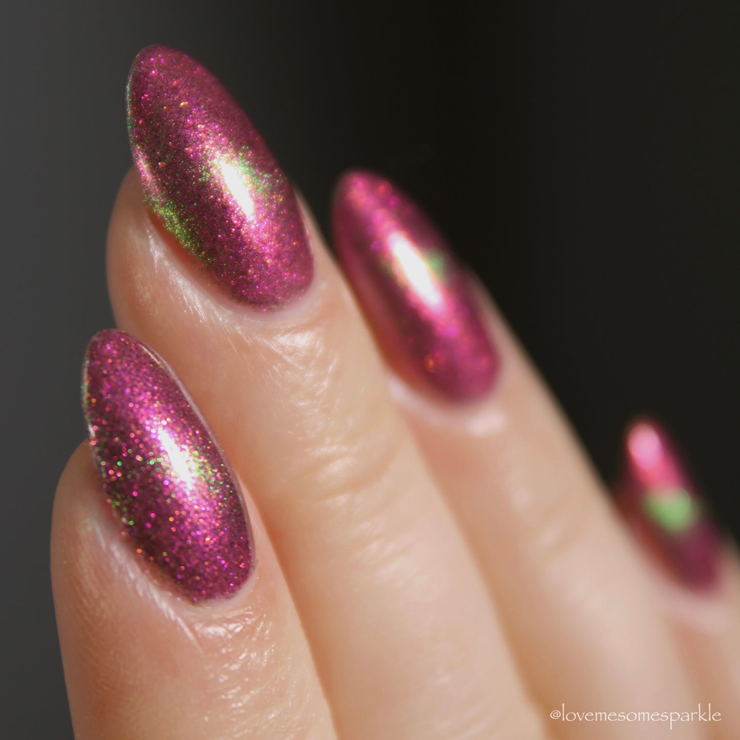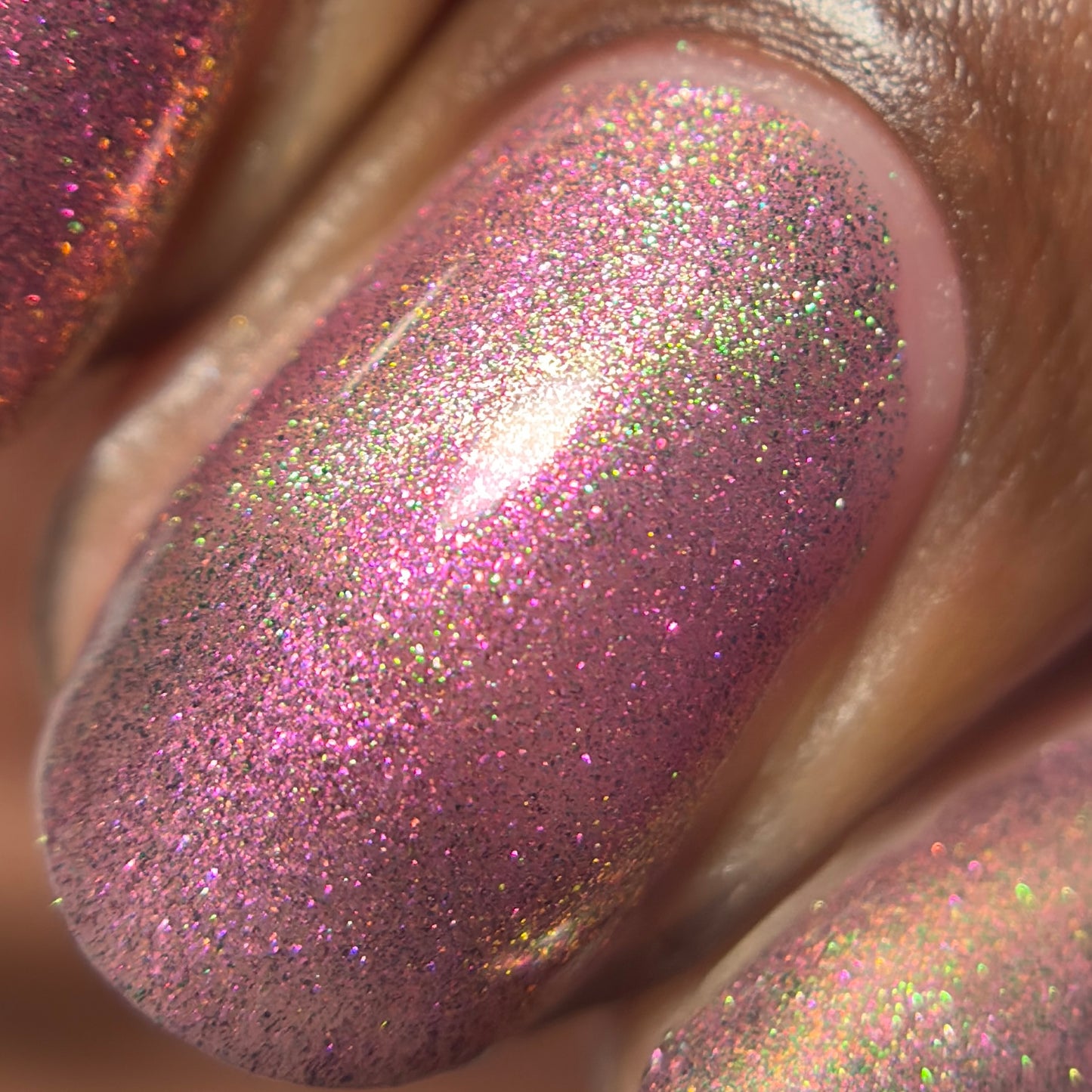 Get lost in the magic of distraction with Restless Wonder – a glowing pink polish that pulls you into a dream of vibrant wildflowers scattered along a forest path. Mesmerizing green magnetic pigments ripple through the base like leaves caught in a sunbeam, shifting and shimmering as you move. It’s the moment you pause to appreciate something beautiful, forgetting where you were going but not caring one bit.