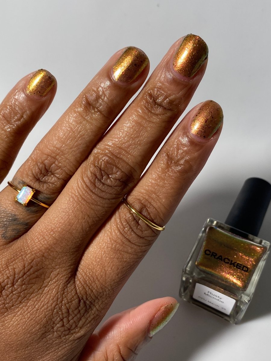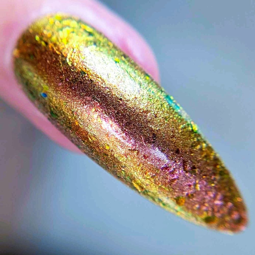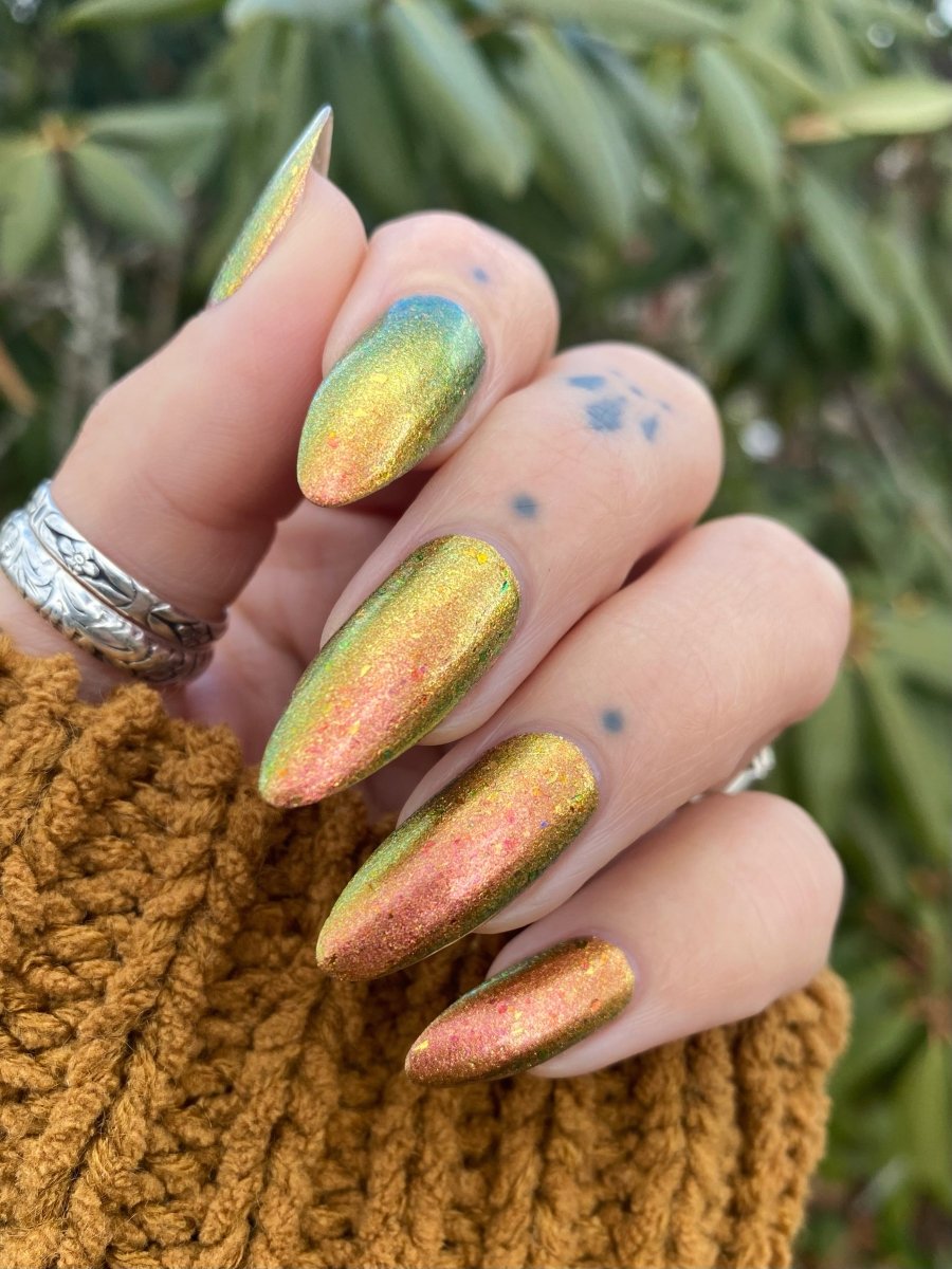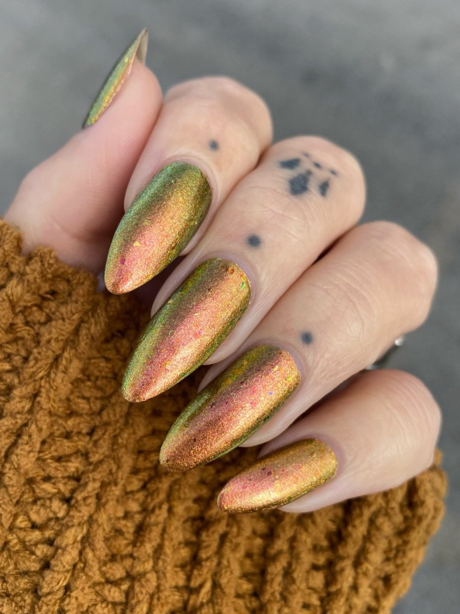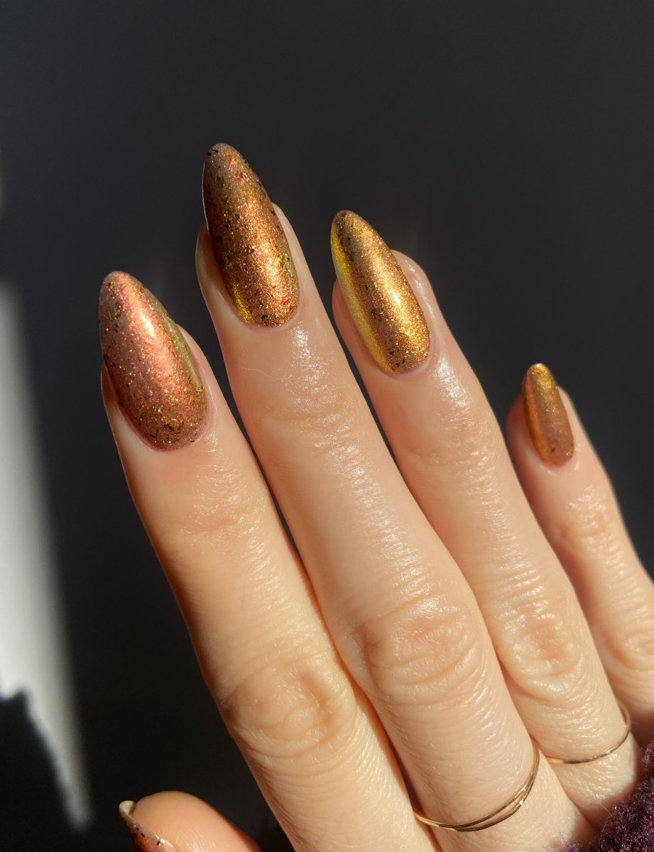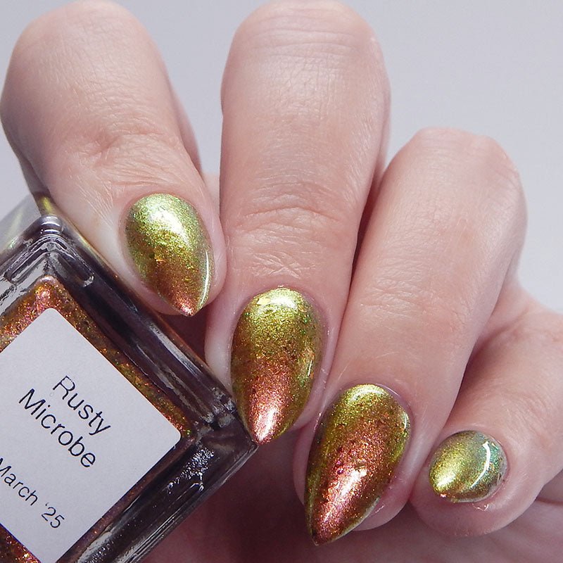 Rusty Microbe is a unique, metallic rusty copper shade that shifts from green to gold, accented with a delicate dusting of red/green/gold shifting flakes. This polish is a true chameleon, transforming dramatically from indoor to outdoor lighting. But when the sunlight hits it? Pure magic. This is unlike anything in our lineup, and stepping outside our comfort zone has paid off in the most spectacular way. Don’t miss your chance to grab this one-of-a-kind beauty