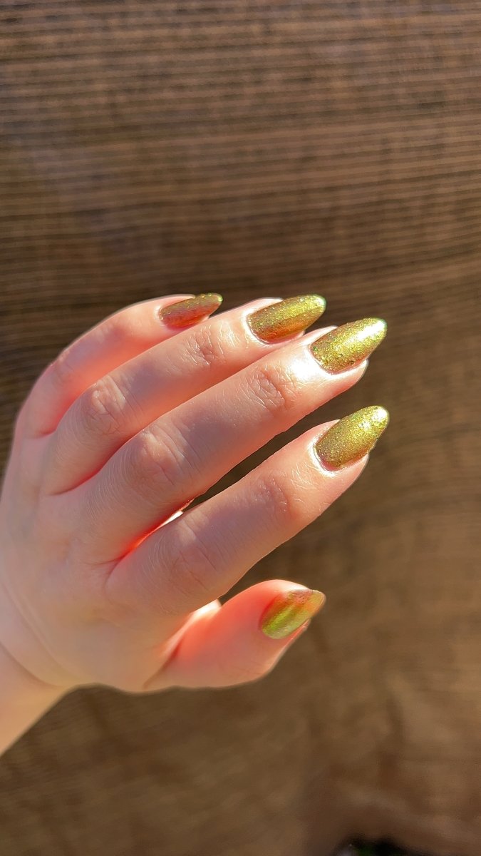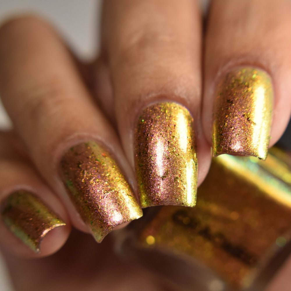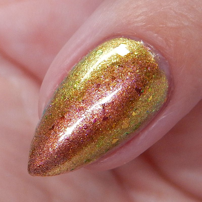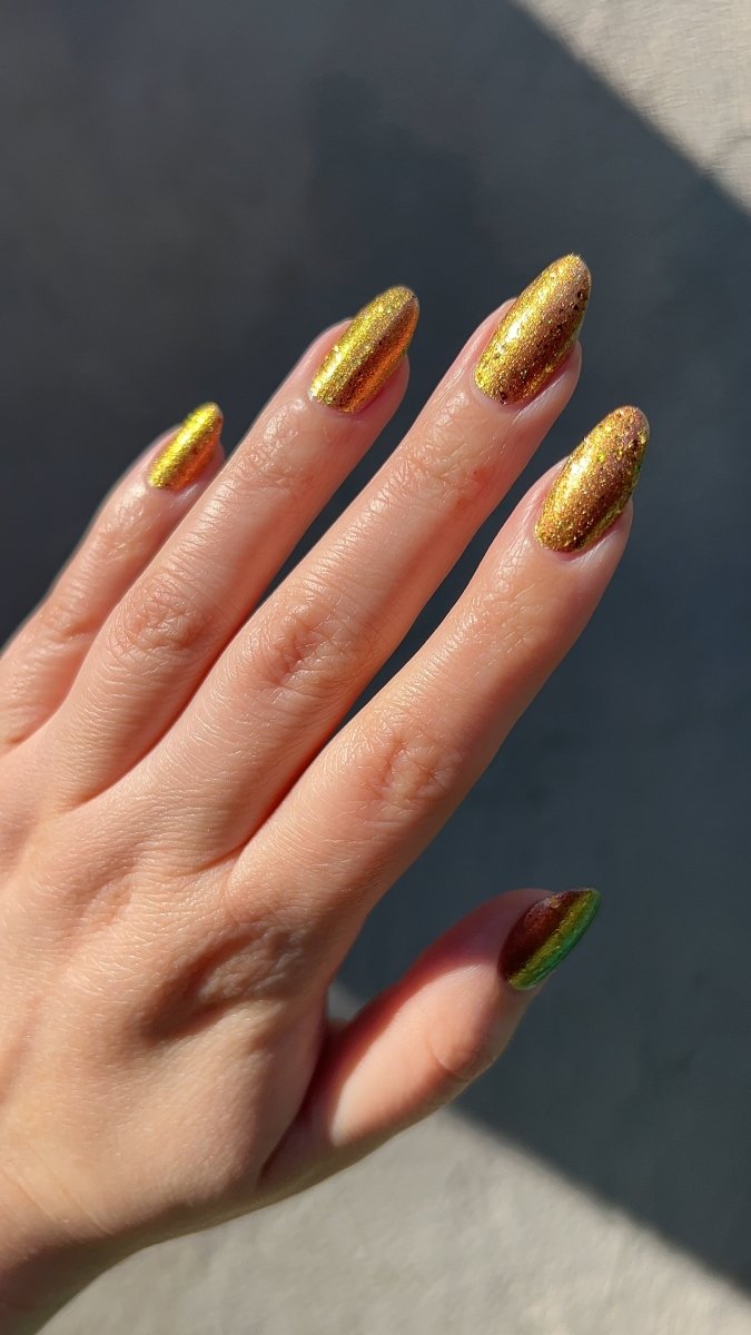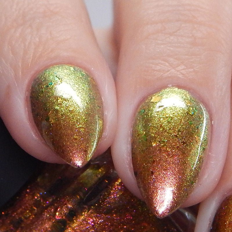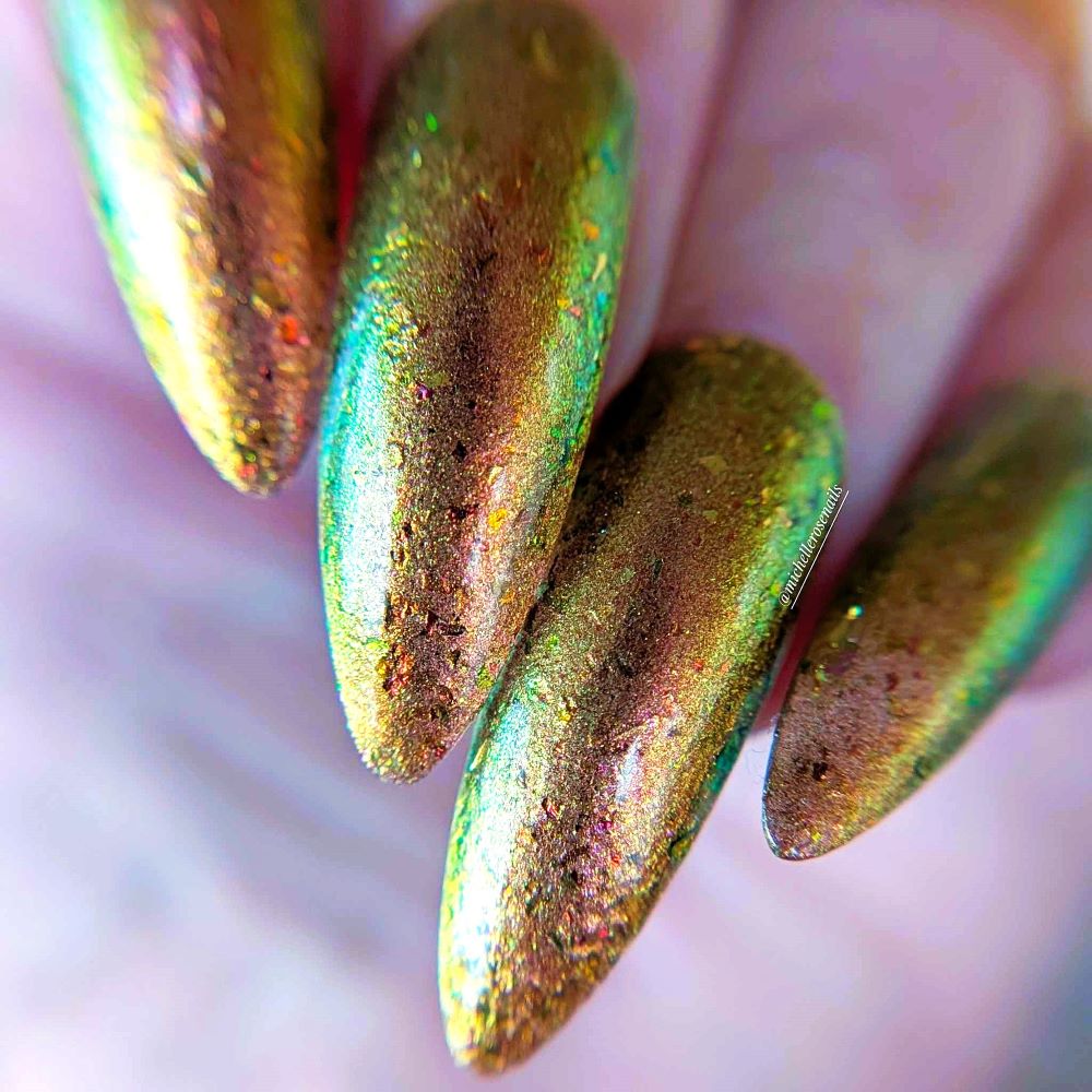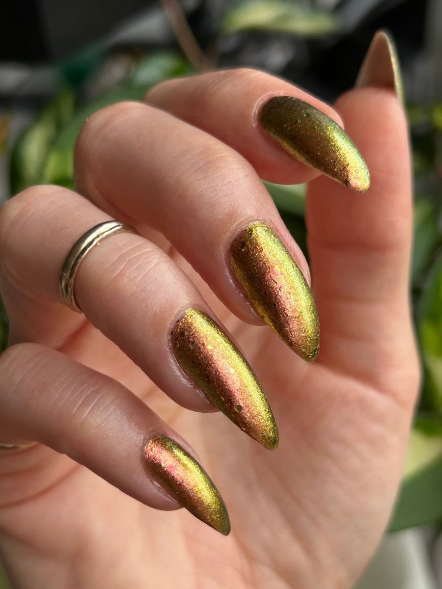 Rusty Microbe is a unique, metallic rusty copper shade that shifts from green to gold, accented with a delicate dusting of red/green/gold shifting flakes. This polish is a true chameleon, transforming dramatically from indoor to outdoor lighting. But when the sunlight hits it? Pure magic. This is unlike anything in our lineup, and stepping outside our comfort zone has paid off in the most spectacular way. Don’t miss your chance to grab this one-of-a-kind beauty