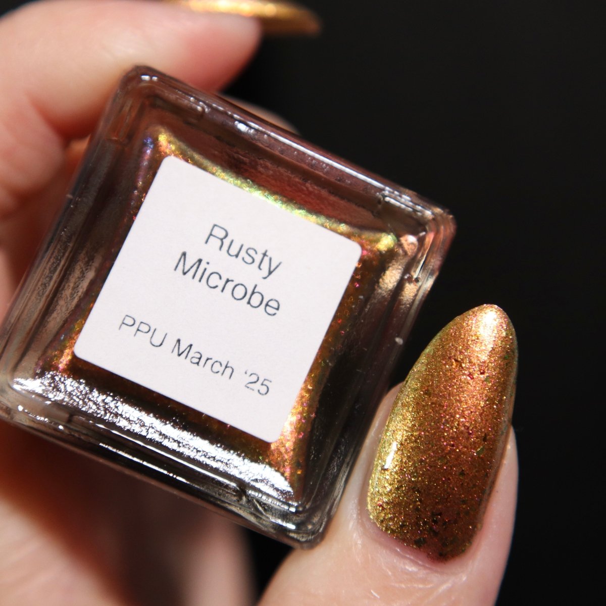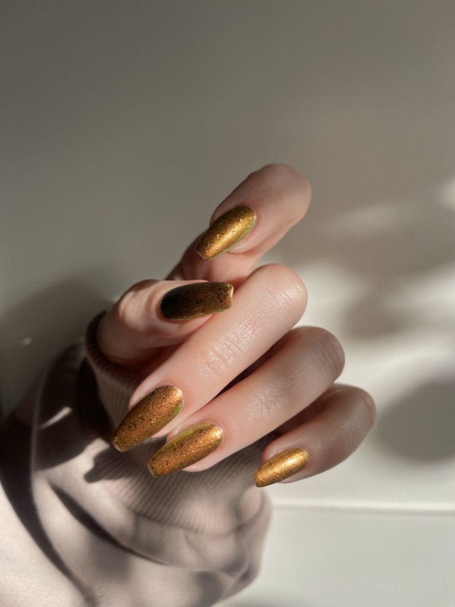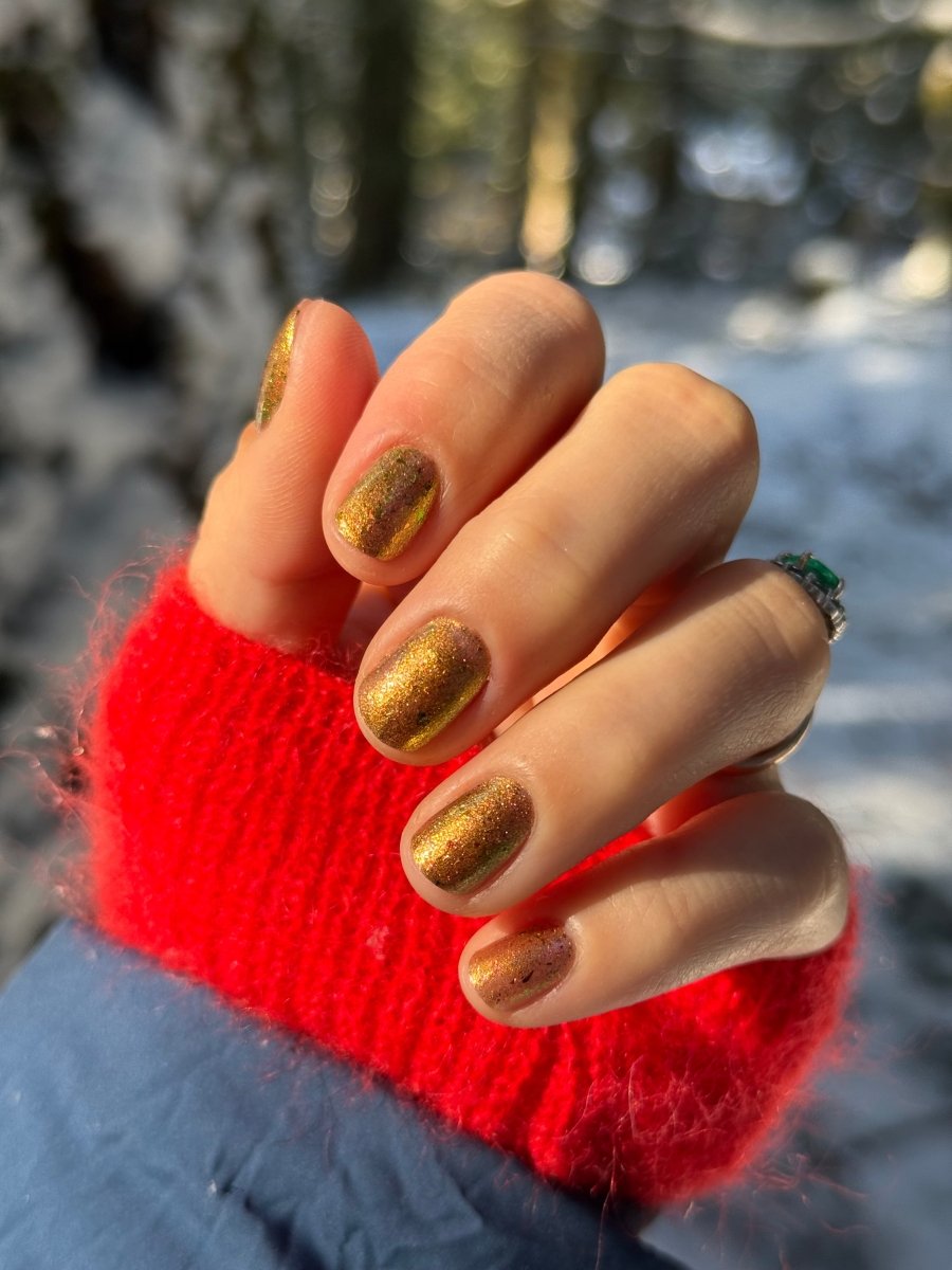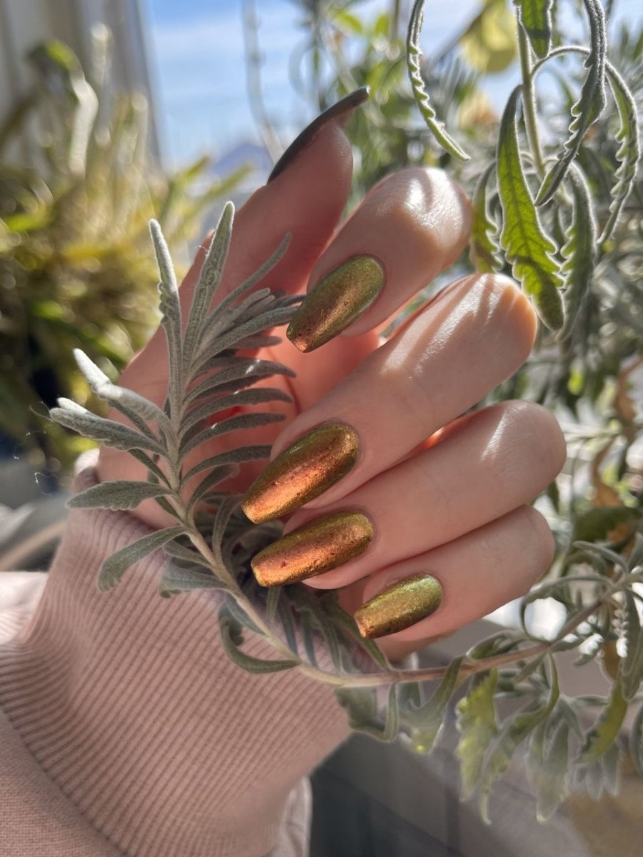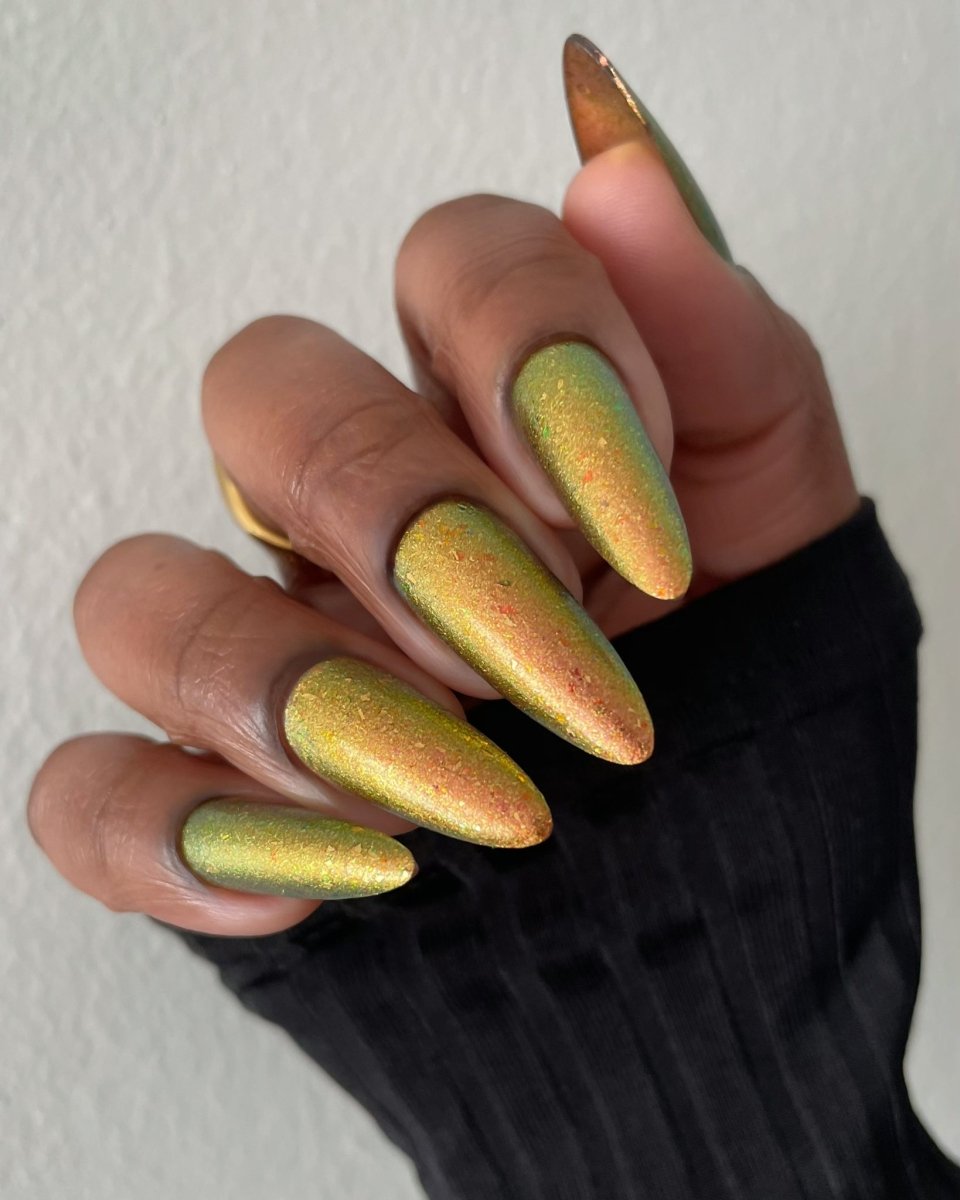 Rusty Microbe is a unique, metallic rusty copper shade that shifts from green to gold, accented with a delicate dusting of red/green/gold shifting flakes. This polish is a true chameleon, transforming dramatically from indoor to outdoor lighting. But when the sunlight hits it? Pure magic. This is unlike anything in our lineup, and stepping outside our comfort zone has paid off in the most spectacular way. Don’t miss your chance to grab this one-of-a-kind beauty