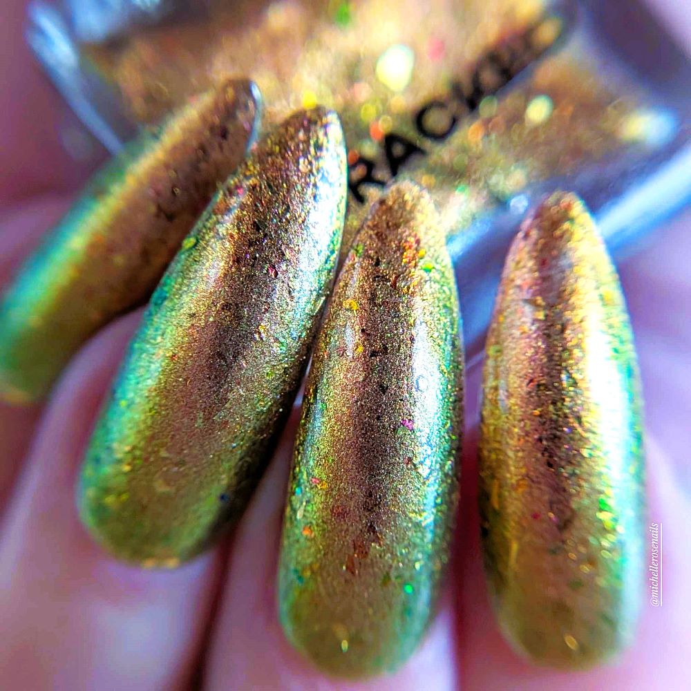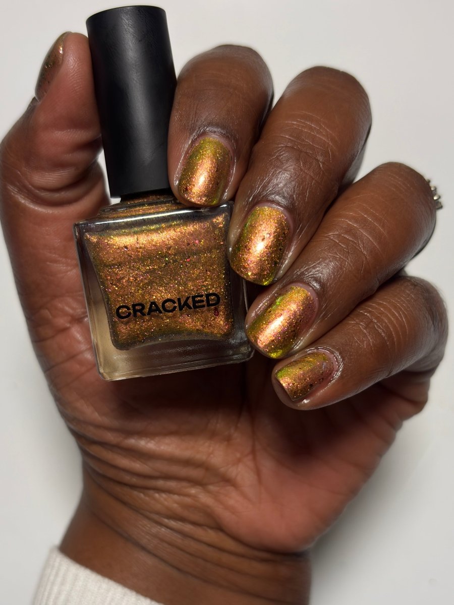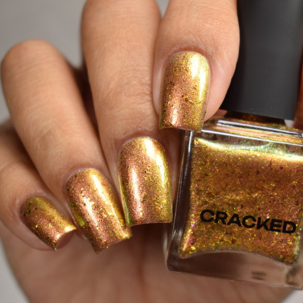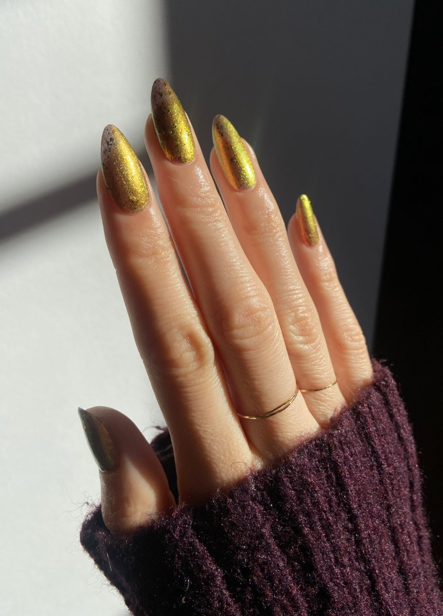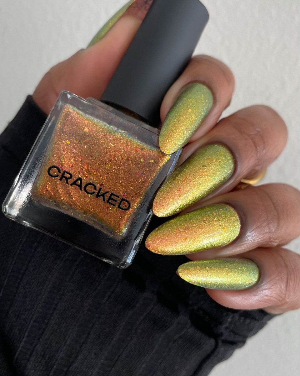 Rusty Microbe is a unique, metallic rusty copper shade that shifts from green to gold, accented with a delicate dusting of red/green/gold shifting flakes. This polish is a true chameleon, transforming dramatically from indoor to outdoor lighting. But when the sunlight hits it? Pure magic. This is unlike anything in our lineup, and stepping outside our comfort zone has paid off in the most spectacular way. Don’t miss your chance to grab this one-of-a-kind beauty