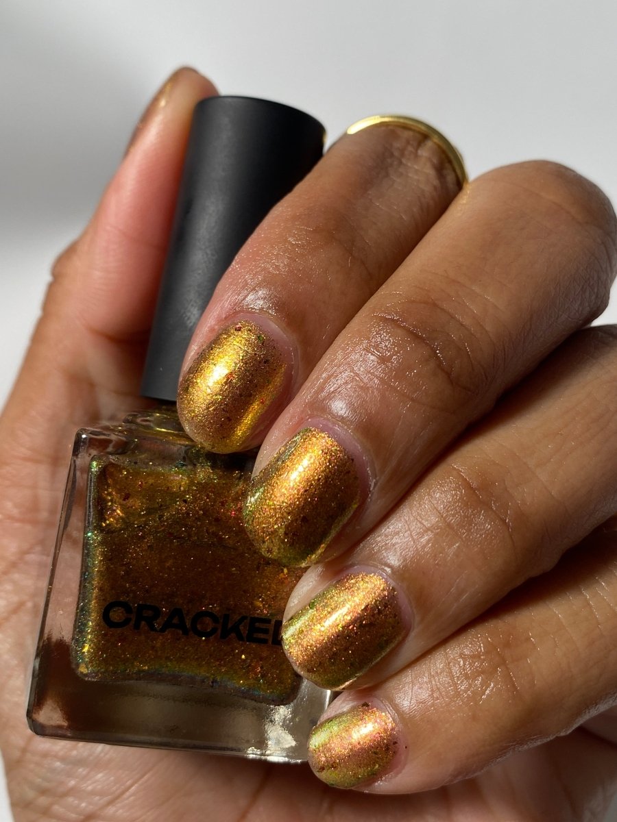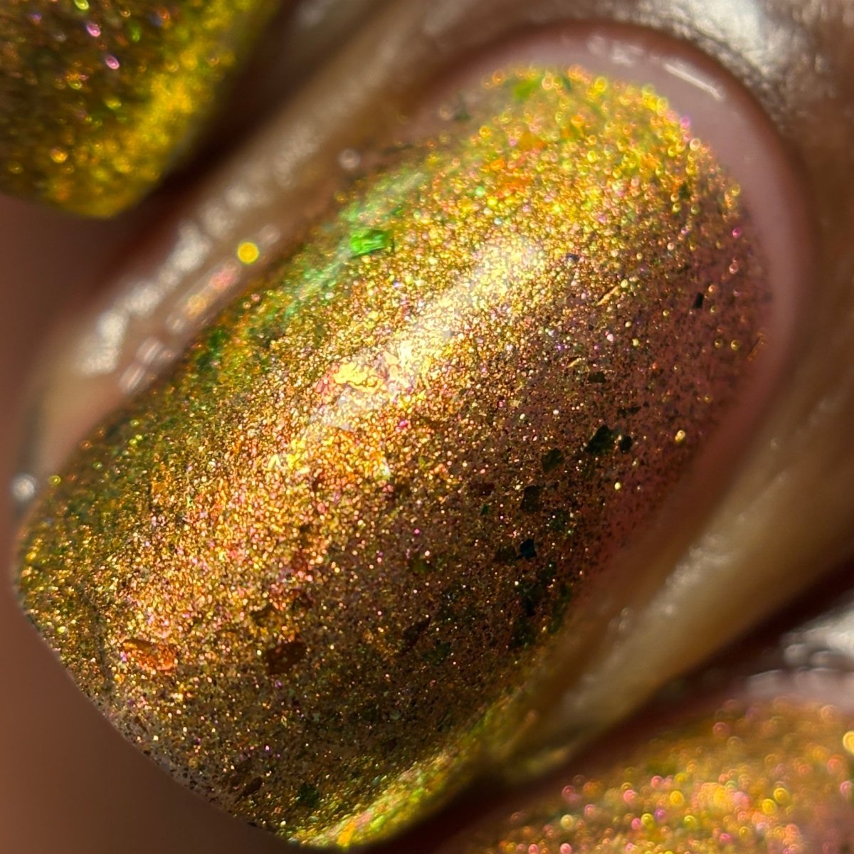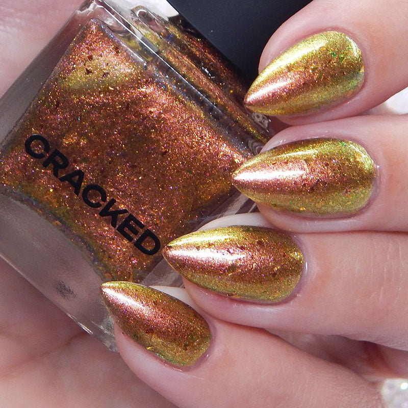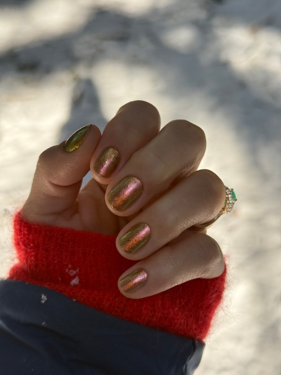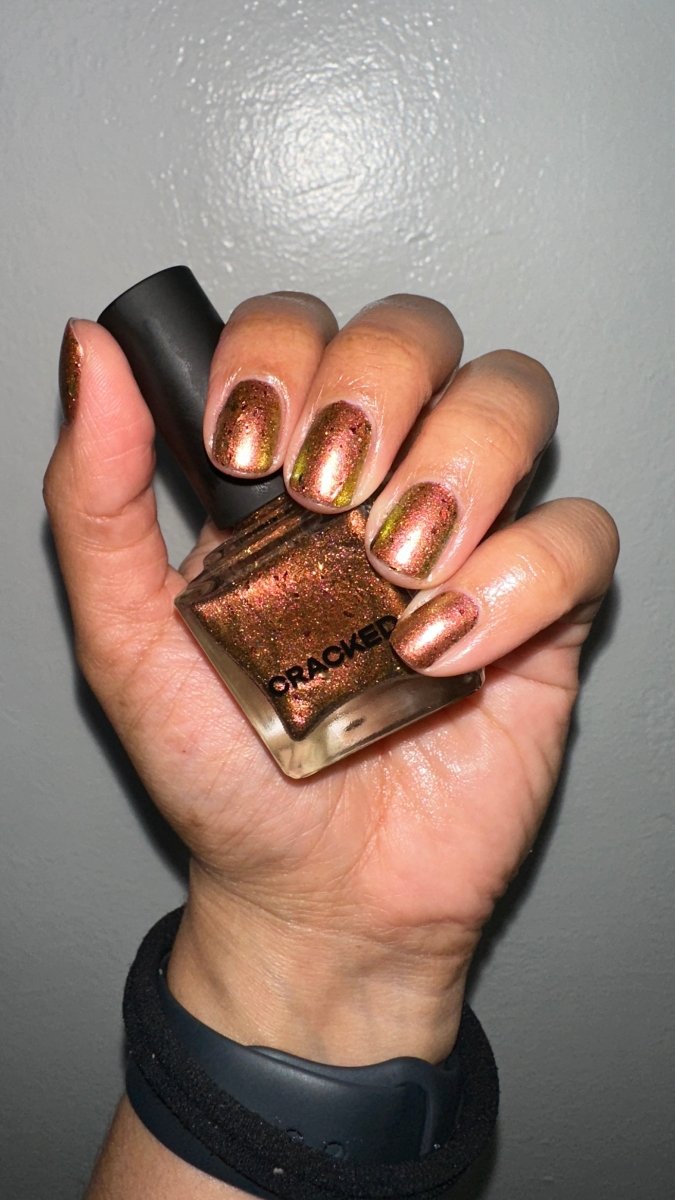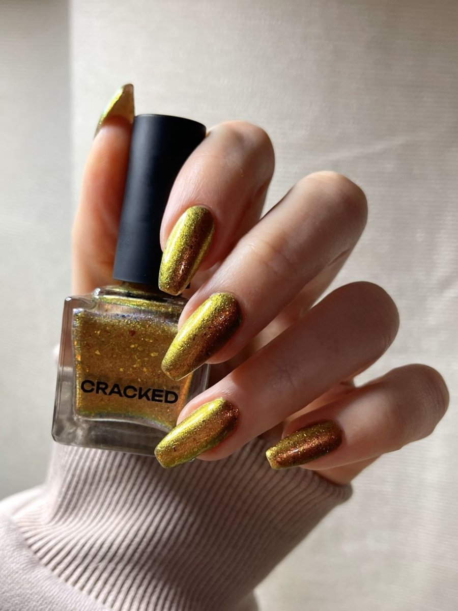 Rusty Microbe is a unique, metallic rusty copper shade that shifts from green to gold, accented with a delicate dusting of red/green/gold shifting flakes. This polish is a true chameleon, transforming dramatically from indoor to outdoor lighting. But when the sunlight hits it? Pure magic. This is unlike anything in our lineup, and stepping outside our comfort zone has paid off in the most spectacular way. Don’t miss your chance to grab this one-of-a-kind beauty