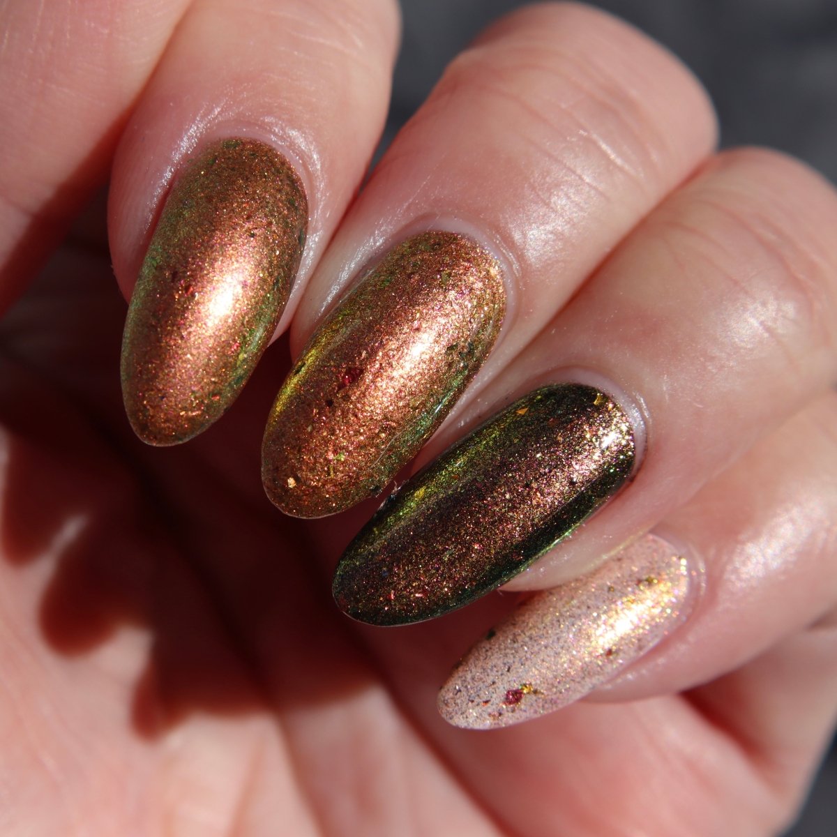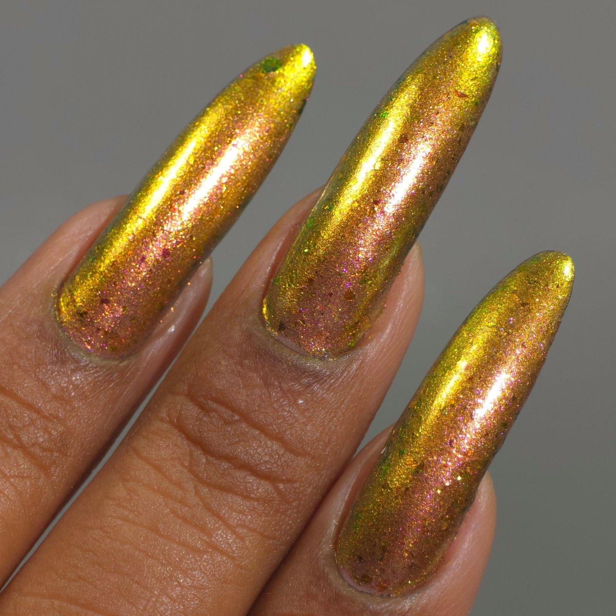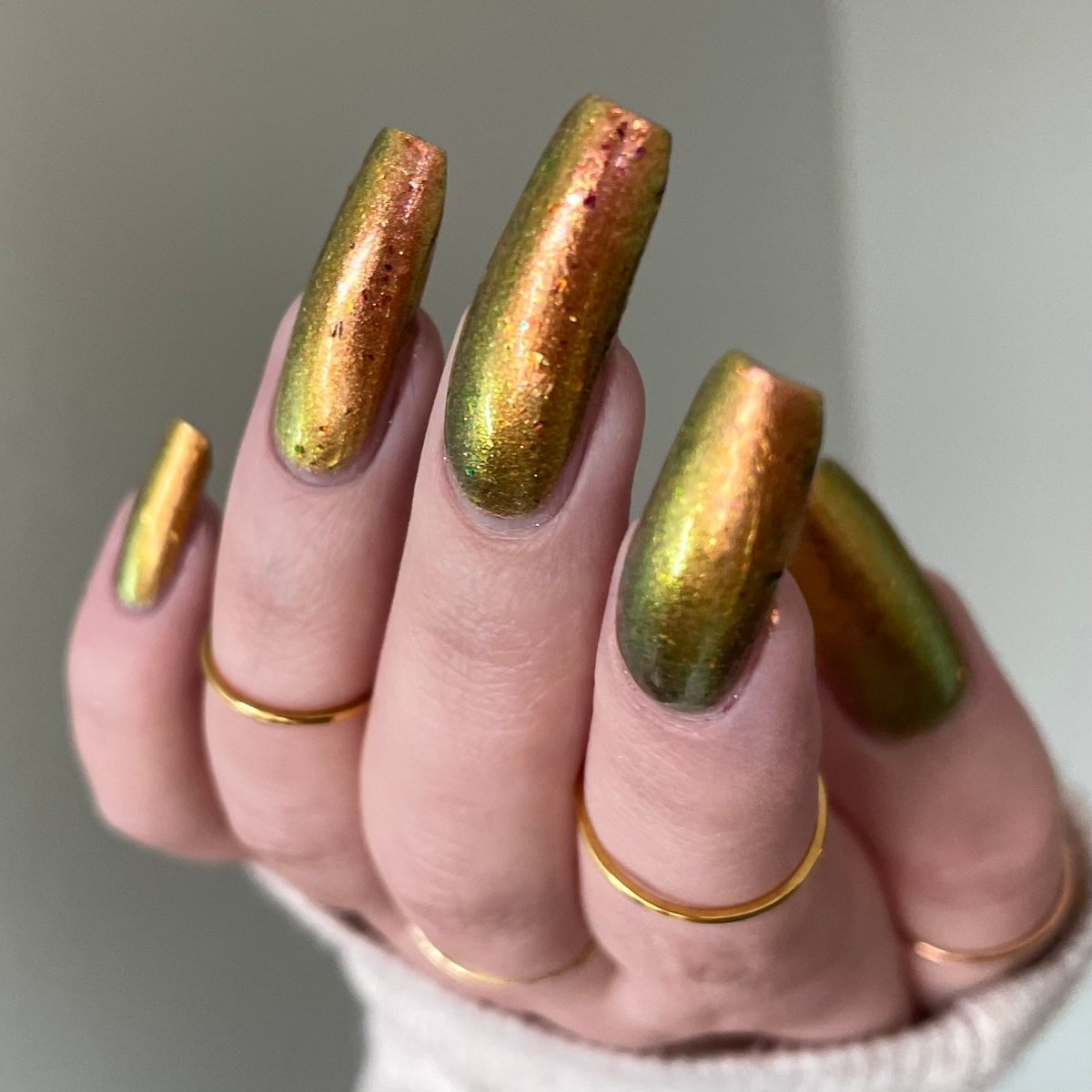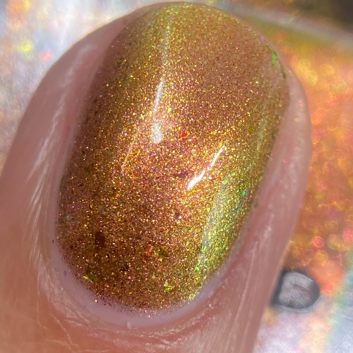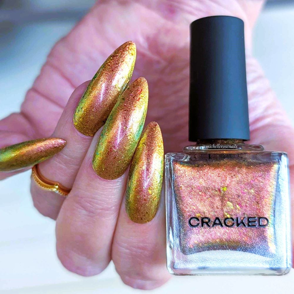 Rusty Microbe is a unique, metallic rusty copper shade that shifts from green to gold, accented with a delicate dusting of red/green/gold shifting flakes. This polish is a true chameleon, transforming dramatically from indoor to outdoor lighting. But when the sunlight hits it? Pure magic. This is unlike anything in our lineup, and stepping outside our comfort zone has paid off in the most spectacular way. Don’t miss your chance to grab this one-of-a-kind beauty
