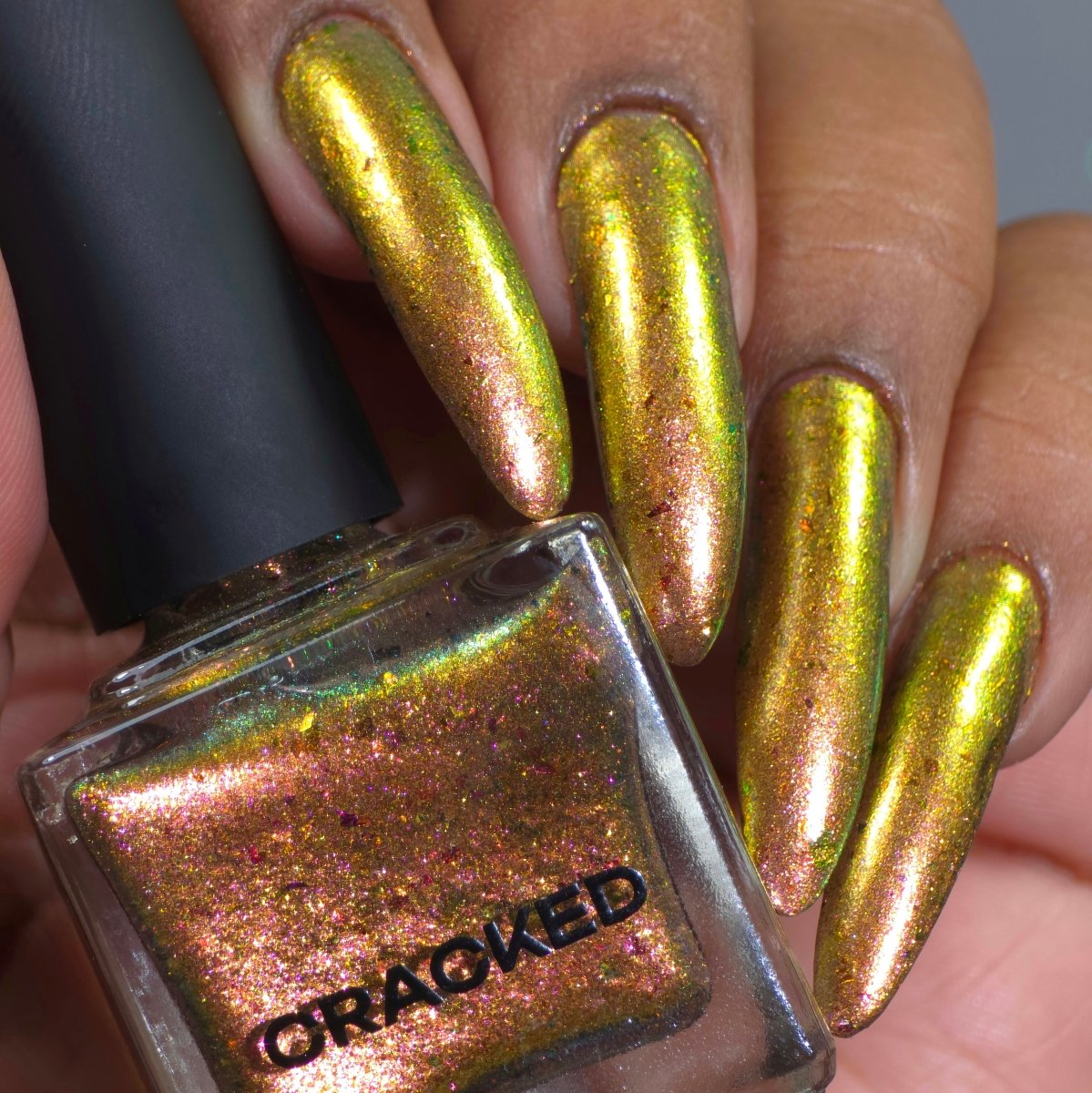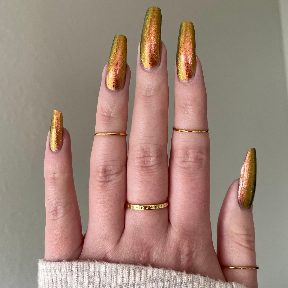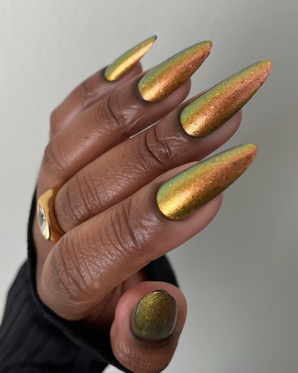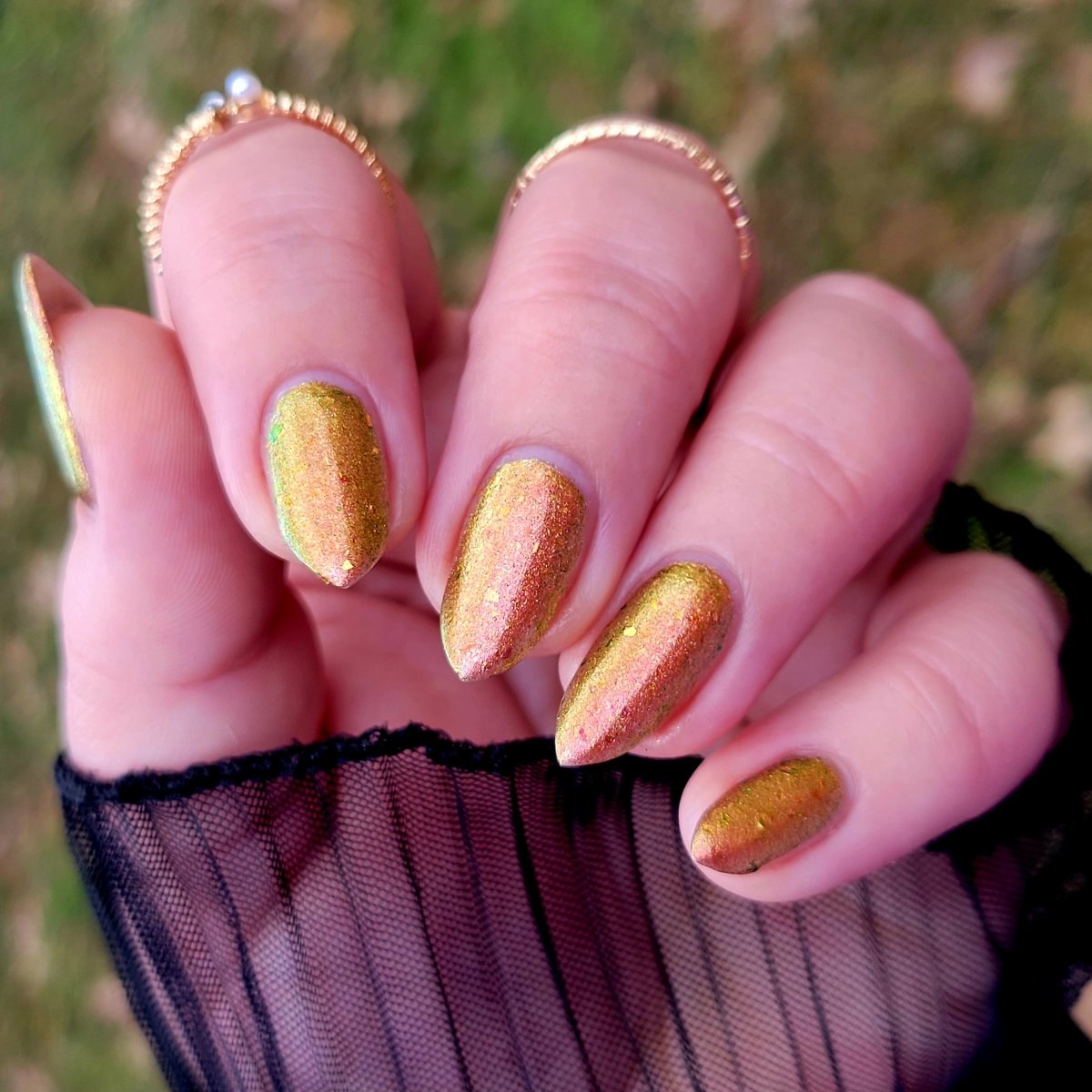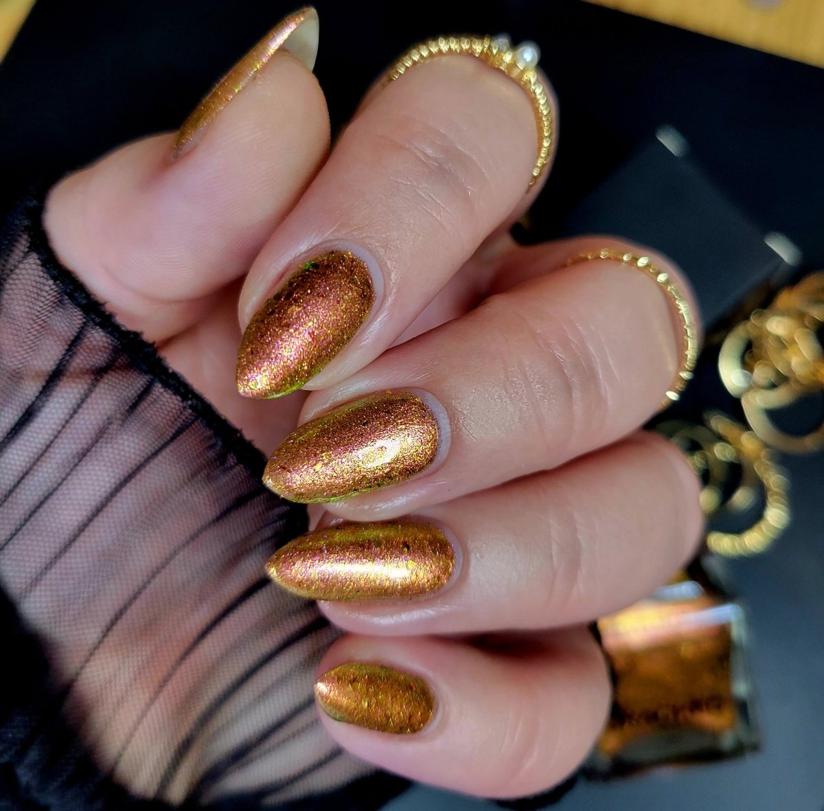 Rusty Microbe is a unique, metallic rusty copper shade that shifts from green to gold, accented with a delicate dusting of red/green/gold shifting flakes. This polish is a true chameleon, transforming dramatically from indoor to outdoor lighting. But when the sunlight hits it? Pure magic. This is unlike anything in our lineup, and stepping outside our comfort zone has paid off in the most spectacular way. Don’t miss your chance to grab this one-of-a-kind beauty