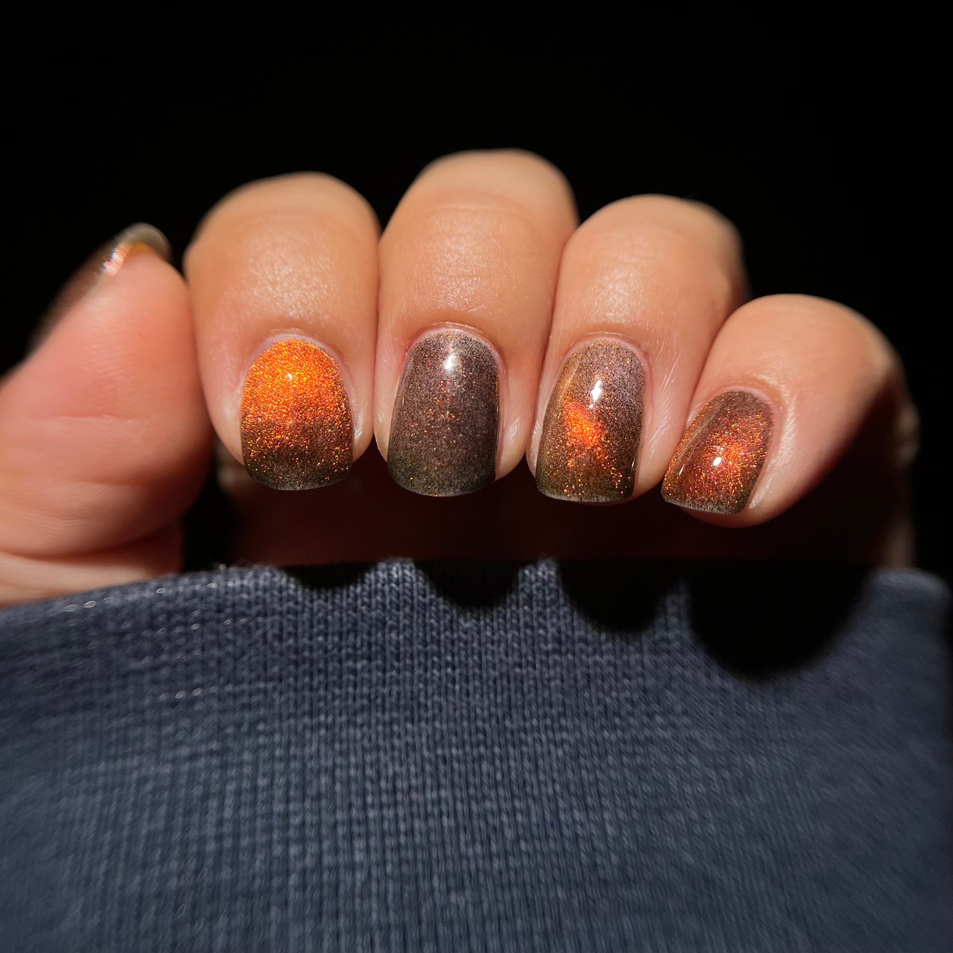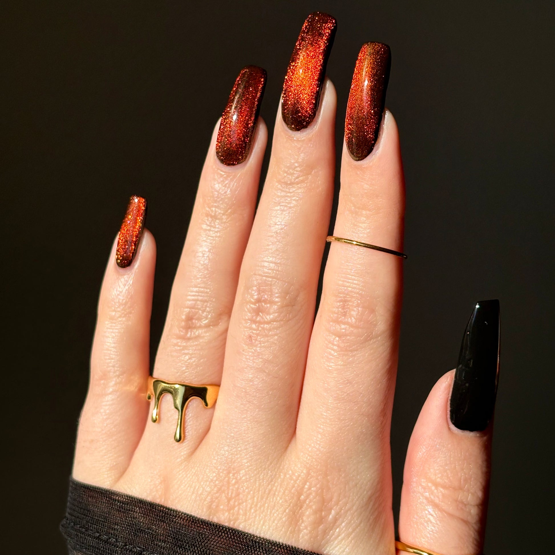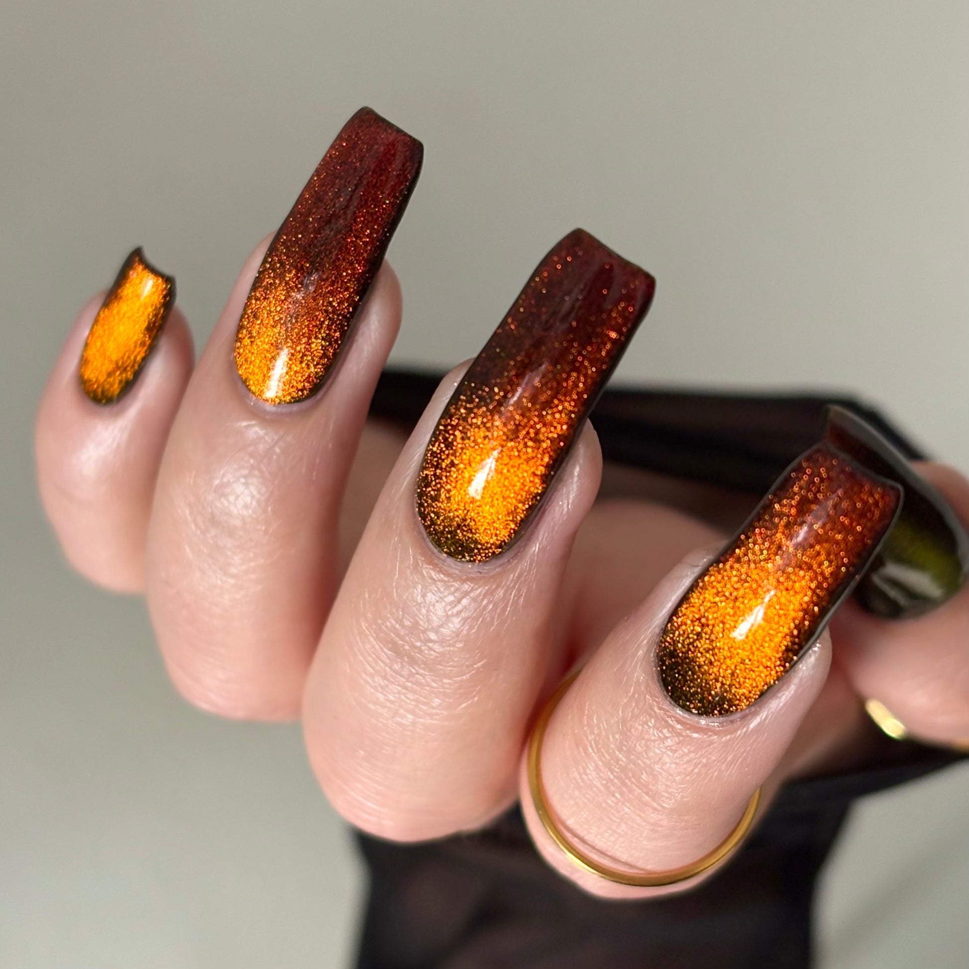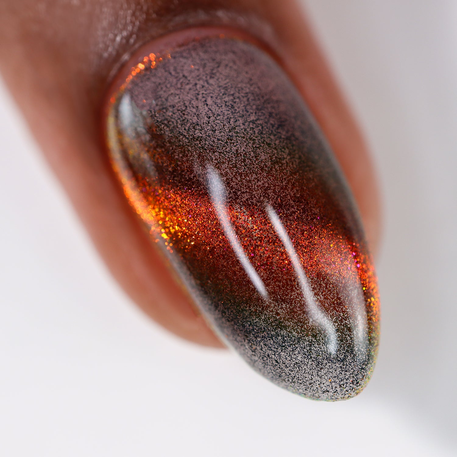 Stoke the flames of Halloween with Scorchy, a fiery orange magnetic topper, alive with a soft gold shift and flickers of black speckles. Like glowing embers crackling in the dark, it transforms any manicure into a haunting blaze. The spooky sibling of our fan-favorite Petals on the Surface, Scorchy is the perfect way to set your nails alight with instant Halloween vibes.