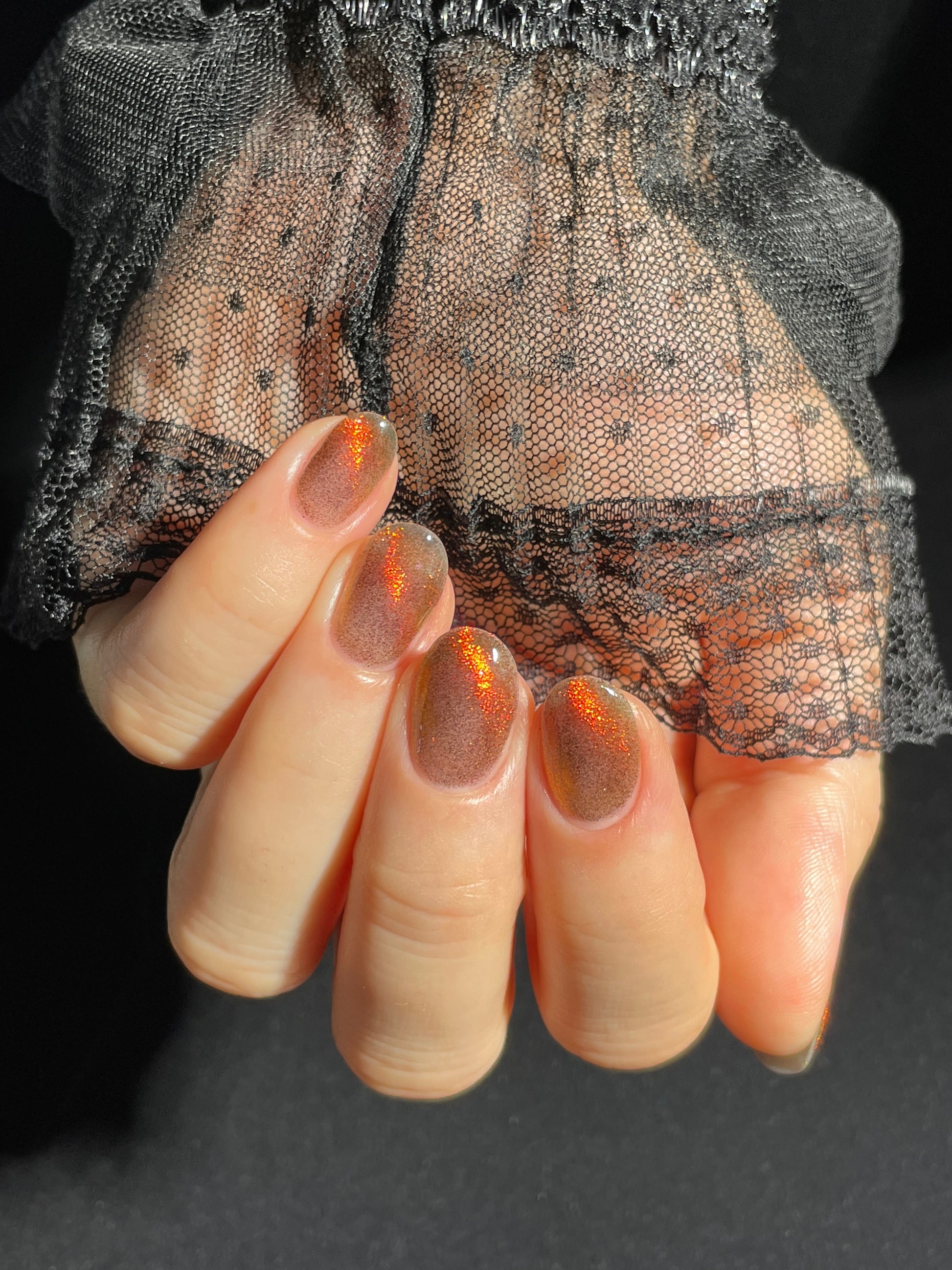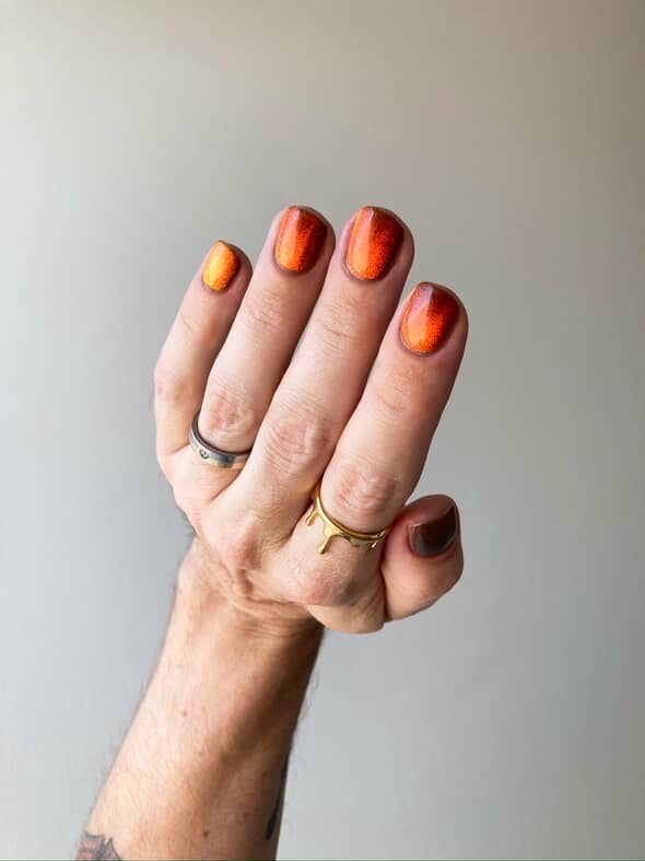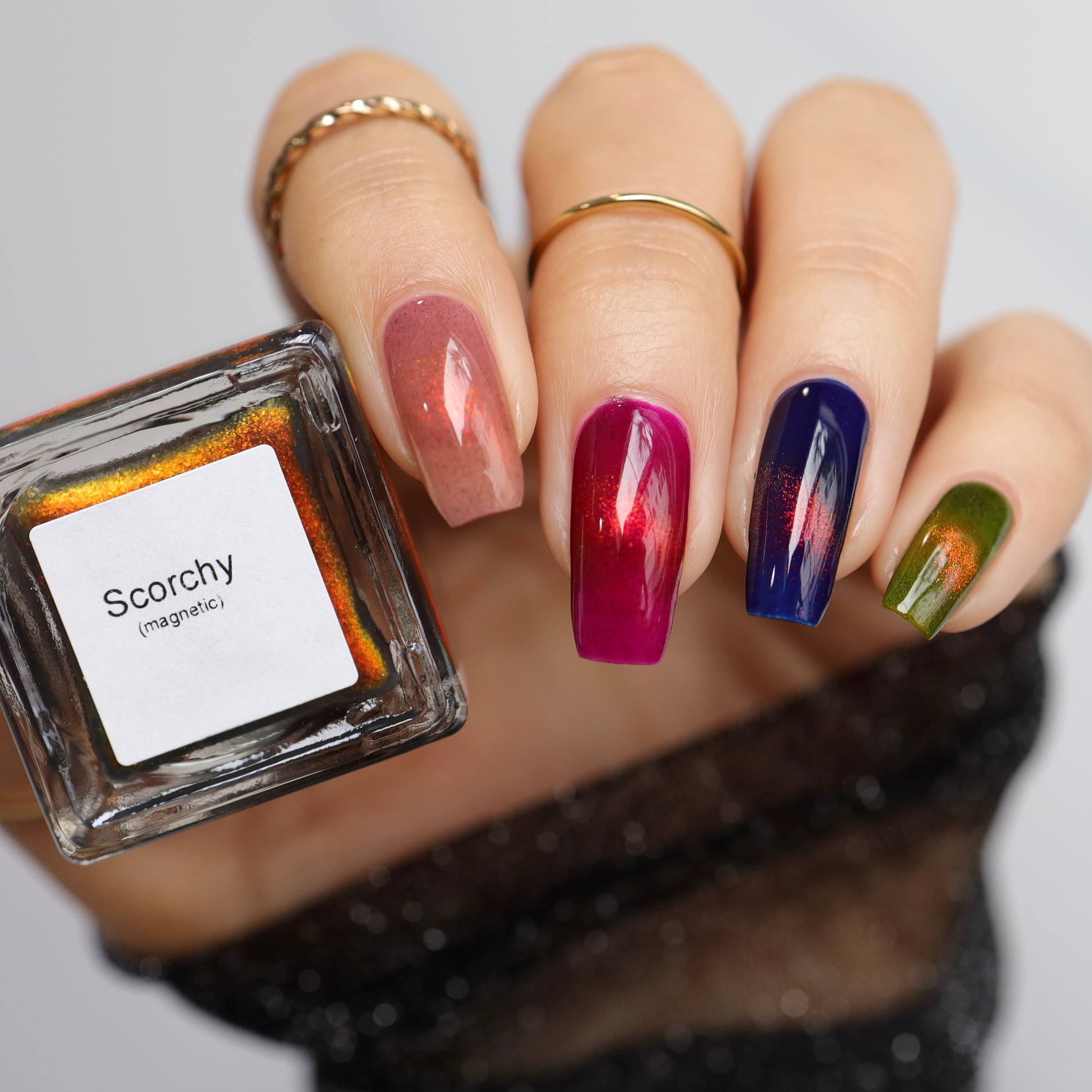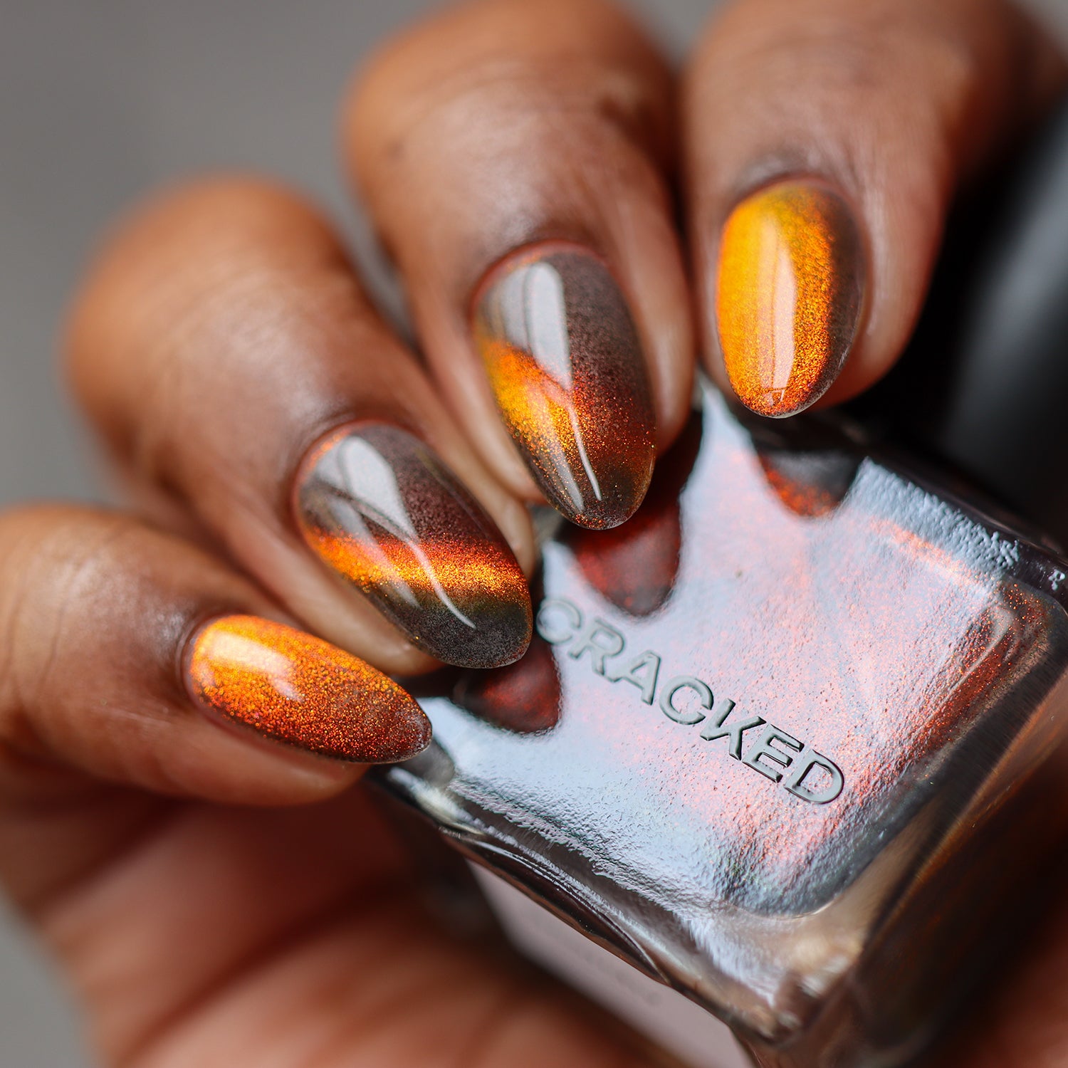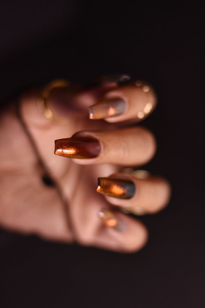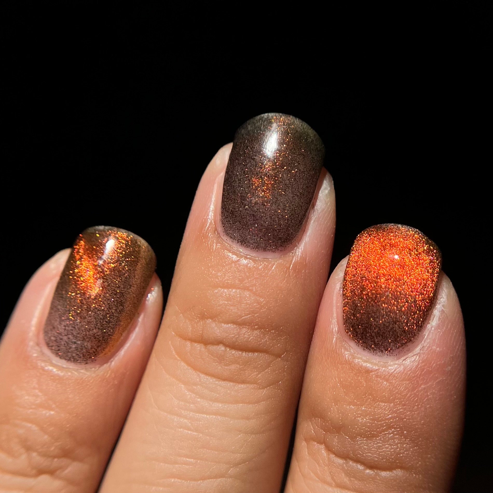 Stoke the flames of Halloween with Scorchy, a fiery orange magnetic topper, alive with a soft gold shift and flickers of black speckles. Like glowing embers crackling in the dark, it transforms any manicure into a haunting blaze. The spooky sibling of our fan-favorite Petals on the Surface, Scorchy is the perfect way to set your nails alight with instant Halloween vibes.