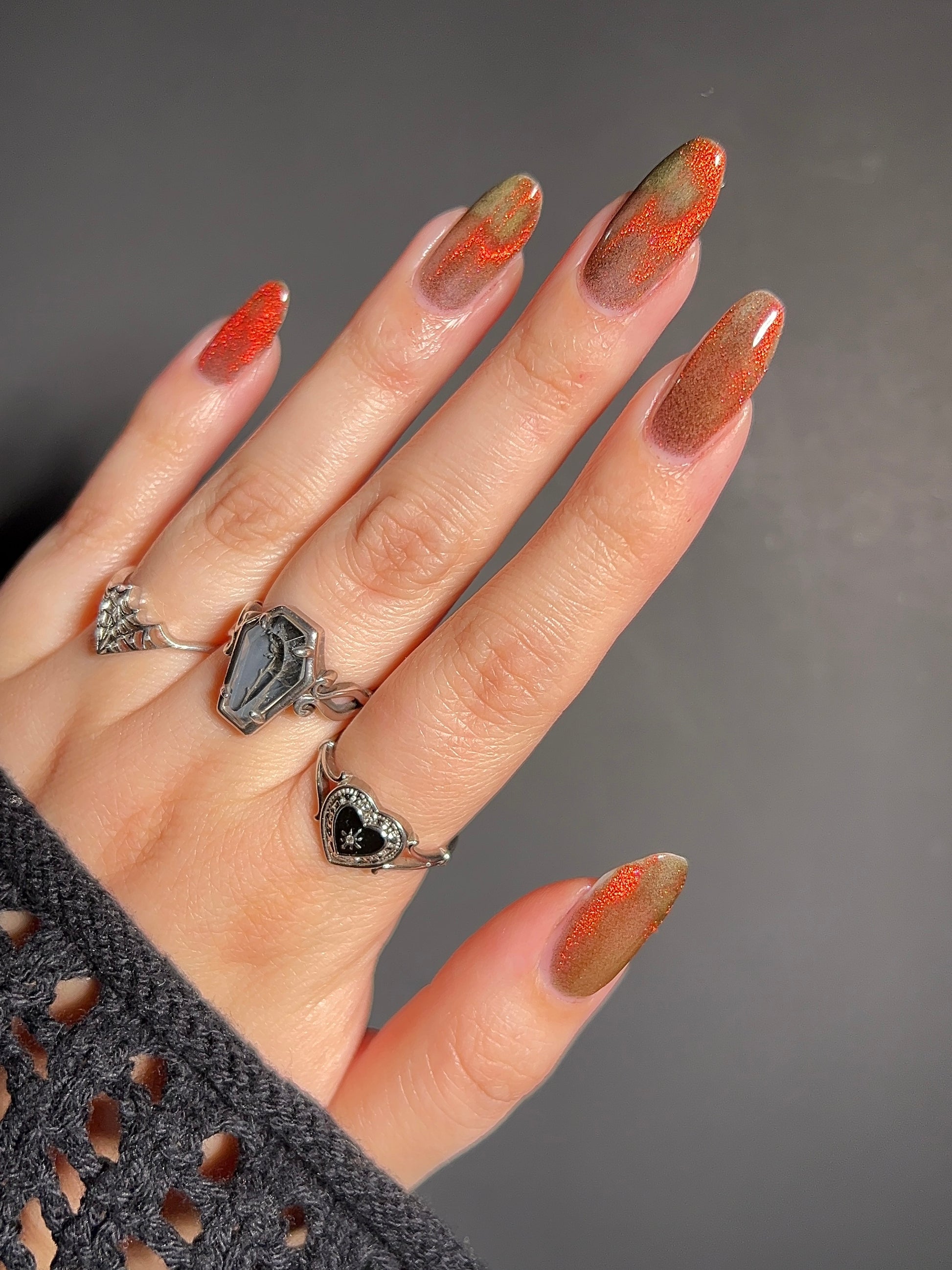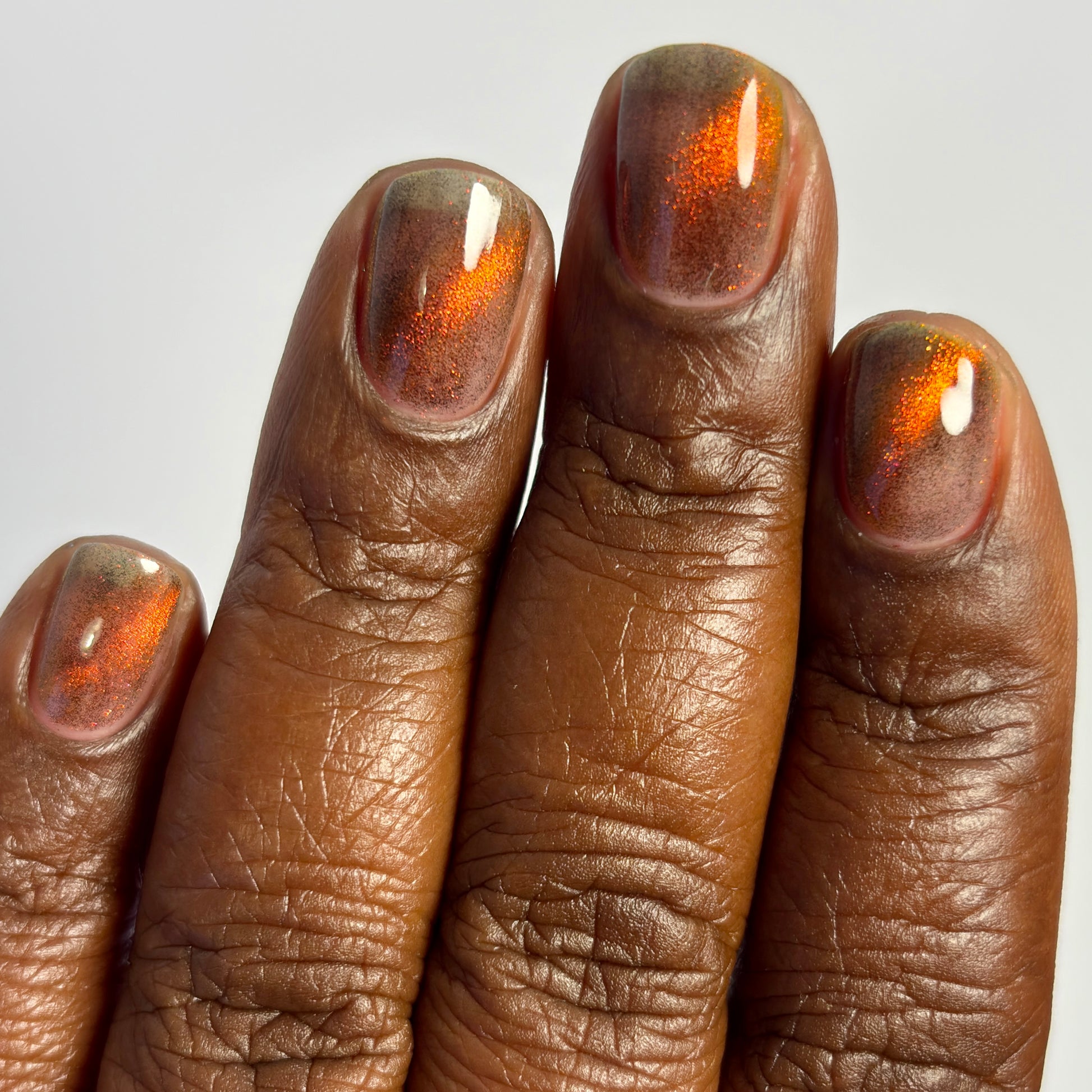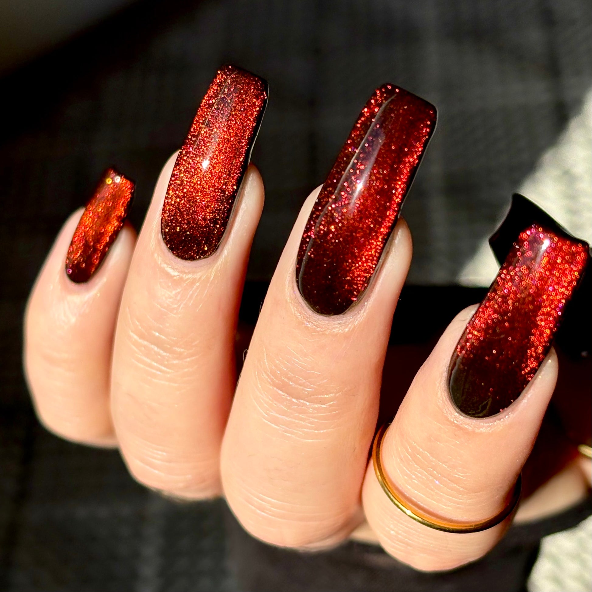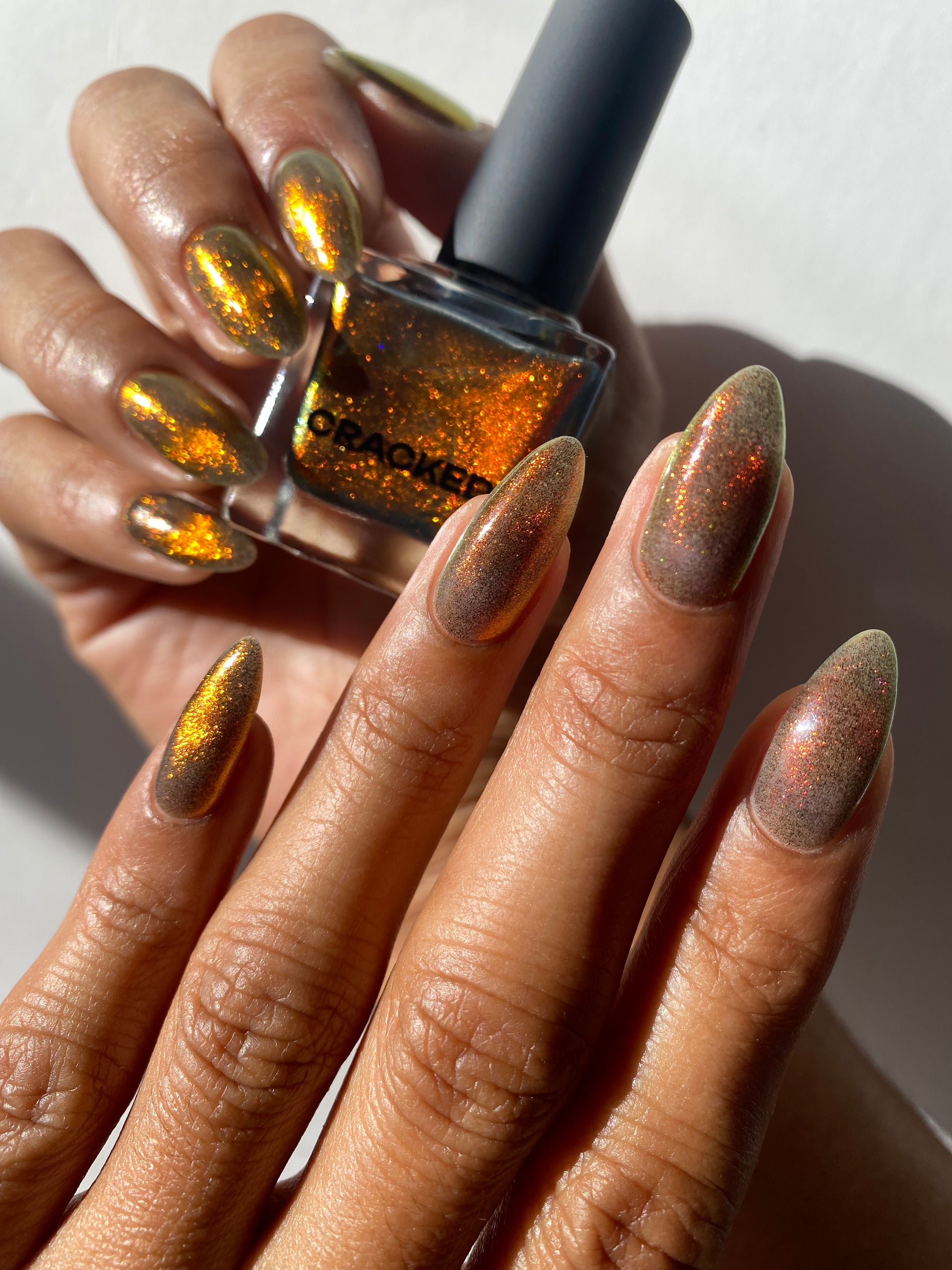 Stoke the flames of Halloween with Scorchy, a fiery orange magnetic topper, alive with a soft gold shift and flickers of black speckles. Like glowing embers crackling in the dark, it transforms any manicure into a haunting blaze. The spooky sibling of our fan-favorite Petals on the Surface, Scorchy is the perfect way to set your nails alight with instant Halloween vibes.