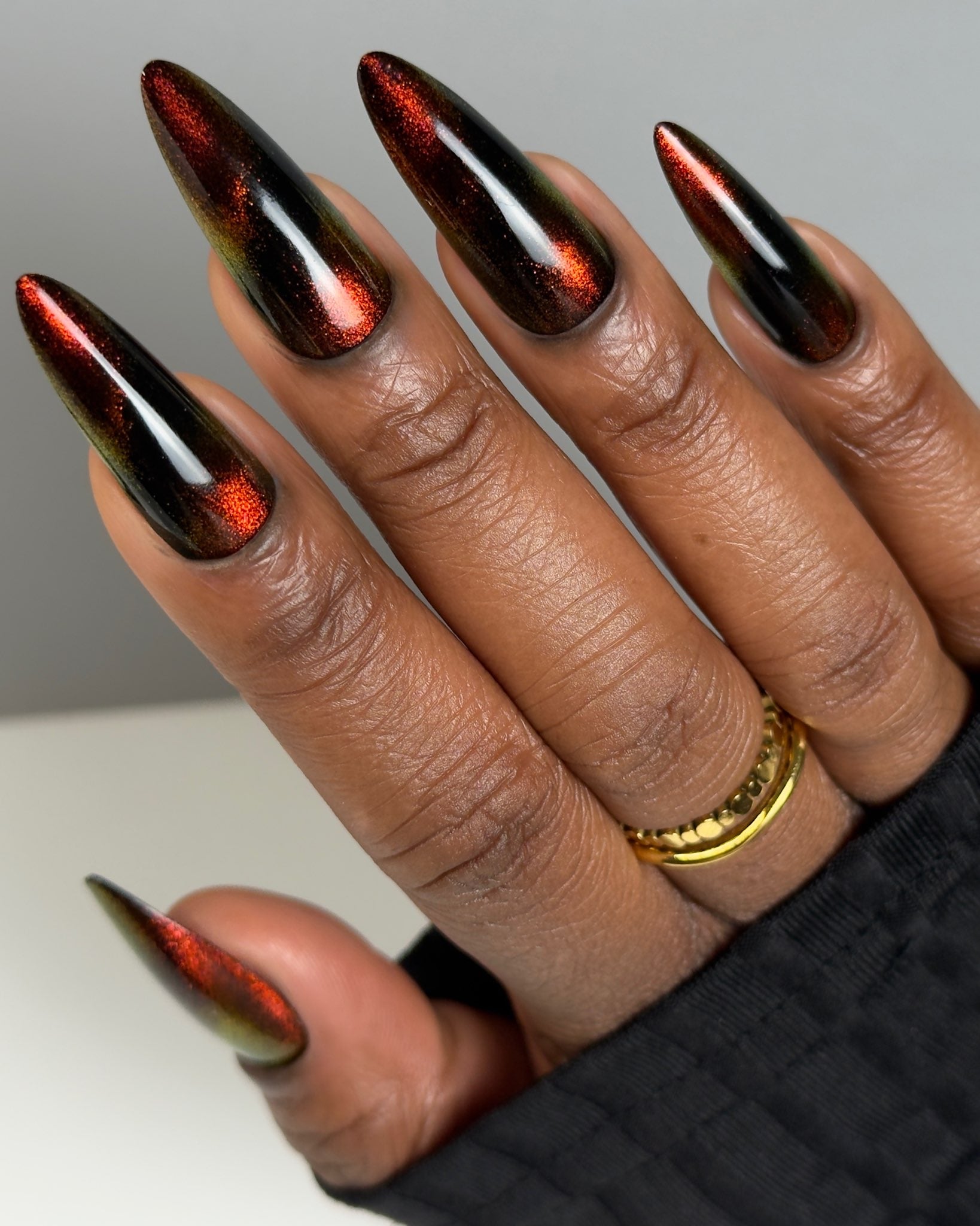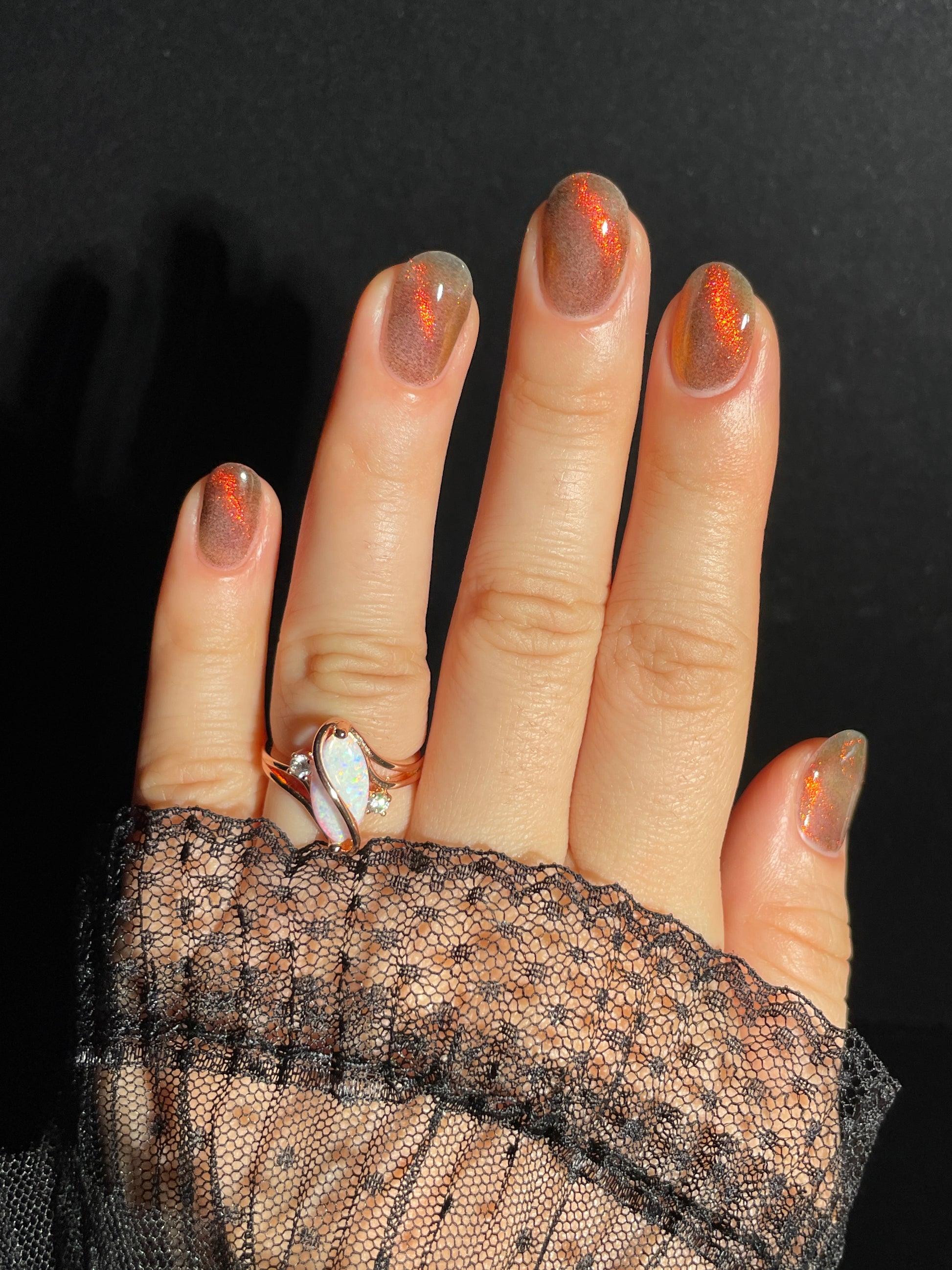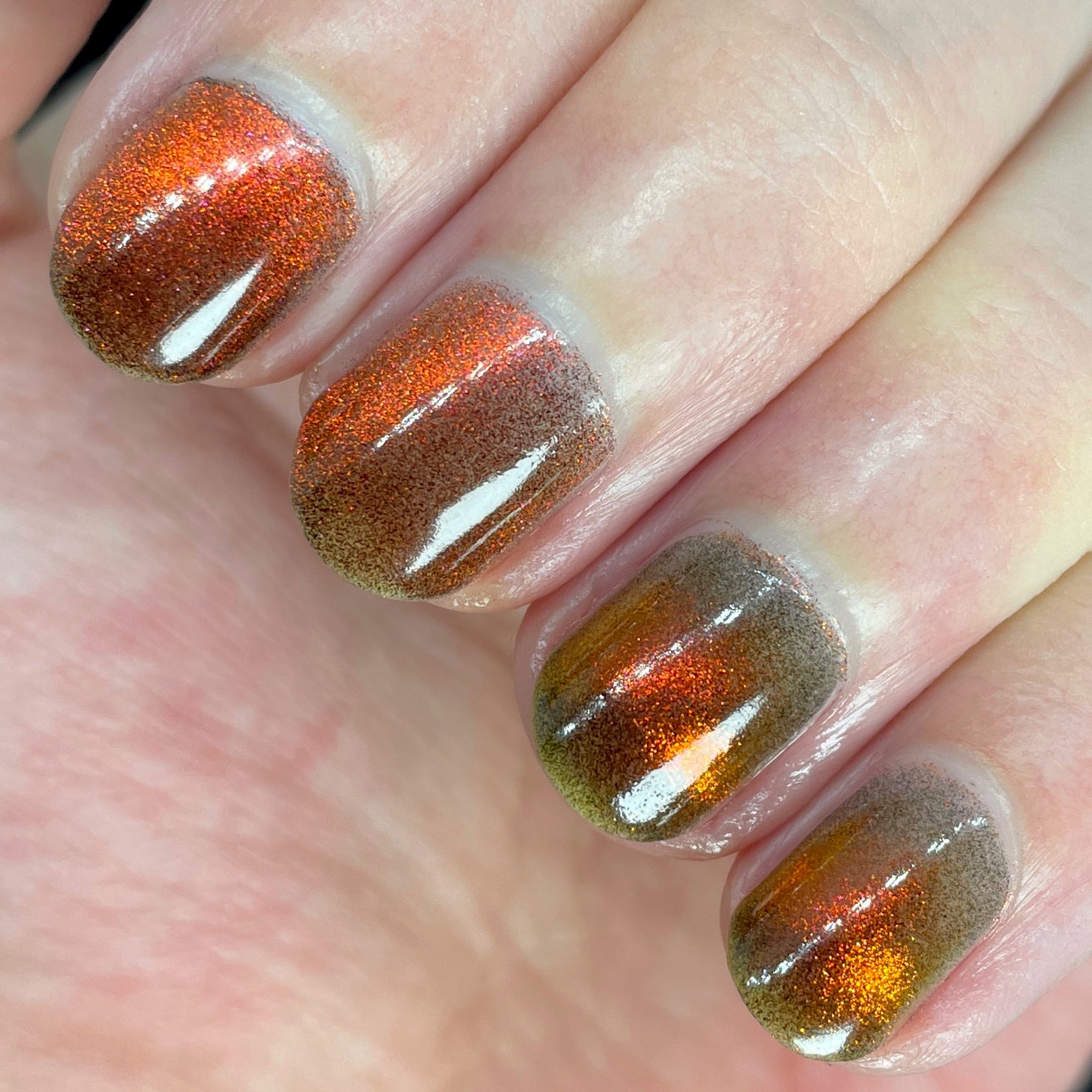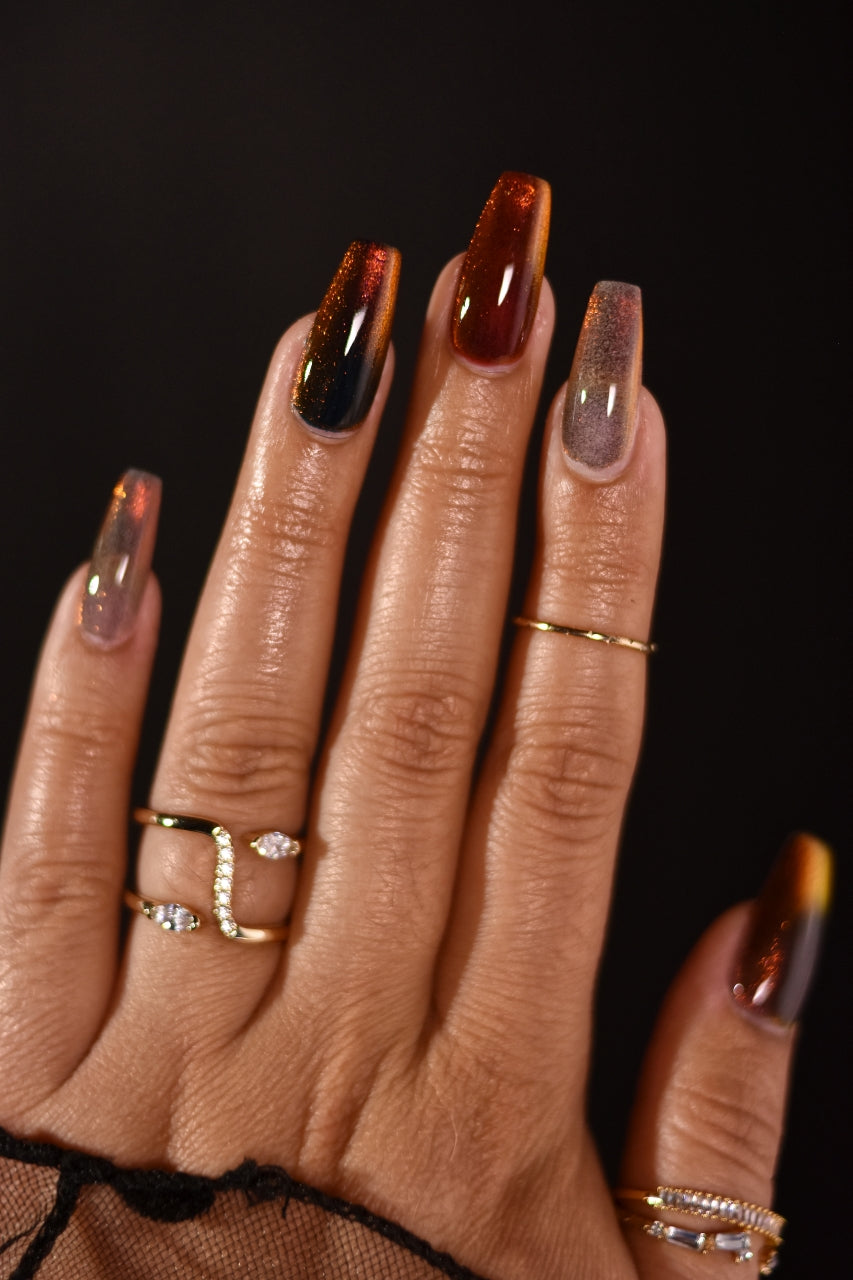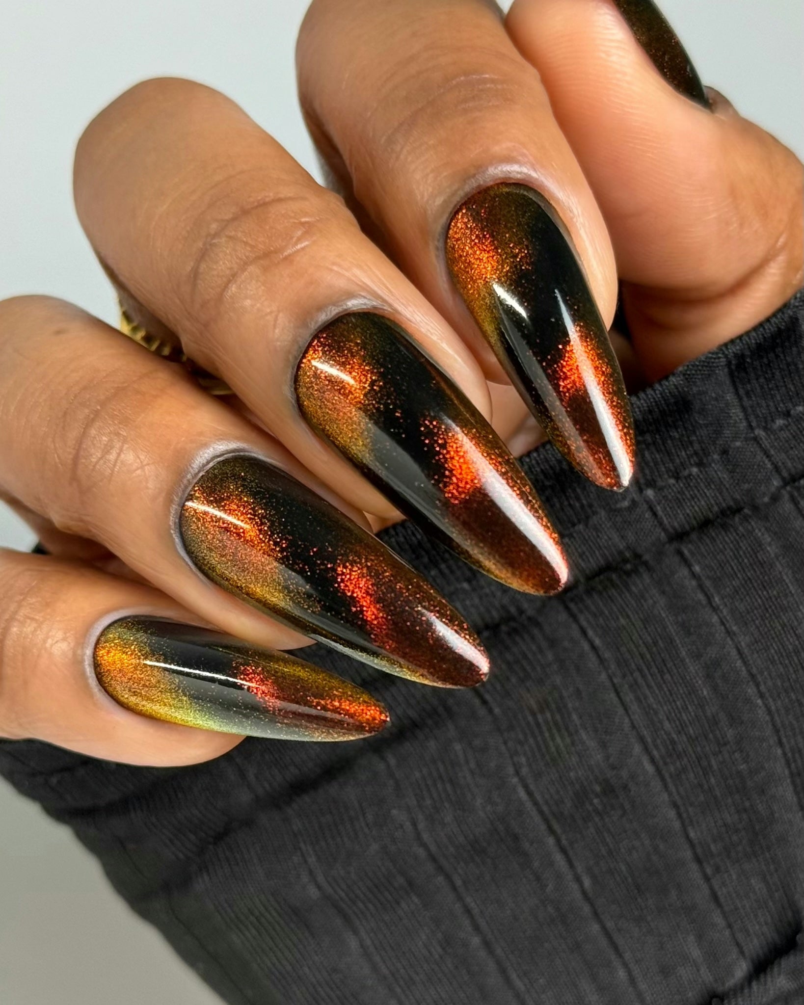 Stoke the flames of Halloween with Scorchy, a fiery orange magnetic topper, alive with a soft gold shift and flickers of black speckles. Like glowing embers crackling in the dark, it transforms any manicure into a haunting blaze. The spooky sibling of our fan-favorite Petals on the Surface, Scorchy is the perfect way to set your nails alight with instant Halloween vibes.