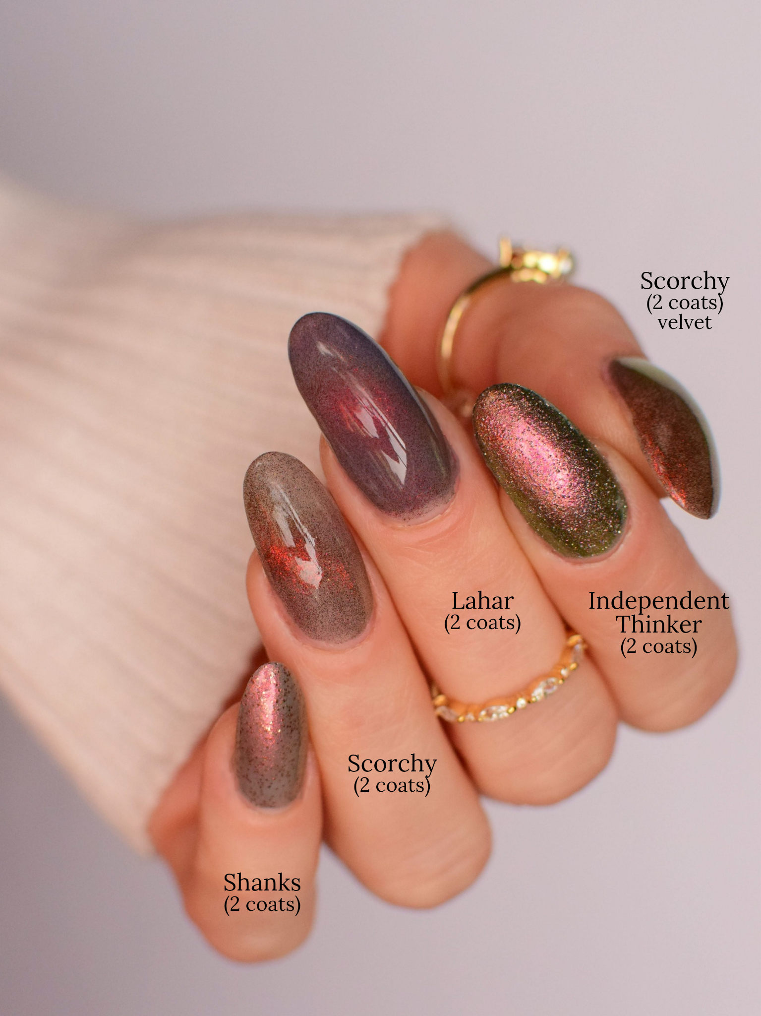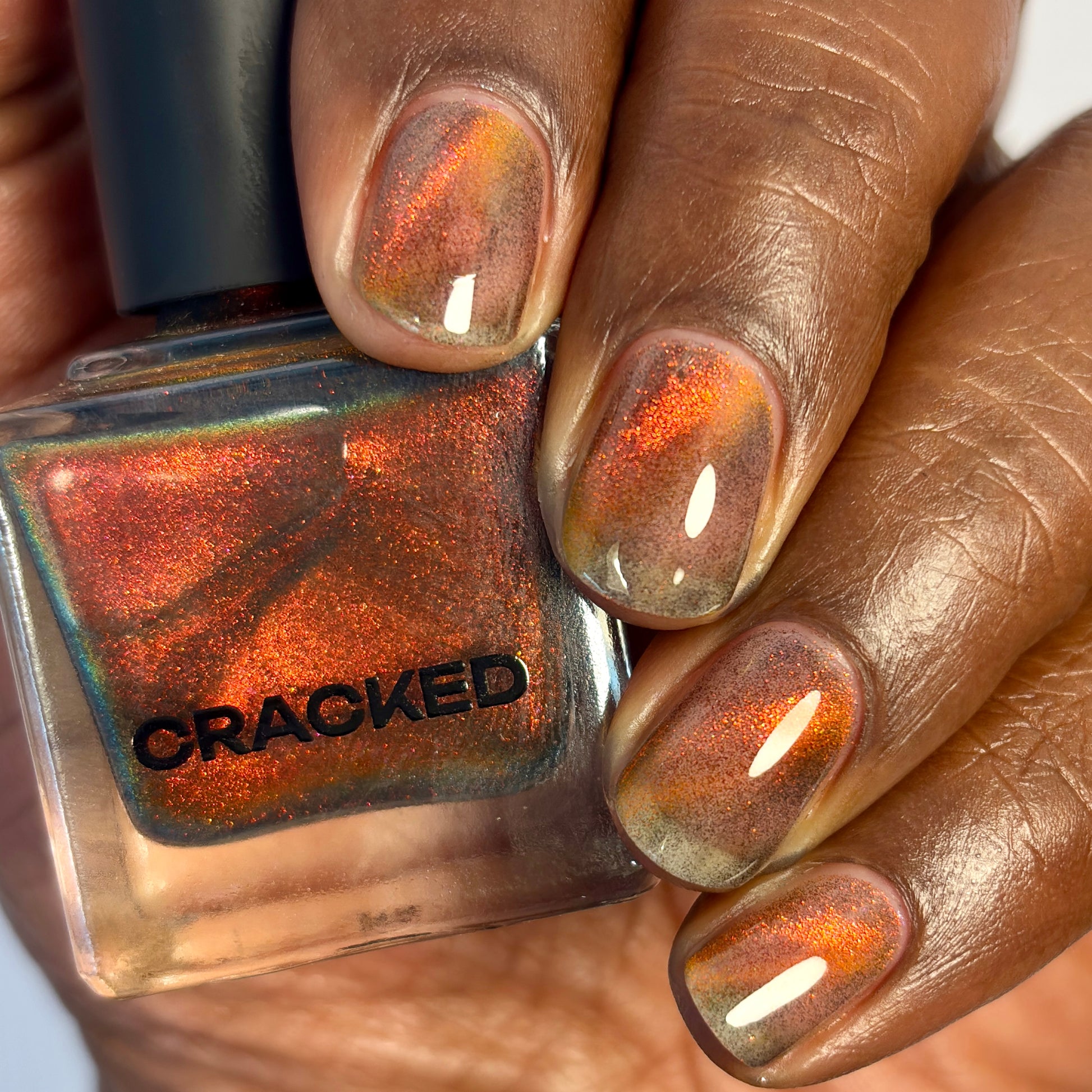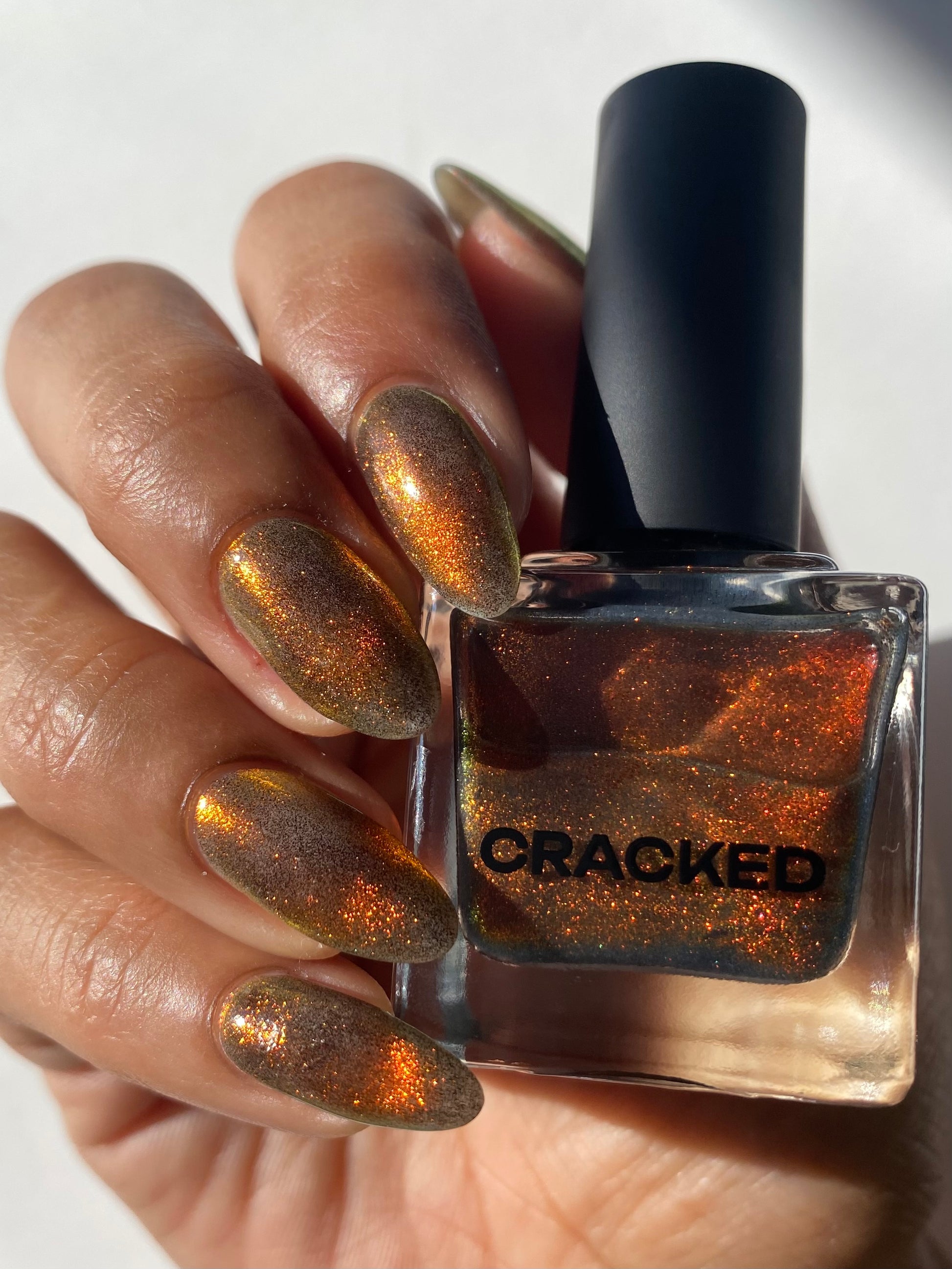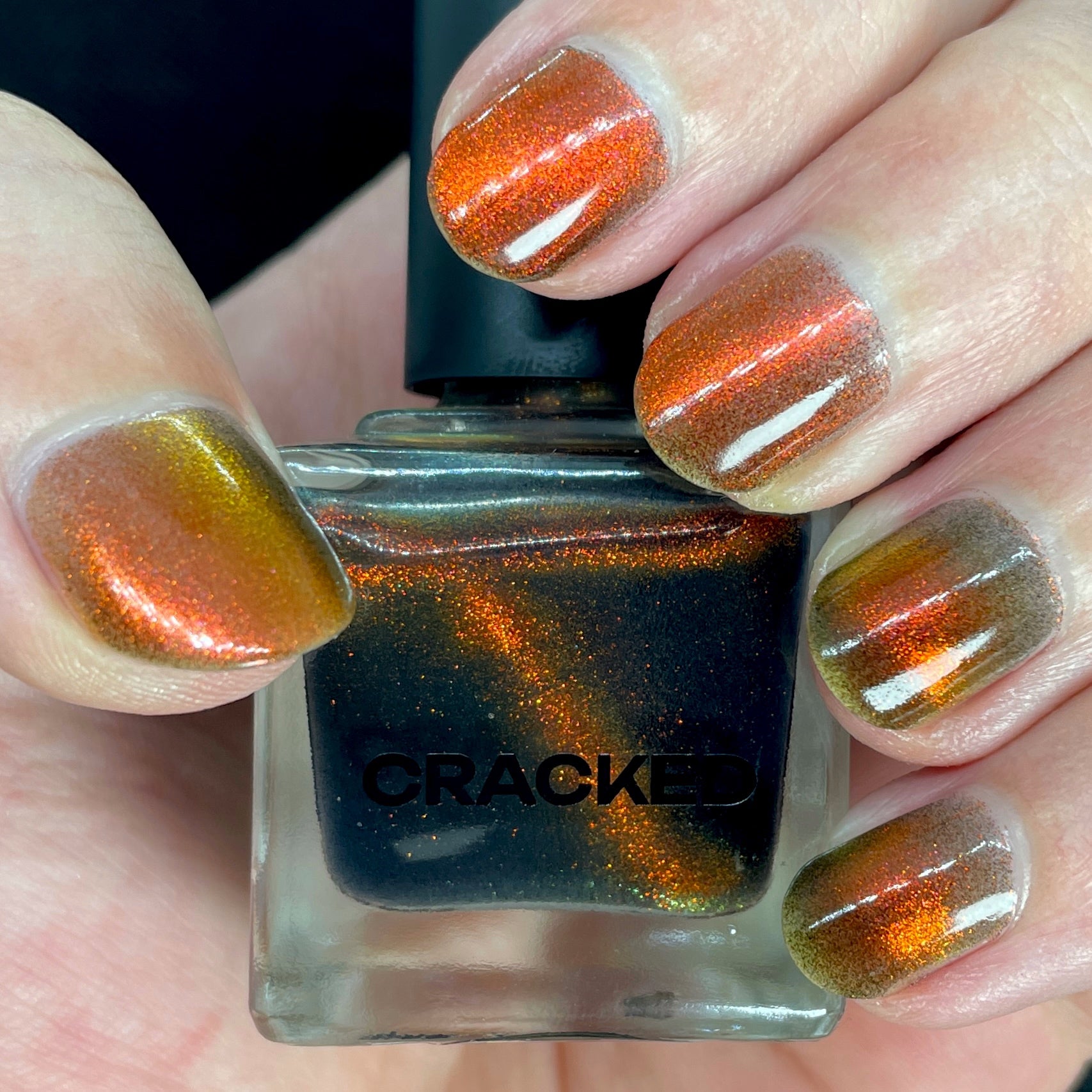 Stoke the flames of Halloween with Scorchy, a fiery orange magnetic topper, alive with a soft gold shift and flickers of black speckles. Like glowing embers crackling in the dark, it transforms any manicure into a haunting blaze. The spooky sibling of our fan-favorite Petals on the Surface, Scorchy is the perfect way to set your nails alight with instant Halloween vibes.