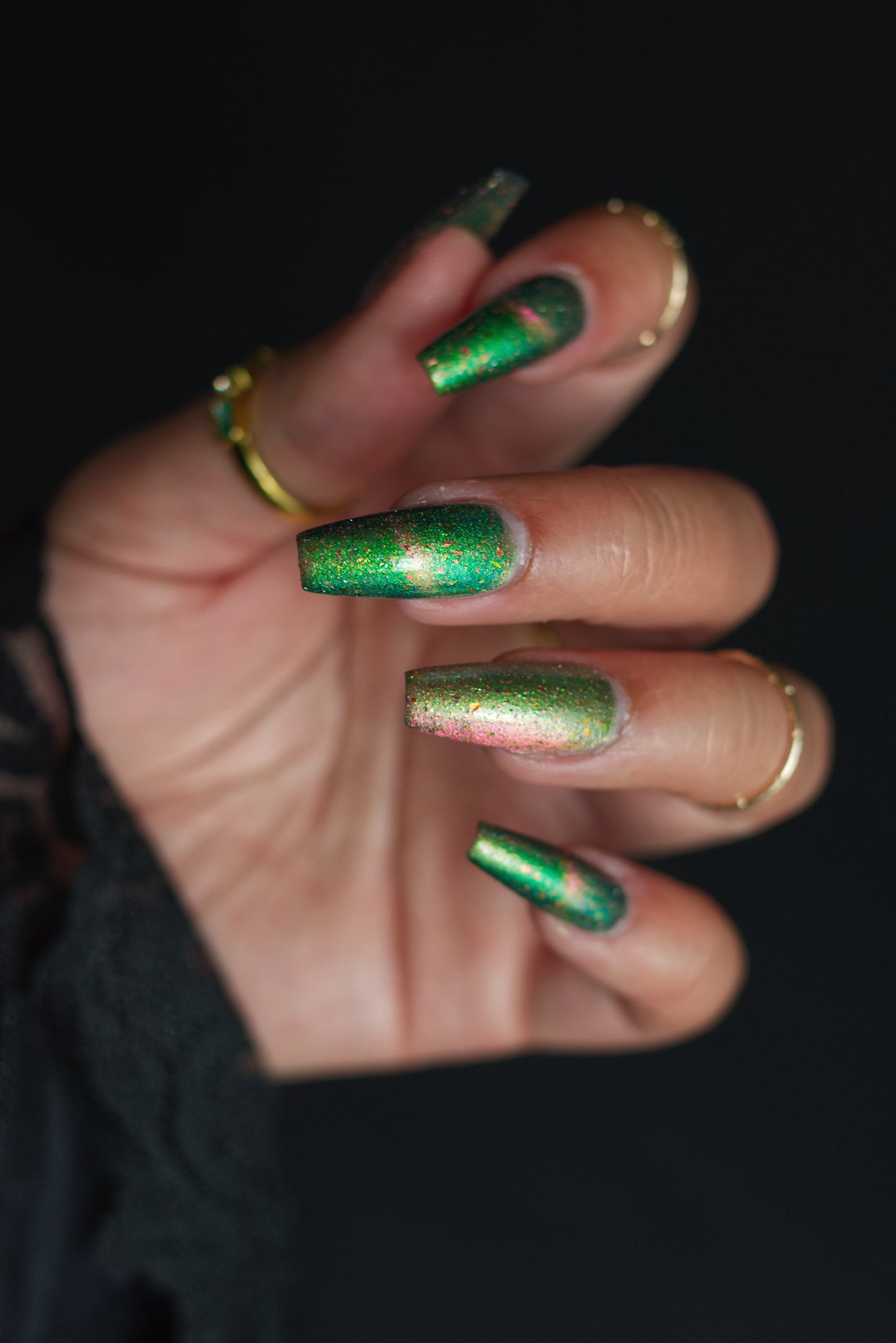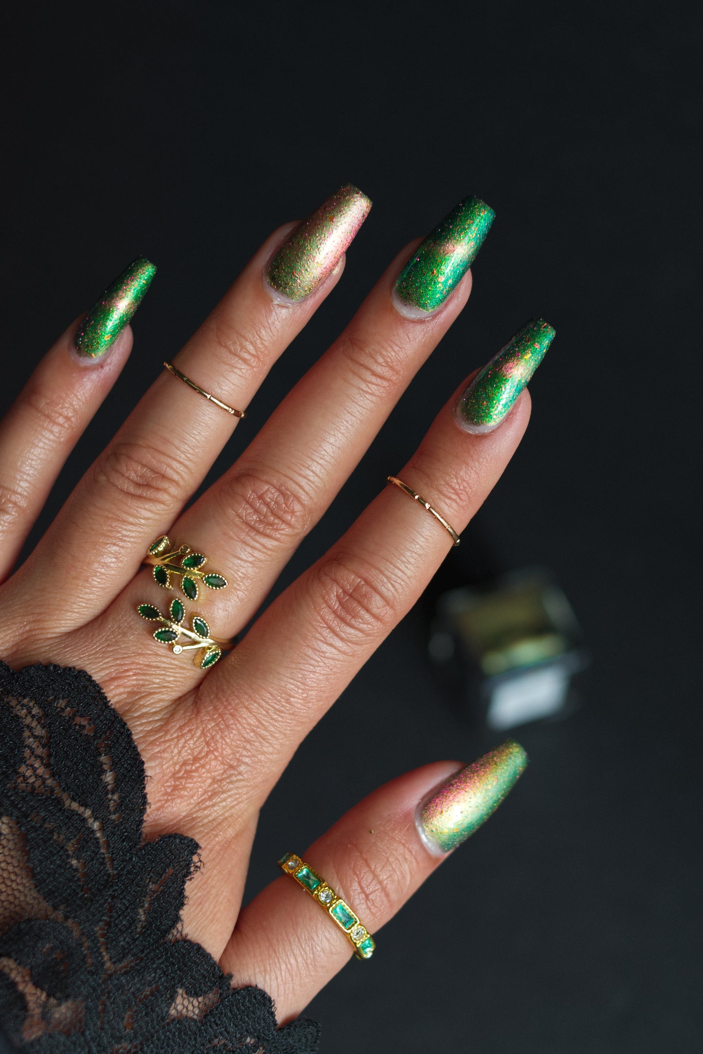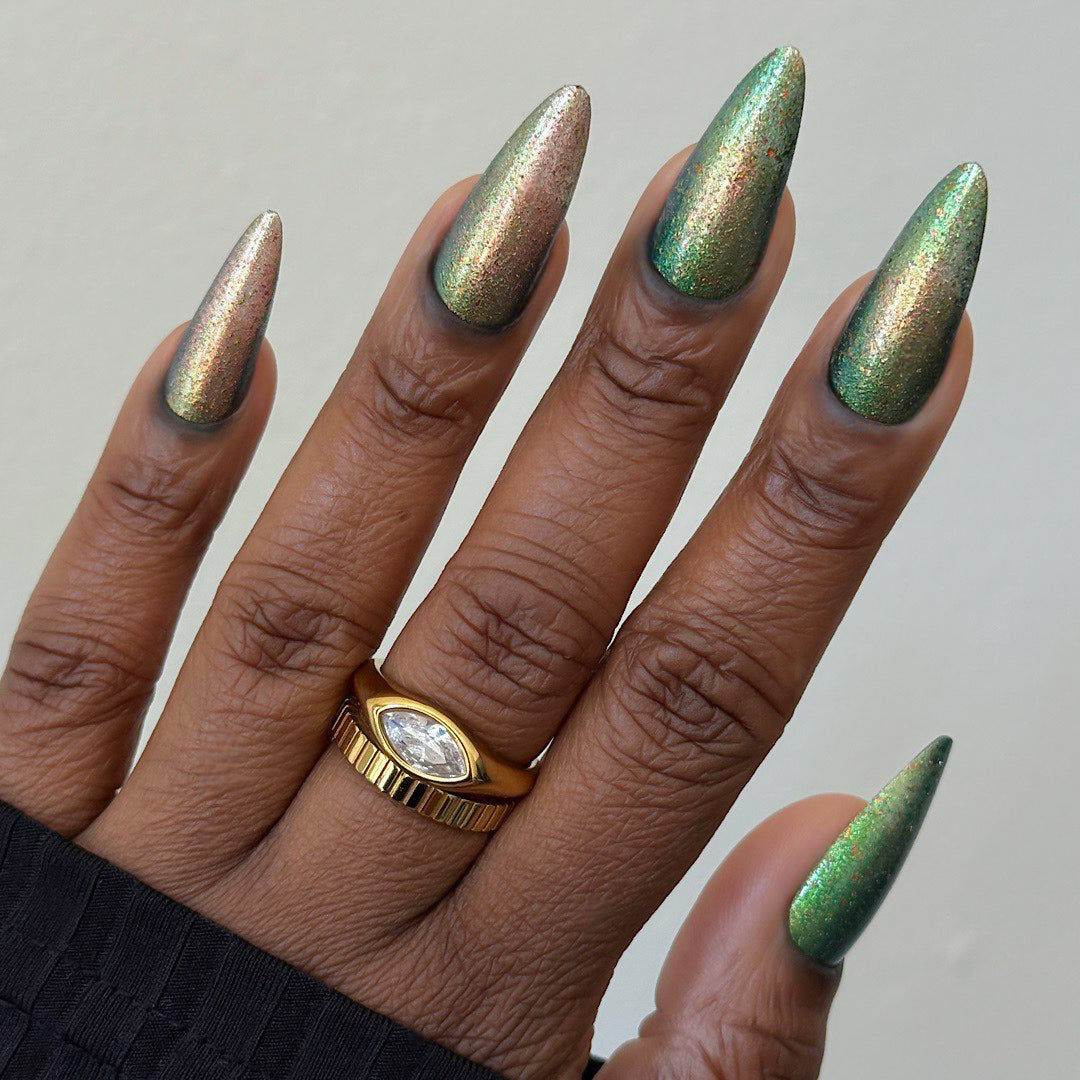 Seek To Disrupt is your green light to go off-script. This dark hunter green is laced with fiery flakes in gold, red, and orange, and is charged with copper-to-gold soft magnetic pigments that shift like your mood when you’re plotting something bold. A little chaotic, endlessly intriguing, and beautiful without even being magnetized. This shade is for the ones who crave the unexpected. It’s our founder’s forever muse, the greens just keep coming. Go ahead and disrupt the norm.
