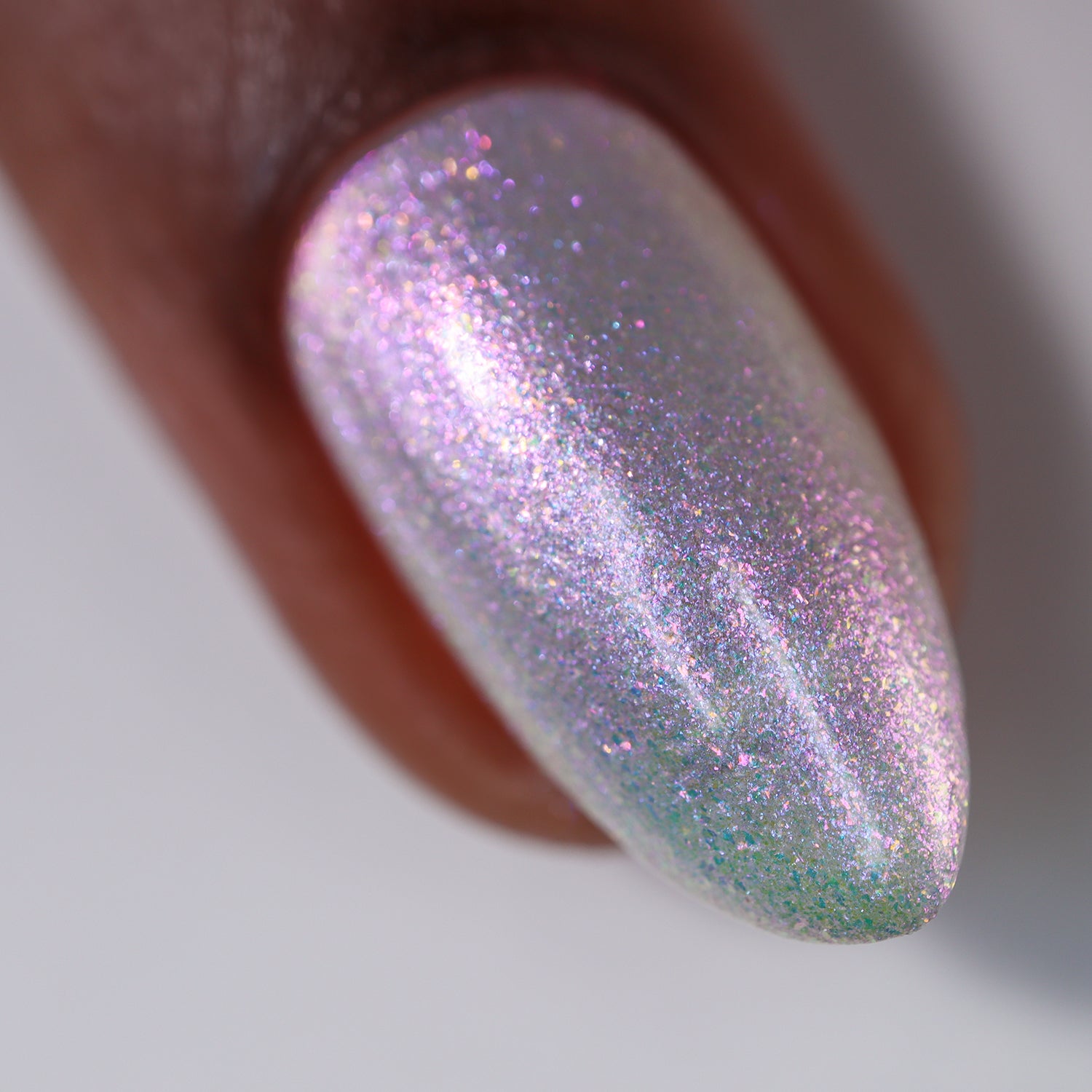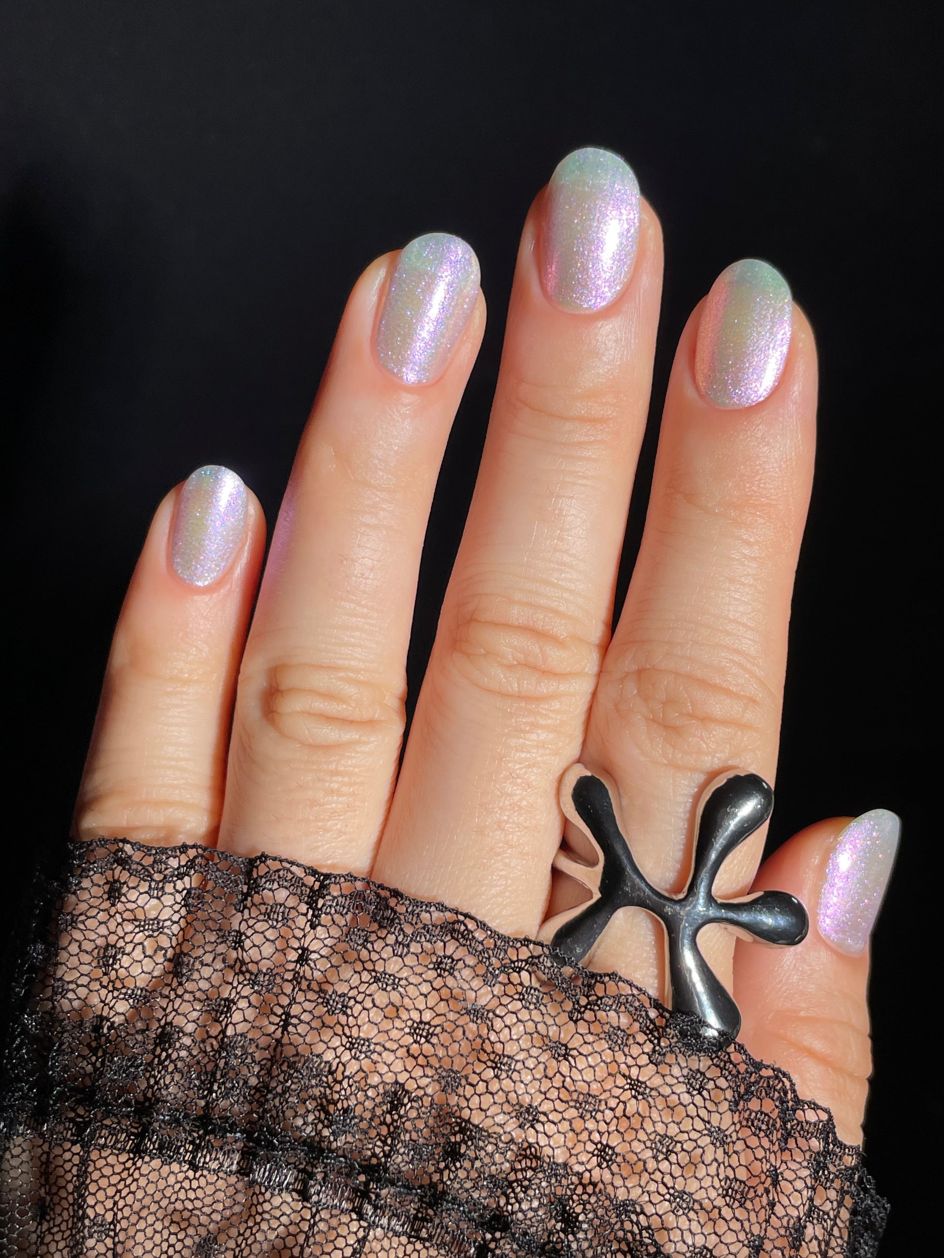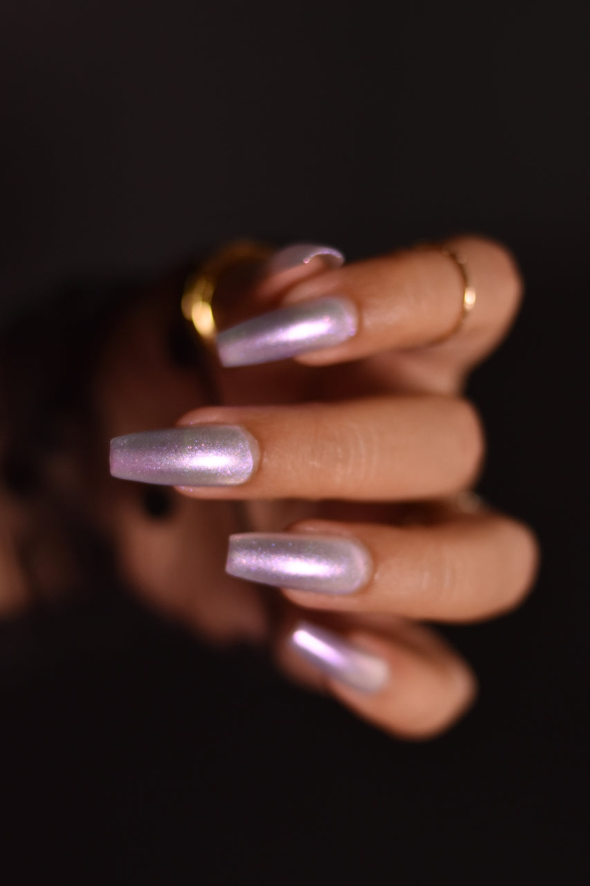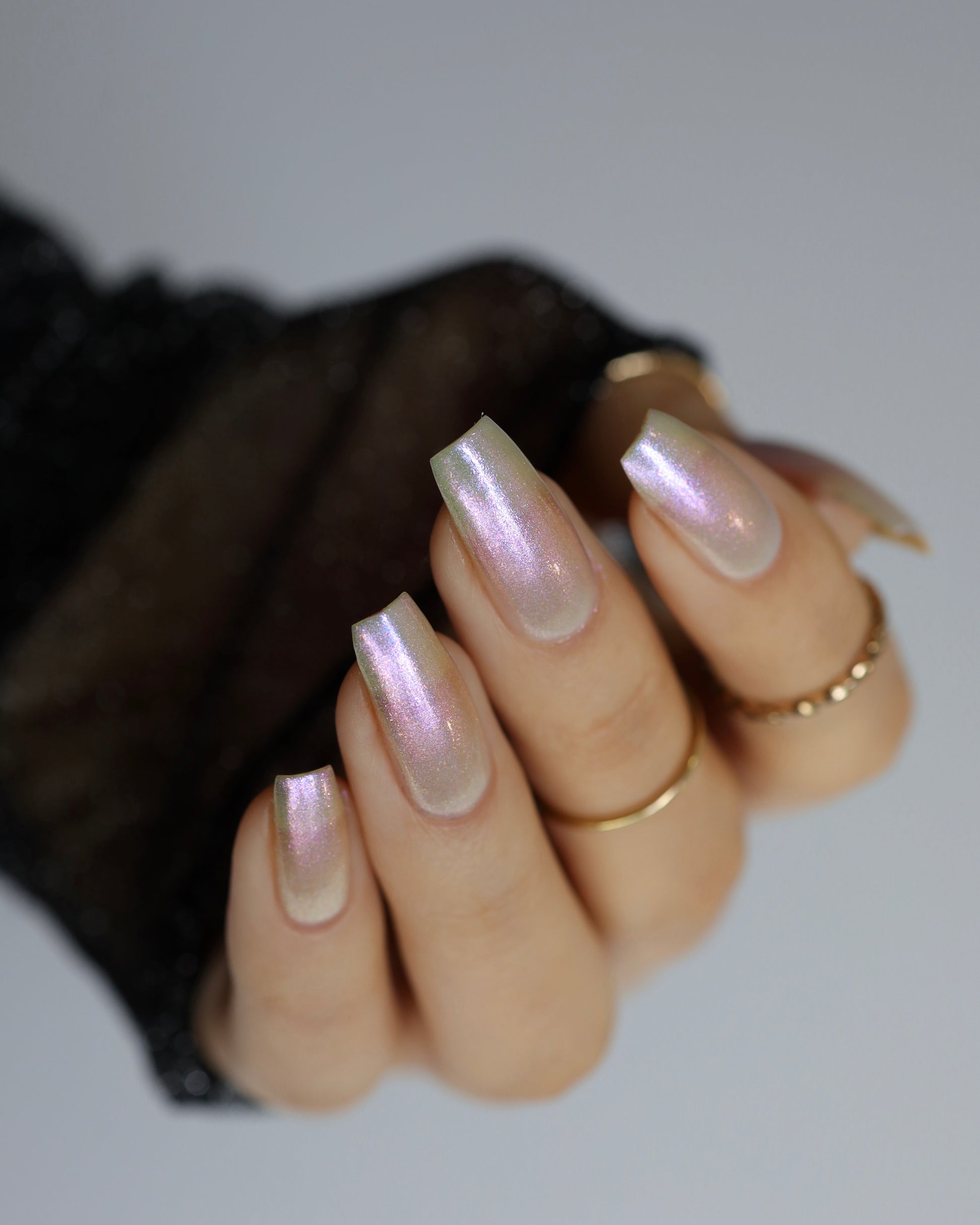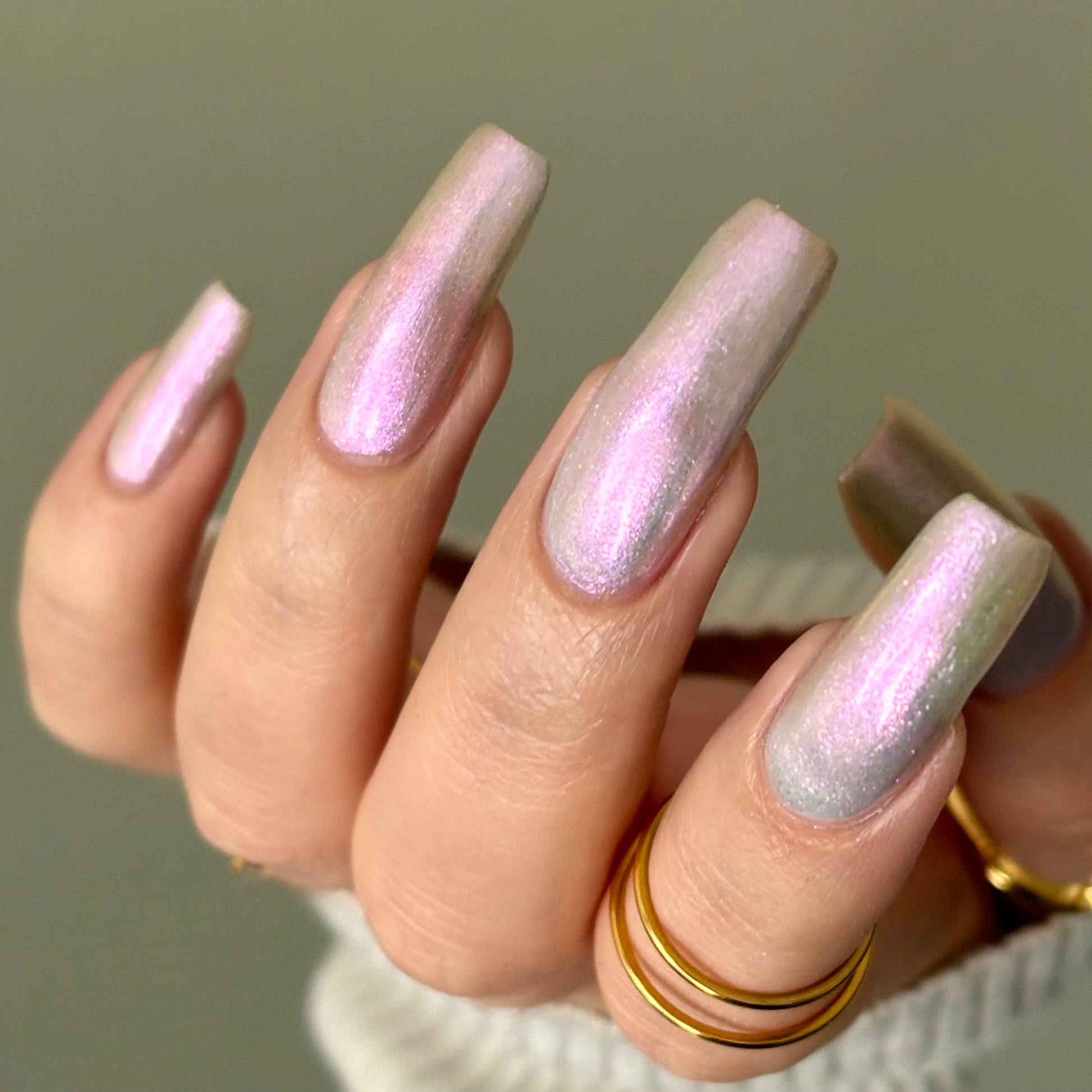 Skelly Bones is a sheer ghostly white brought back to life with glowing pink and purple shimmers. Pink Hair Strands has been resurrected from the dead. This shade carries a playful yet spooky energy that’s perfect for Halloween. Softly eerie and hauntingly beautiful, it layers like a spectral veil, giving your nails an otherworldly glow.