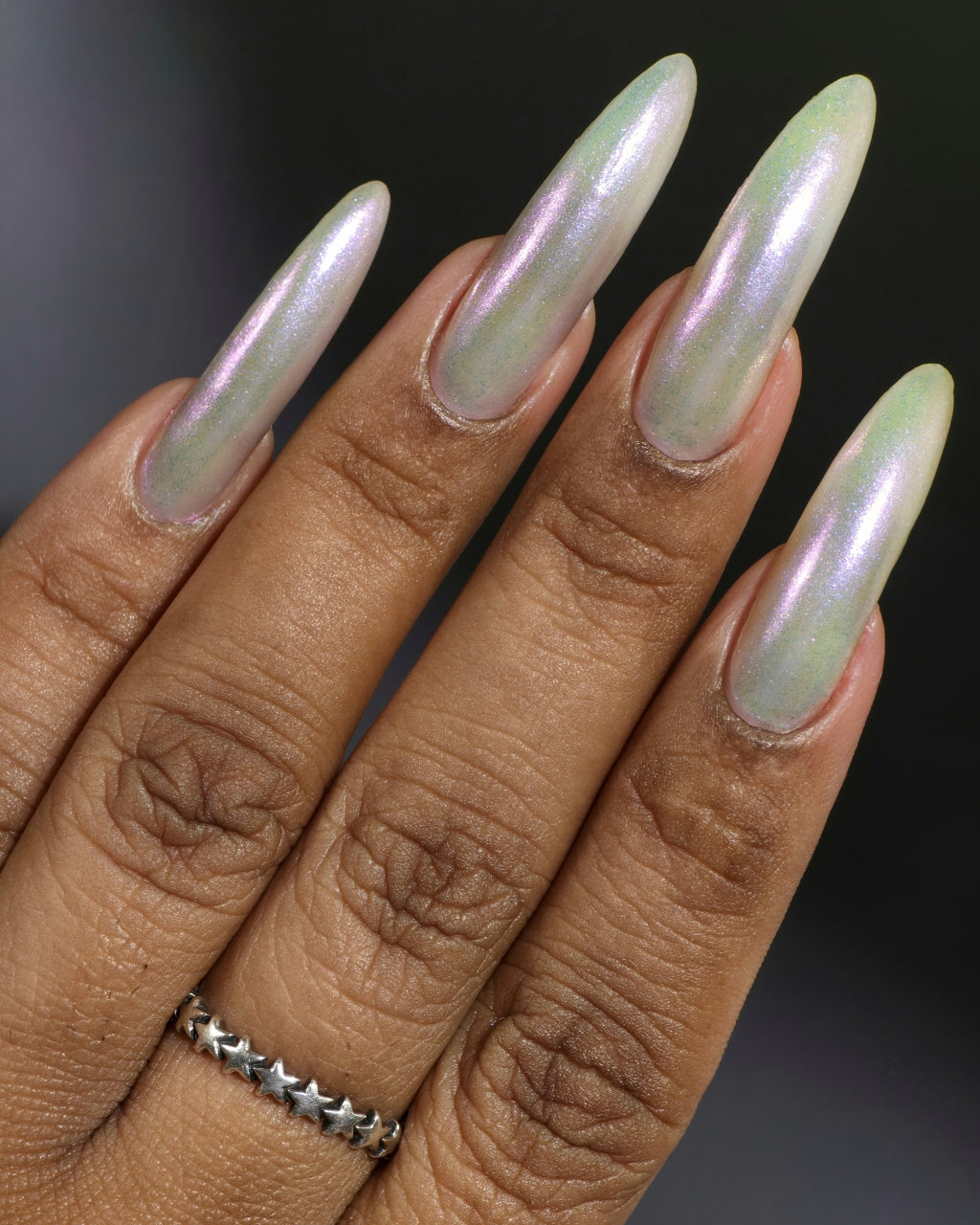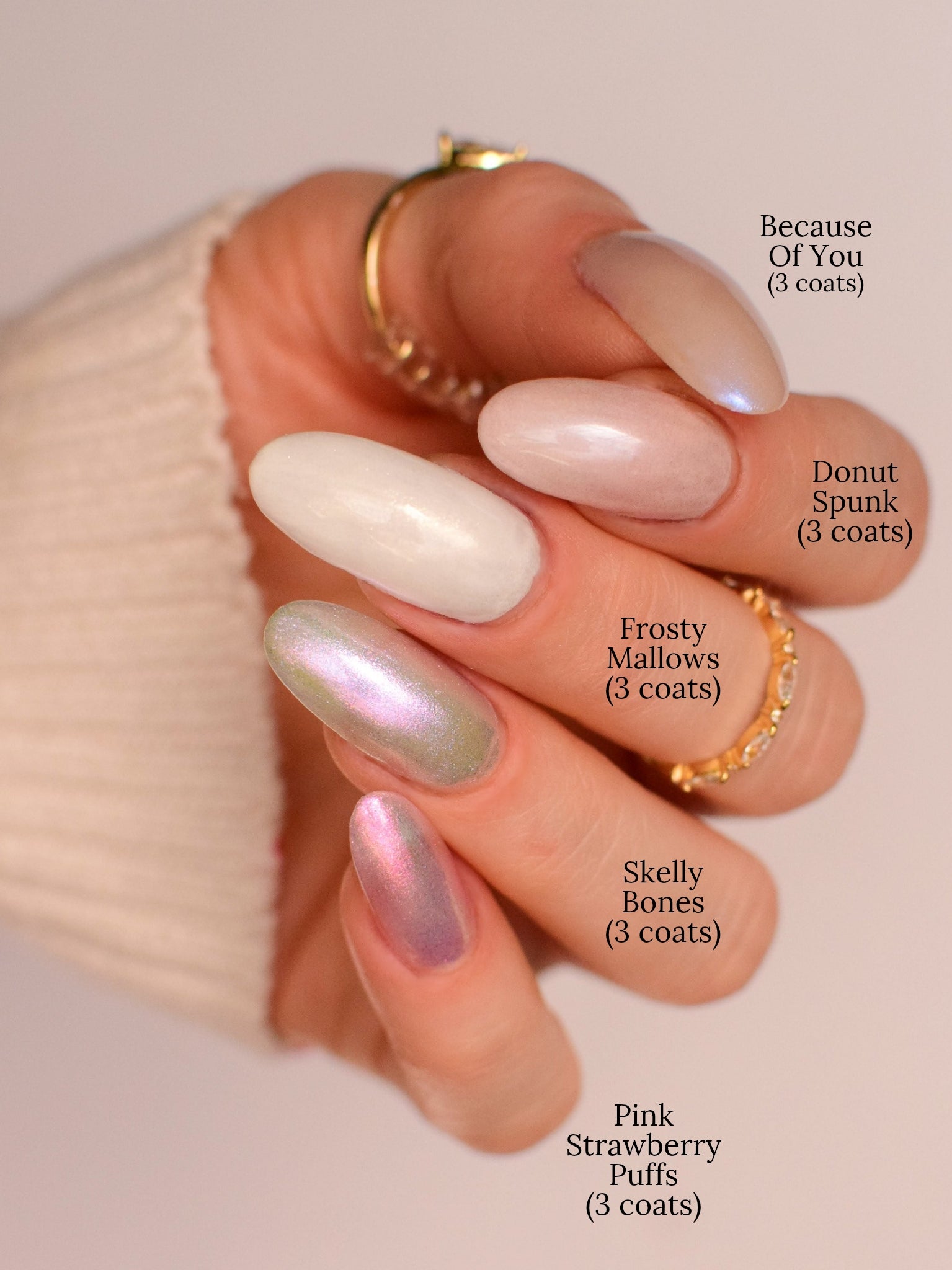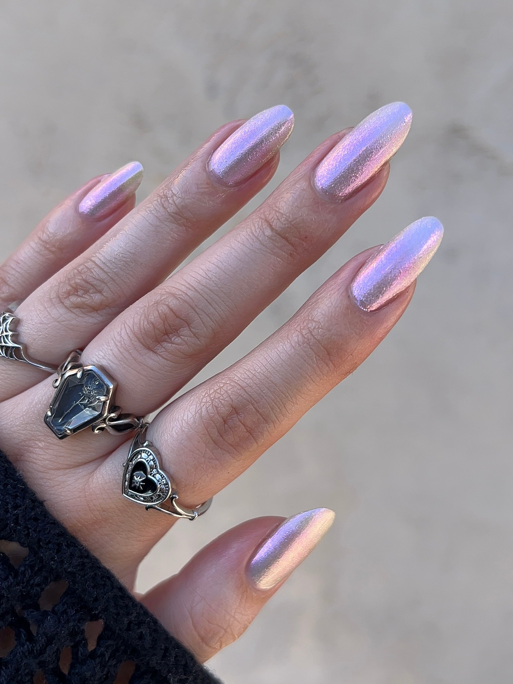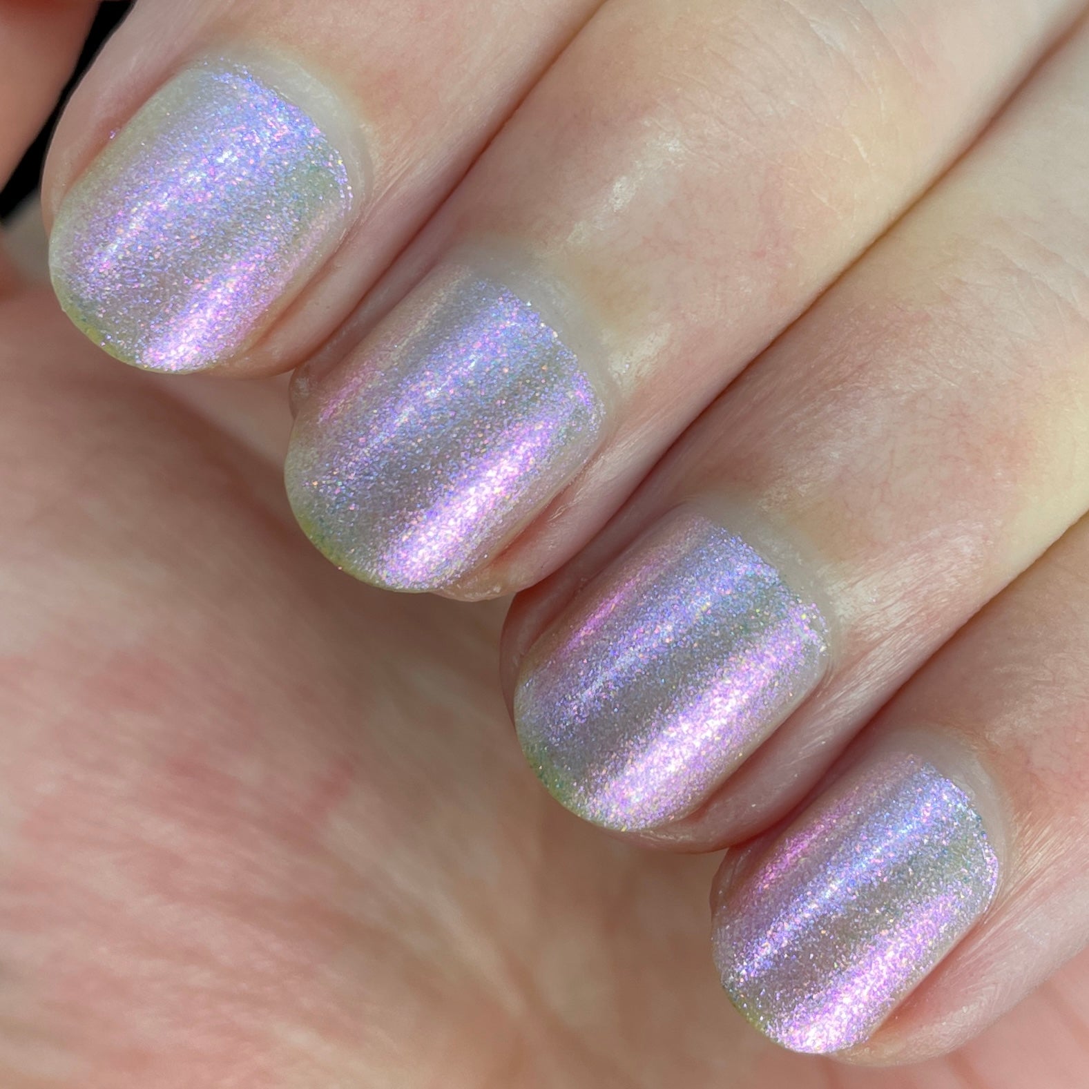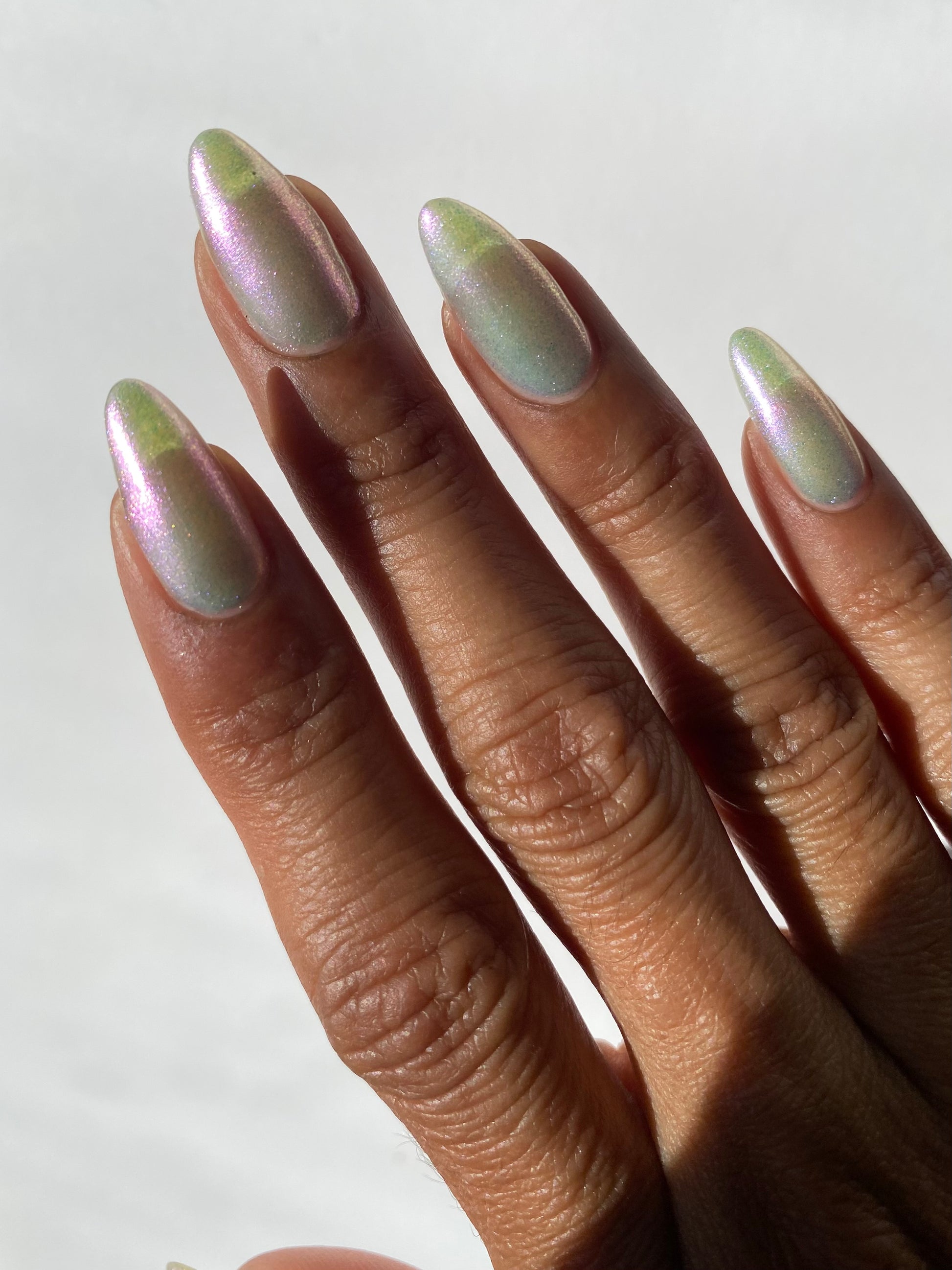 Skelly Bones is a sheer ghostly white brought back to life with glowing pink and purple shimmers. Pink Hair Strands has been resurrected from the dead. This shade carries a playful yet spooky energy that’s perfect for Halloween. Softly eerie and hauntingly beautiful, it layers like a spectral veil, giving your nails an otherworldly glow.