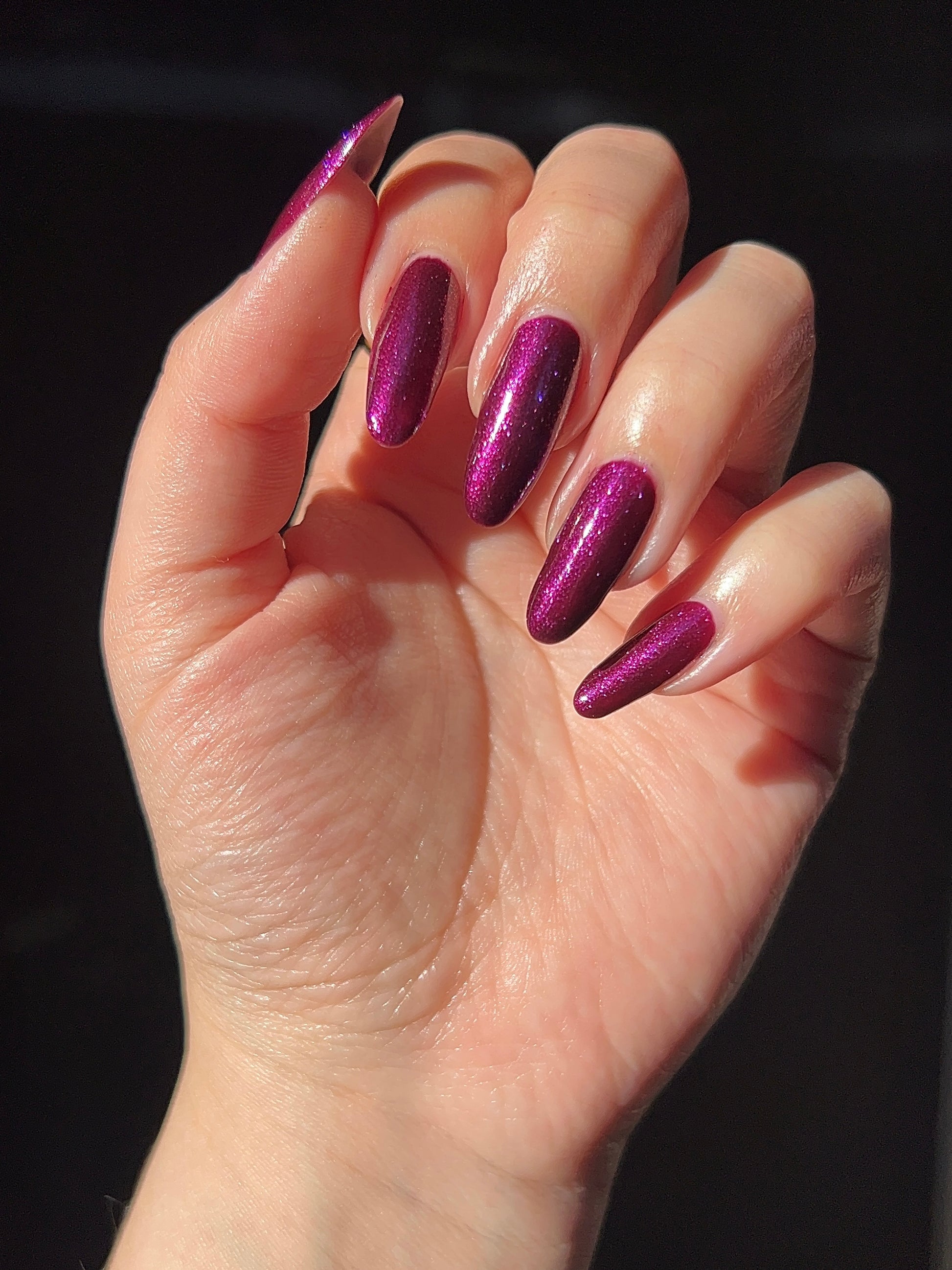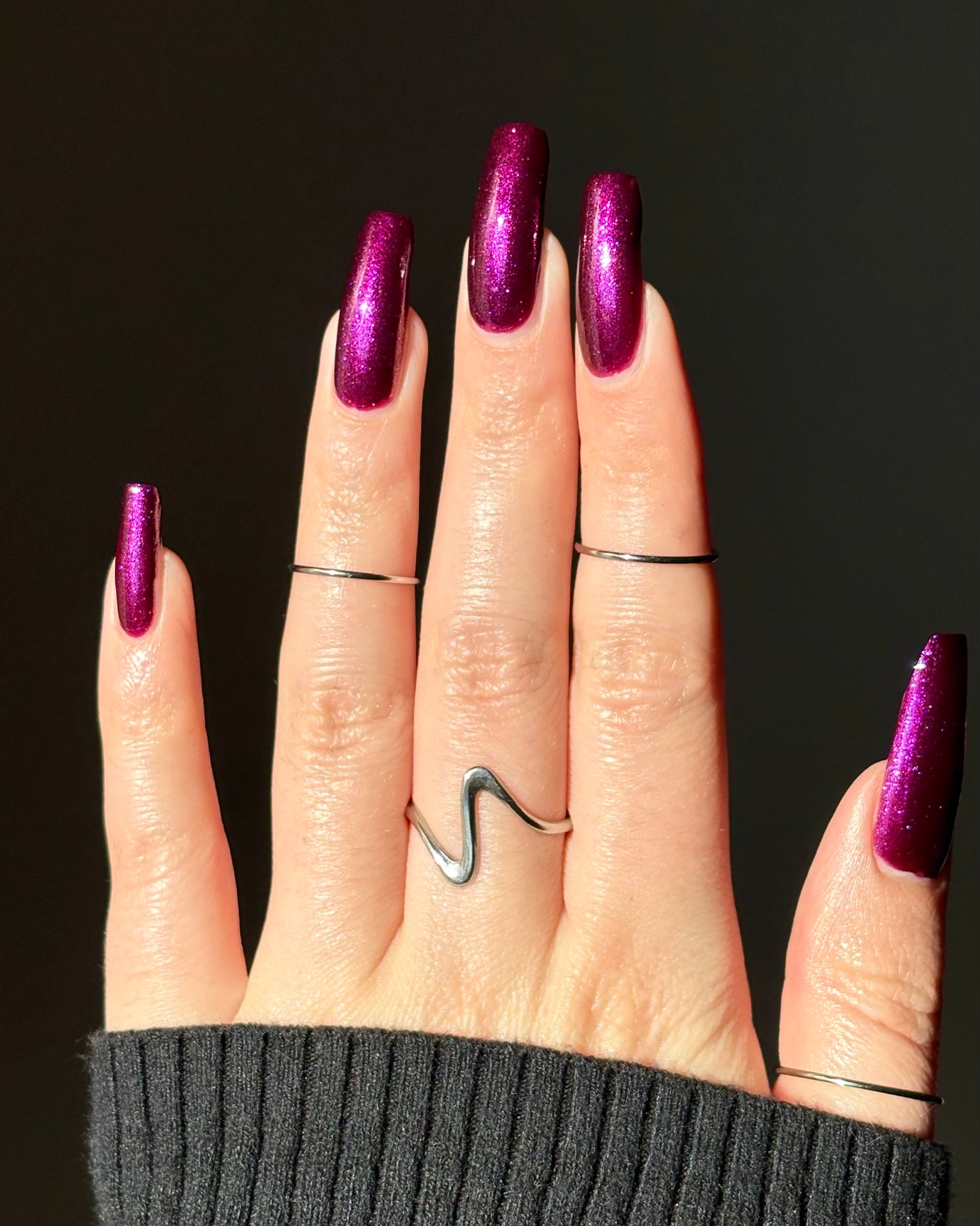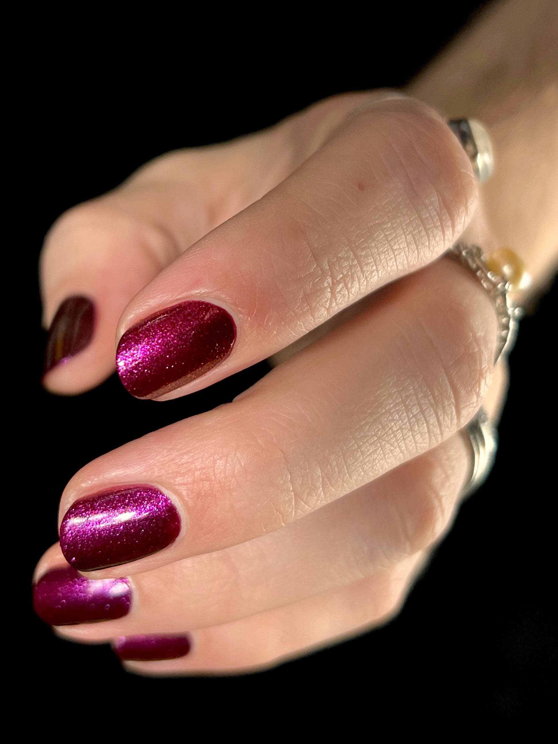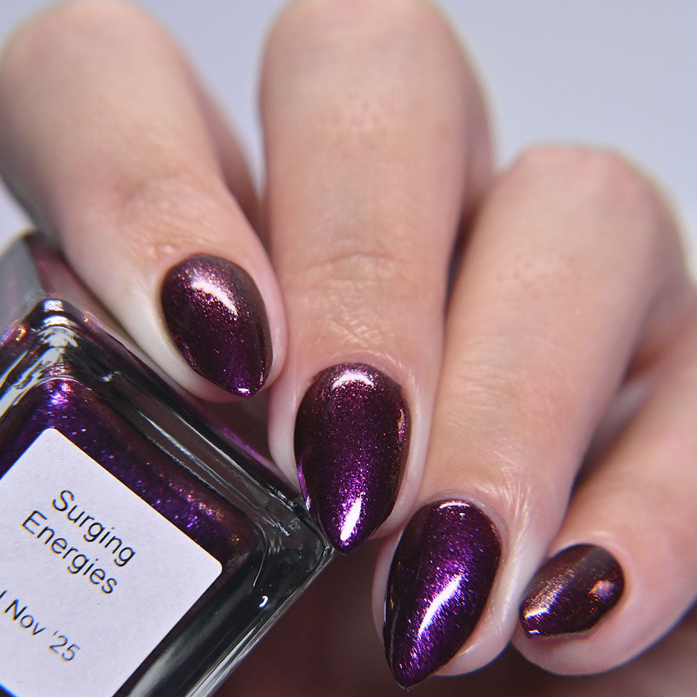 Dive into your feelings with Surging Energies, a deep magenta-purple polish that radiates passion in a glass bottle. This shade is shimmering with purple and soft pink glimmers, this shade captures the intensity of shifting moods during the winter season. Bold and perfect for the PPU Mood Rings and Emotions theme, it’s a great polish for when your inner world is bursting with energy and expression.