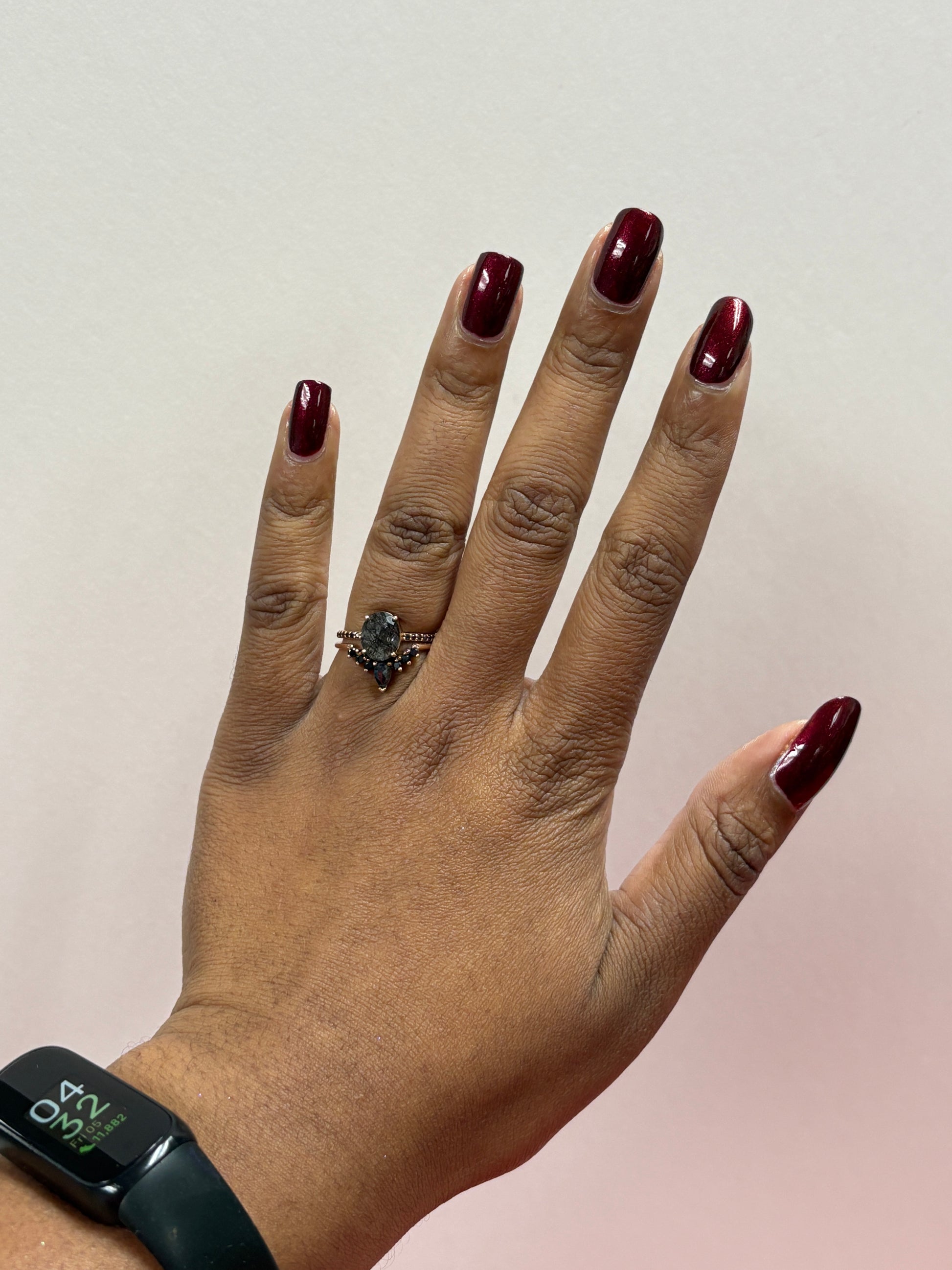Butyl Acetate, Ethyl Acetate, Nitrocellulose, Acetyl Tributyl Citrate, Isobutyl Acetate, Isopropyl Alcohol, Adipic Acid/Neopentyl Glycol/Trimellitic Anhydride Copolymer, Silica, Styrene/Acrylates Copolymer, N-Butyl Alcohol, Benzophenone-1, Violet 2, Trimethylpentanediyl Dibenzoate Black Iron Oxide, D&C Red #6 Barium Lake