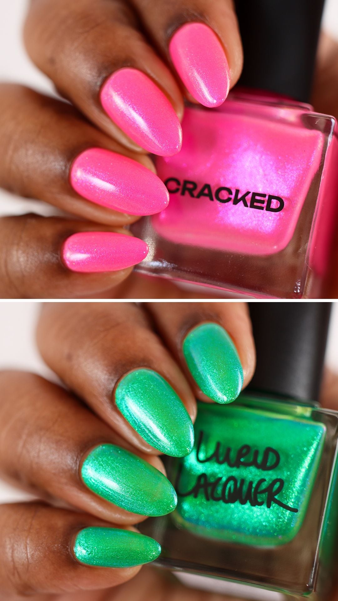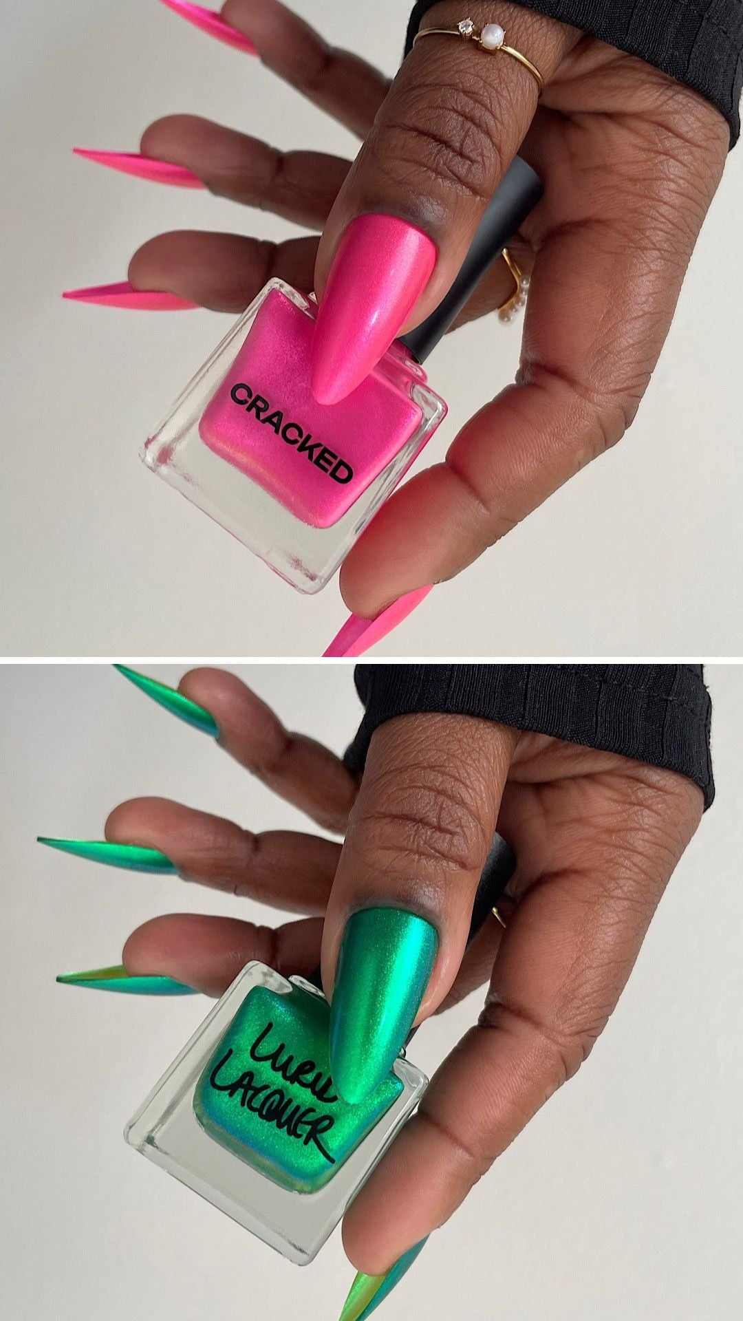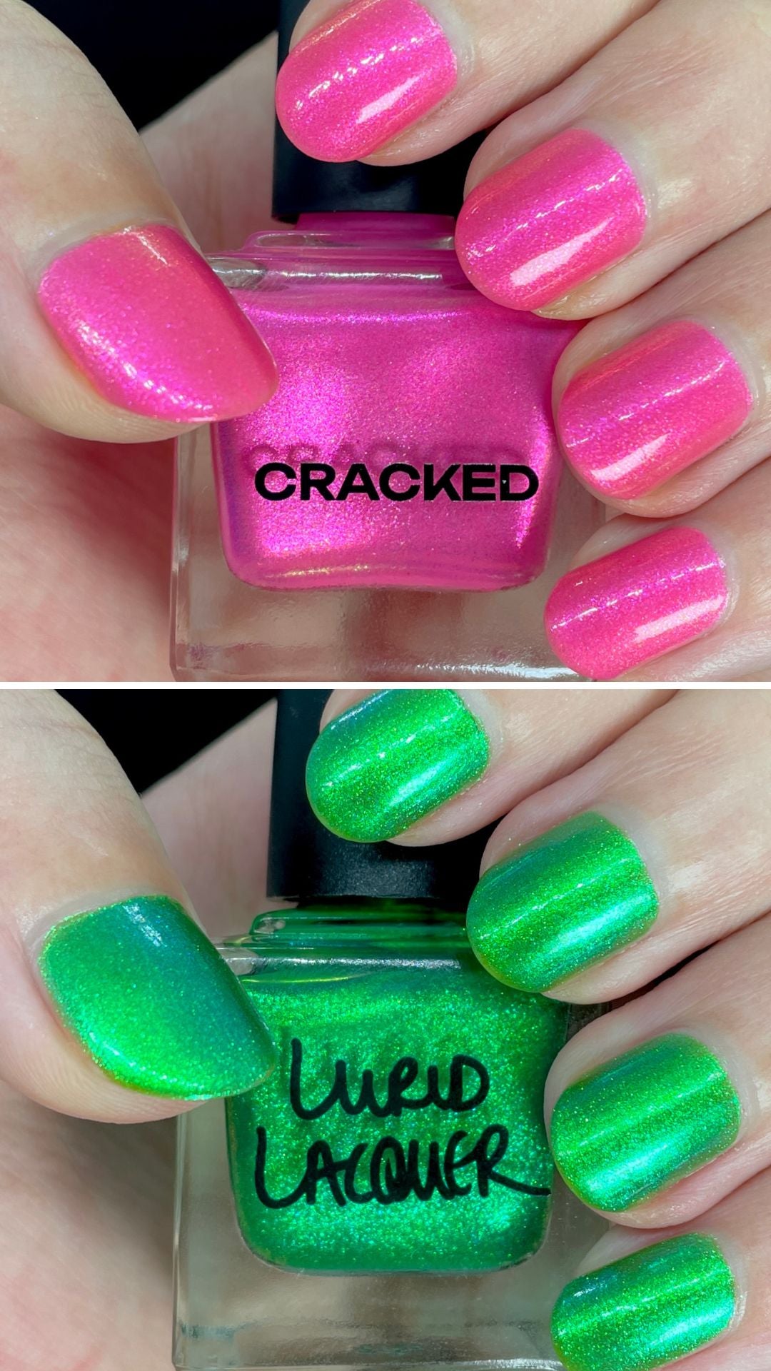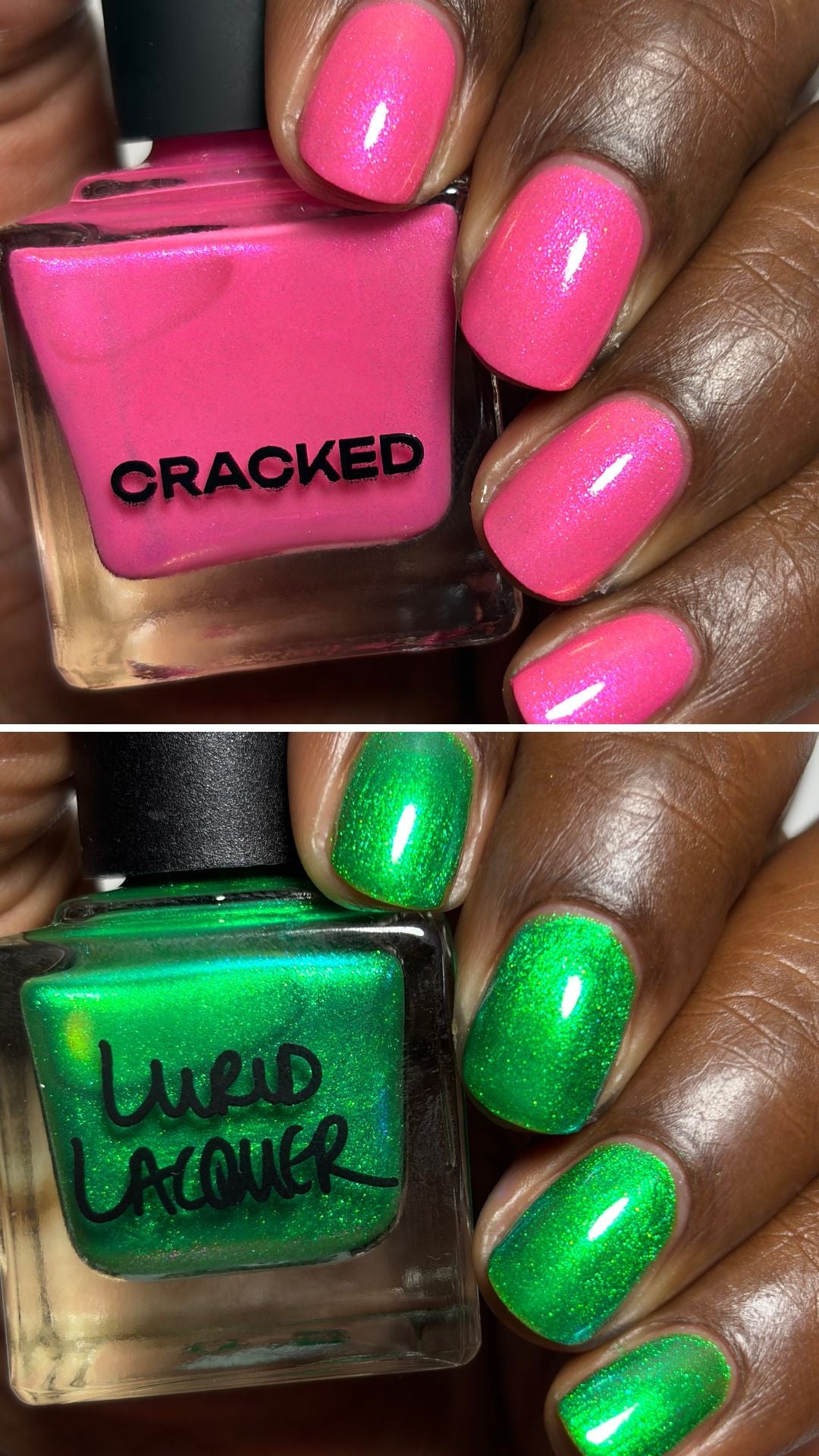 Get ready for the ultimate summer thirst trap. Cracked Polish and Lurid Lacquer have come together again for Watermelon Halves: a juicy, limited-edition duo made to turn heads and tempt hands. One half is a mouthwatering shimmering pink that drips with playful sparkle, the other a bold, eye-striking green that demands attention. Together, they’re ripe, refreshingly expected seeing as we both love to create green and pink colors. Launching this summer and going fast because good fruit doesn’t last forever.